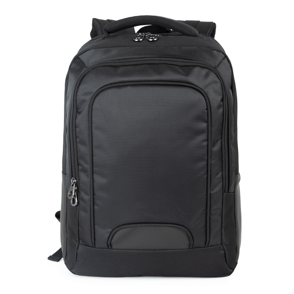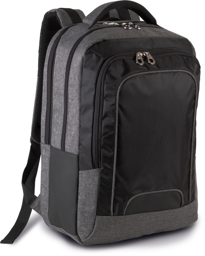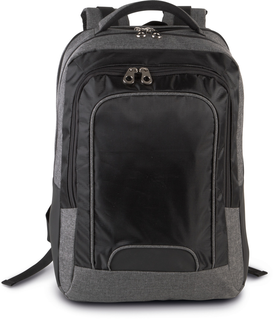 Mochila em poliéster 600D com detalhes em contraste em poliéster Dobby. Compartimento triplo com fecho para computador até 15”. Pega superior, costas e alças acolchoadas. Costas com encaixe para fixação a um trolley.