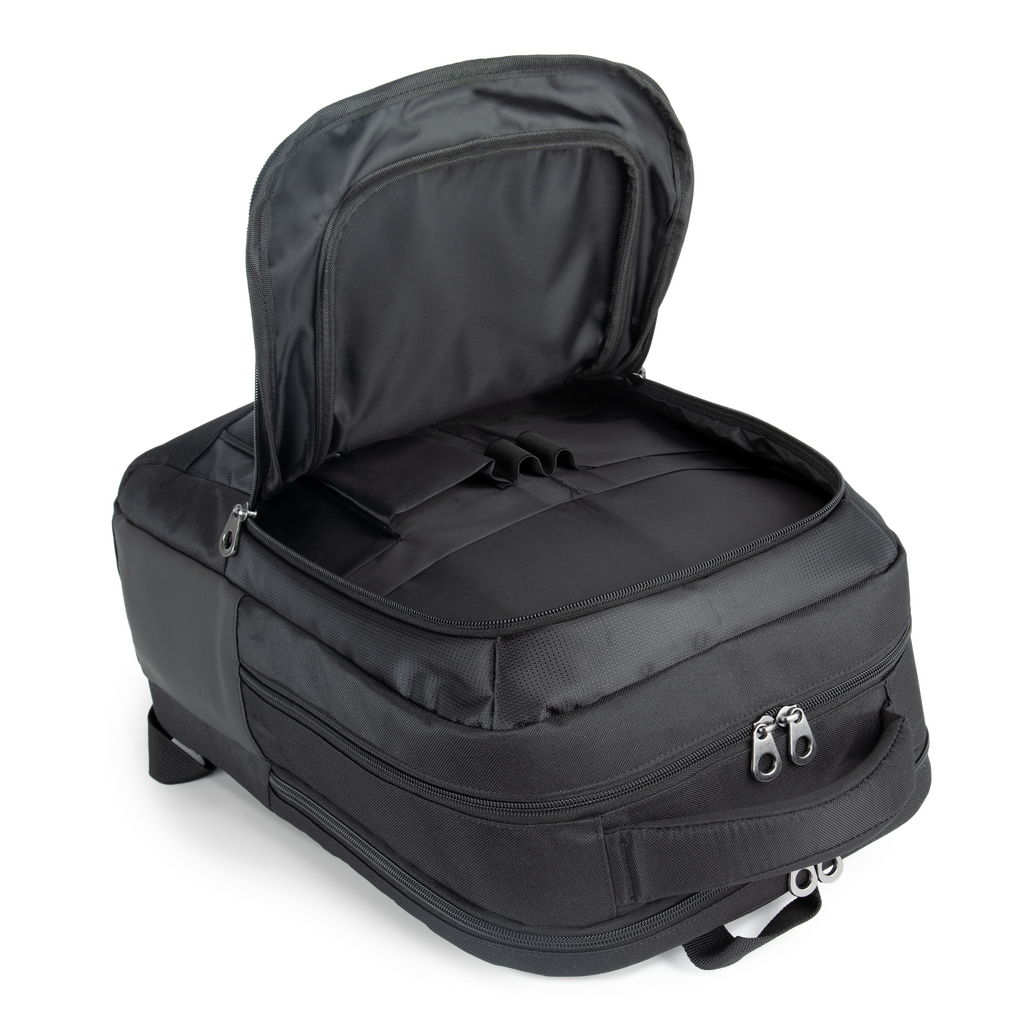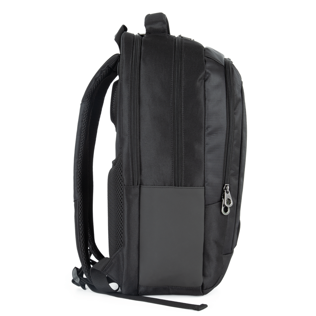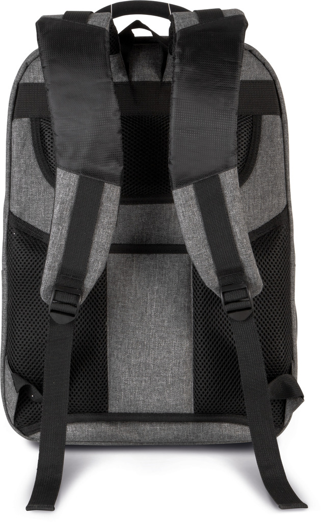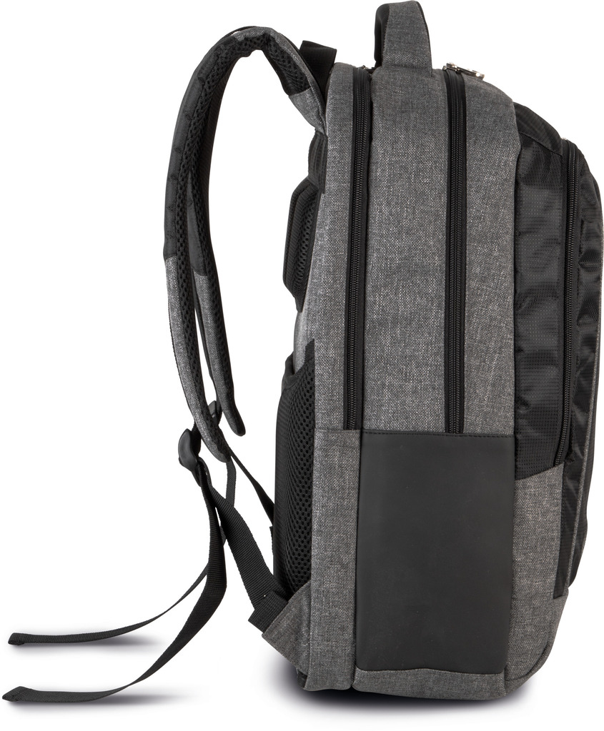 Mochila em poliéster 600D com detalhes em contraste em poliéster Dobby. Compartimento triplo com fecho para computador até 15”. Pega superior, costas e alças acolchoadas. Costas com encaixe para fixação a um trolley.