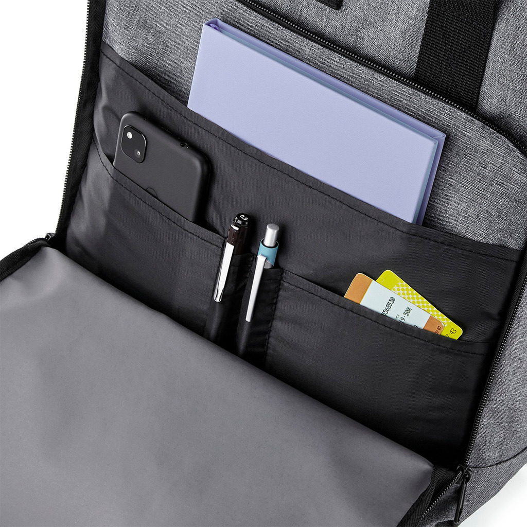 100% poliéster. 300D poliéster reciclado em 100% PET, equivalente a cerca de 12 garrafas pós-consumo. CompatÃvel com os computadores portáteis até 15,6”. Compartimento acolchoado seguro para o computador portátil com acesso exterior. Bolso frontal com secção organiser. Bolso frontal concebido para uma personalização fácil. Bolso exterior para garrafa. Bolso interior com fecho. Costas acolchoadas. Com sistema de fecho que enrola. Alças acolchoadas ajustáveis. Pega em tecido. Etiqueta amovÃvel TearAway, fácil de reetiquetar.