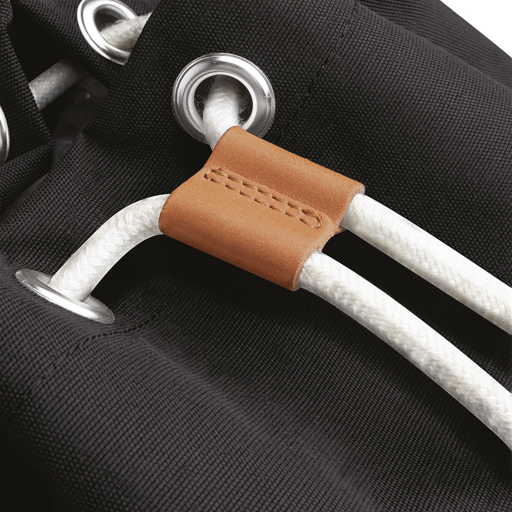 100% malha de algodão, parte traseira acolchoada e fundo reforçado, compartimento acolchoado para computador portátil até 14″, detalhes em poliuretano e metal, fecho com cordão comprido, alças a tiracolo acolchoadas ajustáveis, pega de transporte. Etiqueta Tearaway para facilitar a mudança de marca.