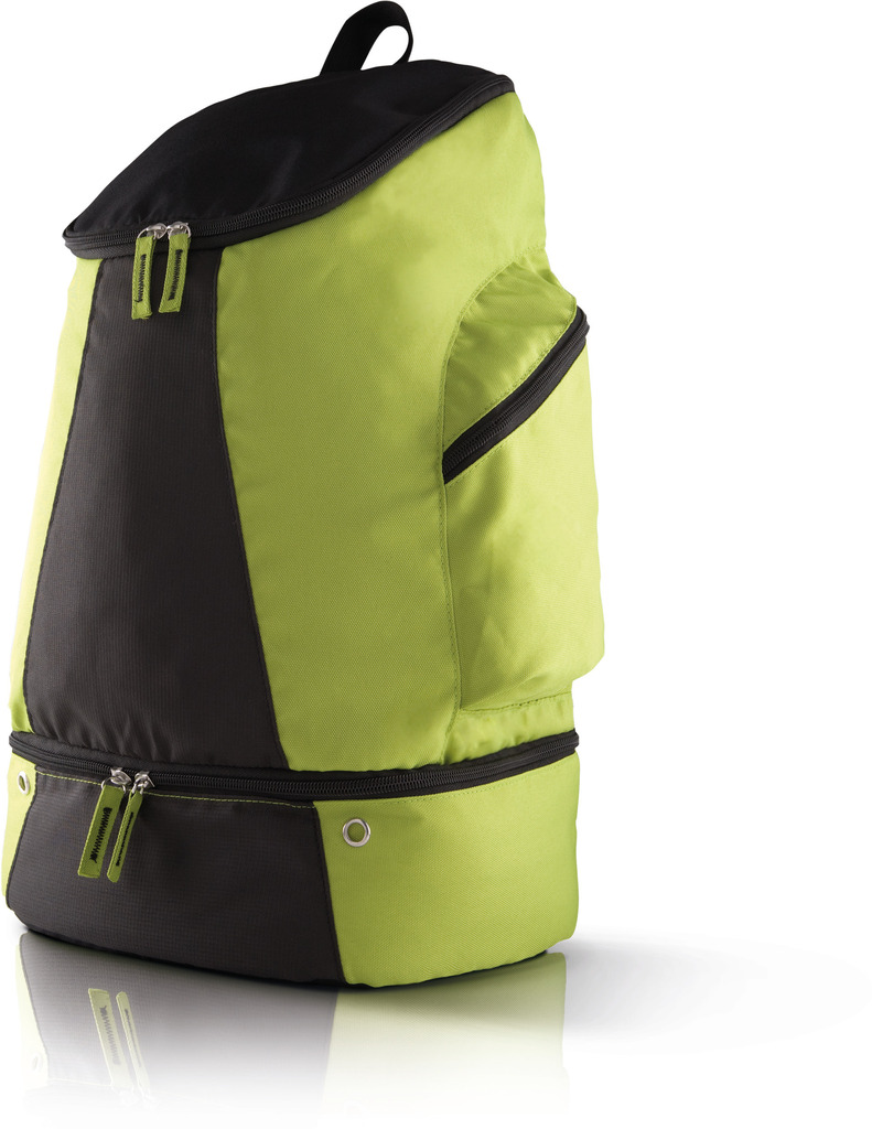 Mochila em poliéster 600D e Ripstop 300D, compartimento principal e compartimento para sapatos com ilhós, bolsos laterais, alças ajustáveis e acolchoadas em material respirável.
