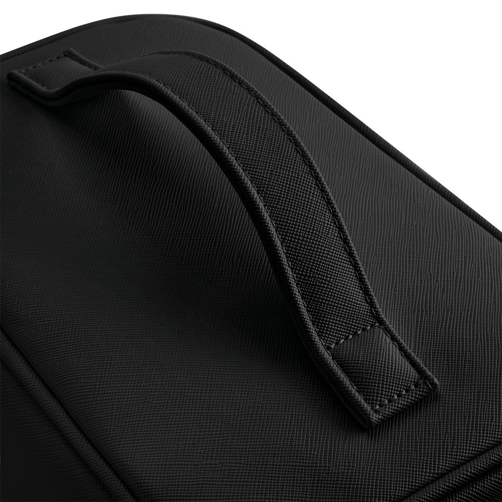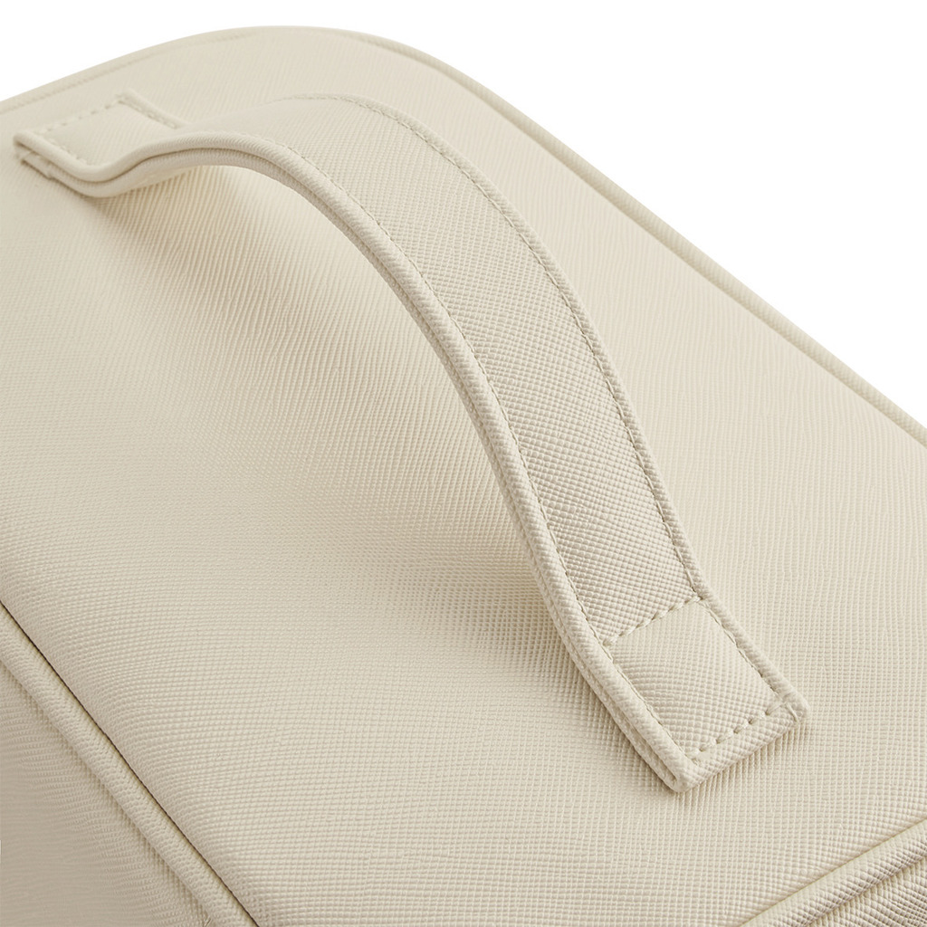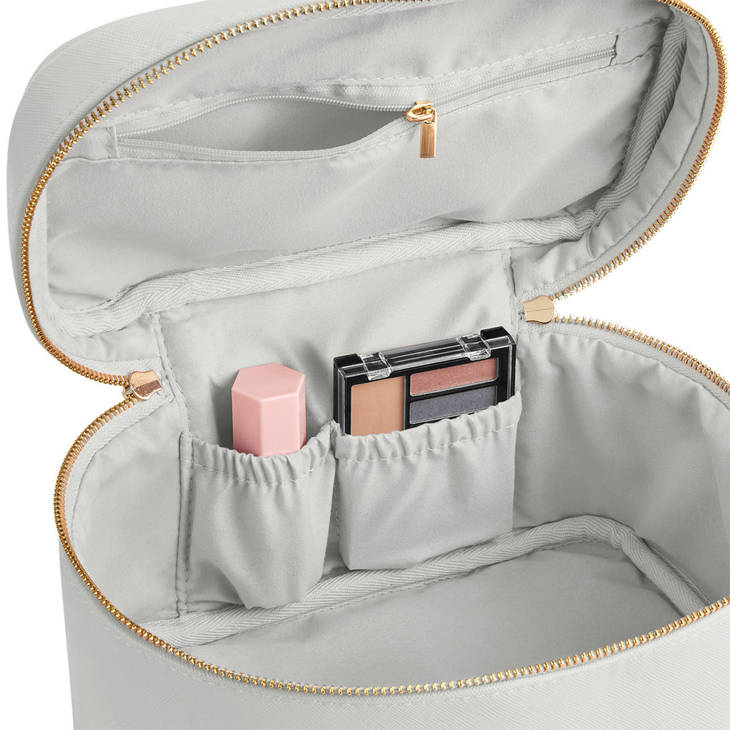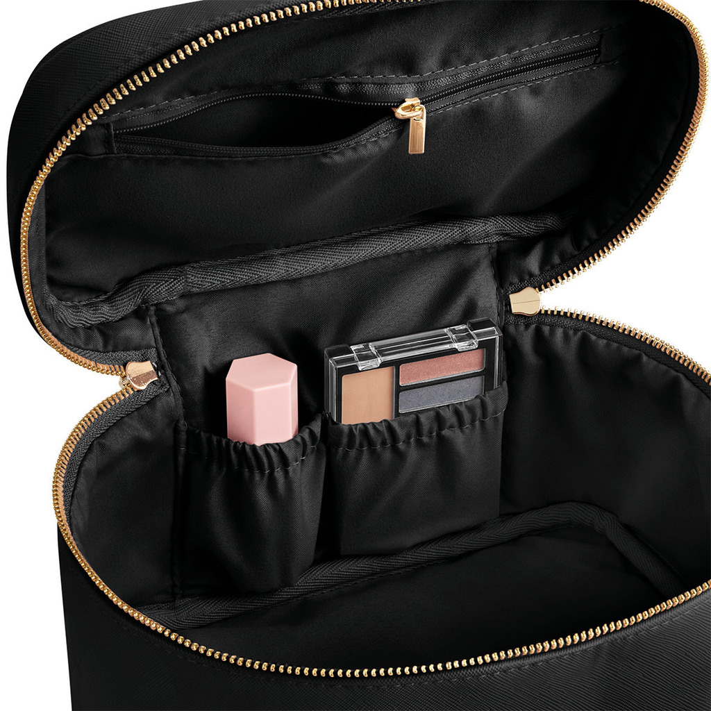 100% tipo couro em poliuretano, couro saffiano de grão fino. Nécessaire multiusos. Compartimento principal e bolso interior com fecho, estojo interior com fecho e forro com toque suave. Fecho em metal dourado brilhante, pega no mesmo tecido. Etiqueta amovÃvel TearAway para facilitar a personalização.