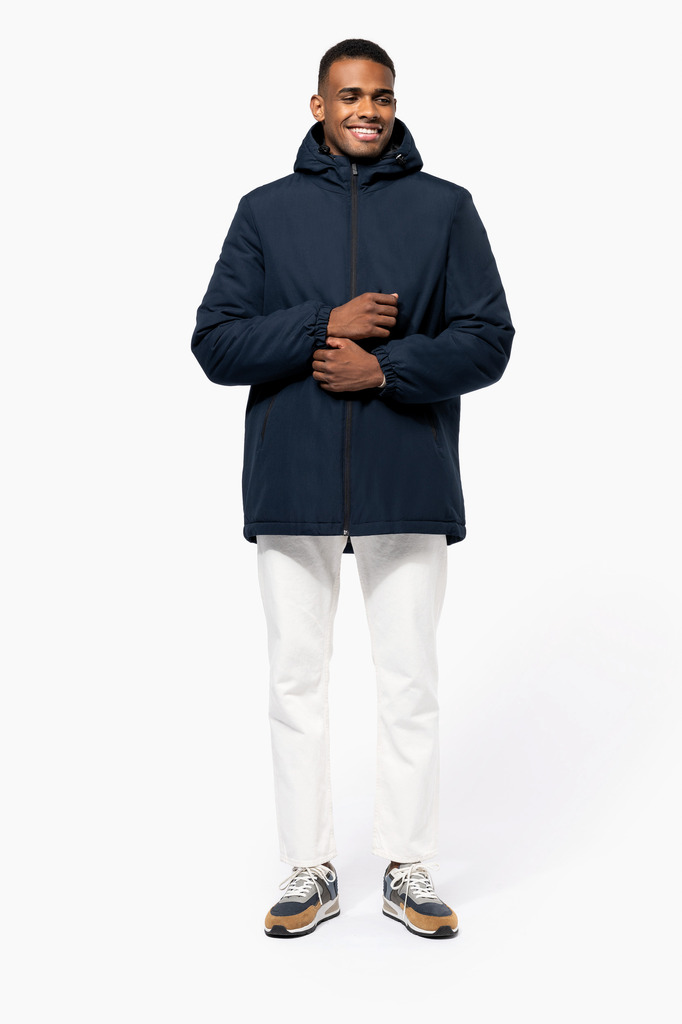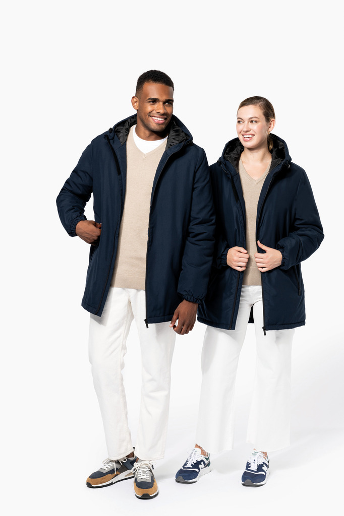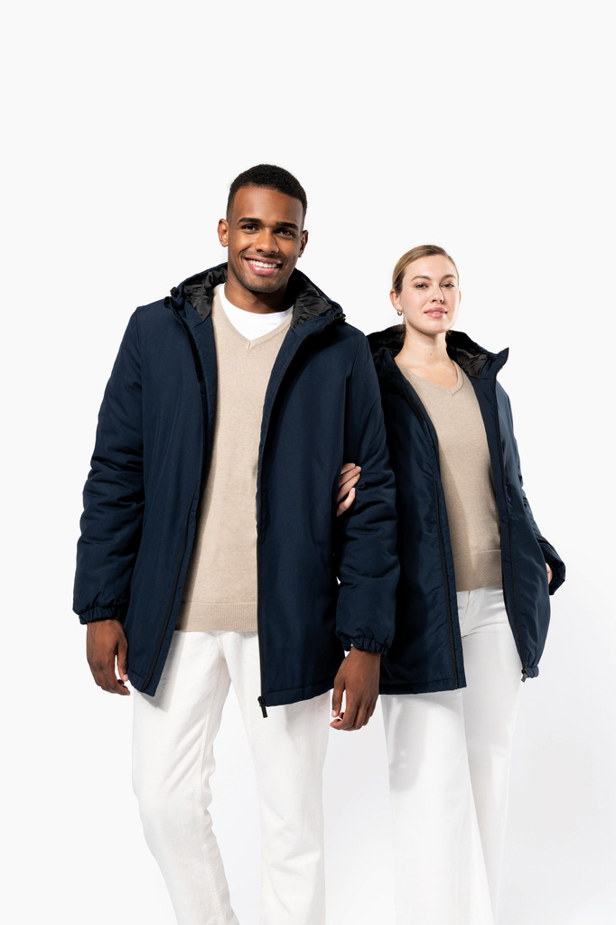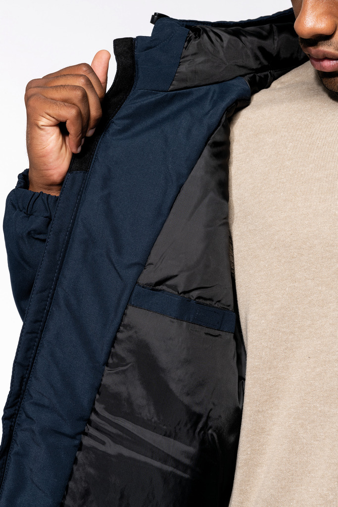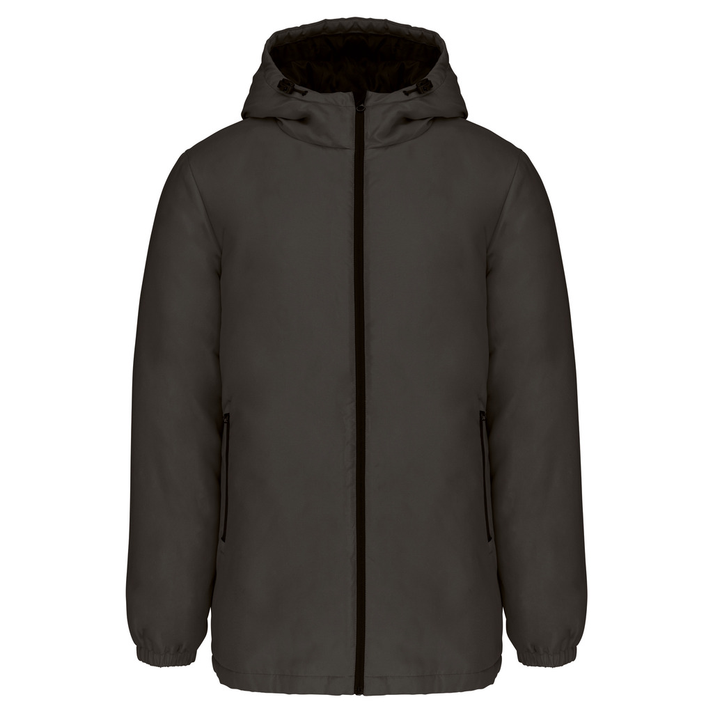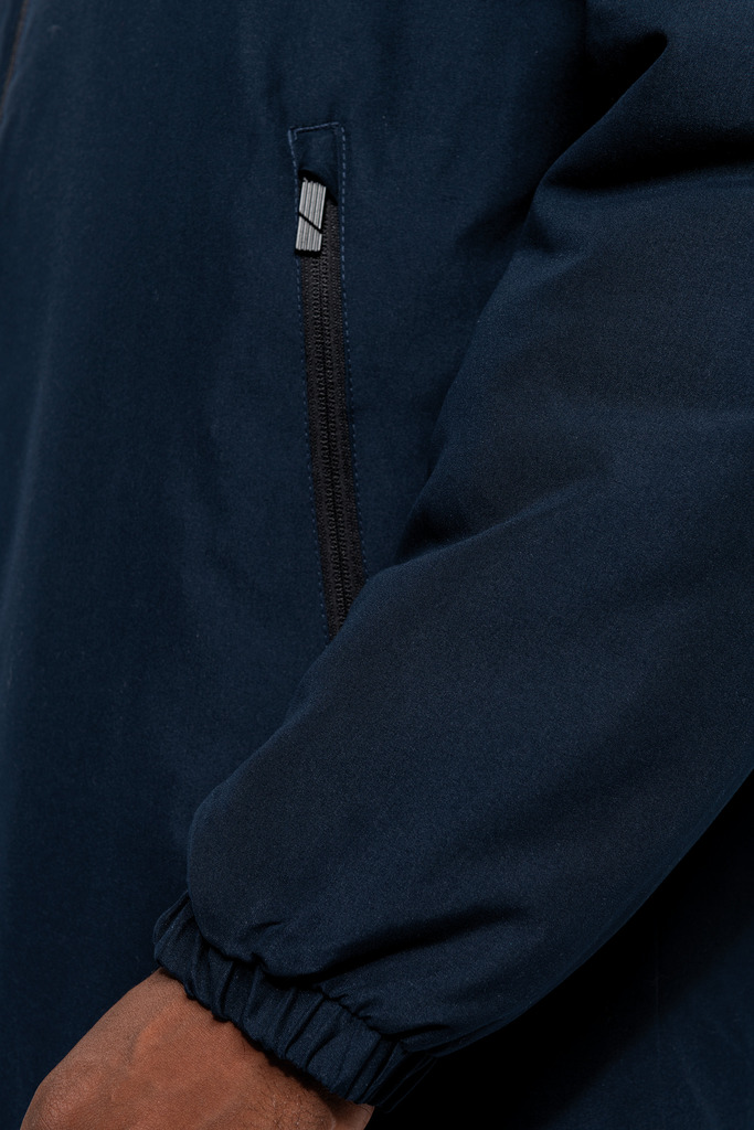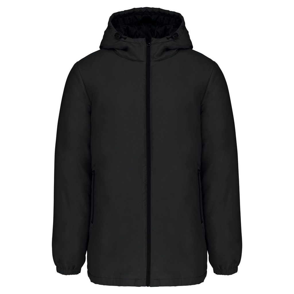 100% poliéster reciclado pós-consumo. Tecido repelente à água. Acabamento com toque de pele de pêssego para maior suavidade. Forro em poliéster taffeta 210T preto. Interior acolchoado em 100% poliéster. Corte confortável. Com fecho em nylon e puxador metálico. Capuz com 3 painéis forrado em poliéster com cordão de ajuste e stoppers. 2 bolsos frontais com fecho. 1 bolso interior com fecho em velcro. Acabamento das mangas elástico. Mais comprido nas costas para maior conforto. Patch em tecido interior na gola para personalização. Fecho invisÃvel do lado esquerdo e na parte inferior de acesso para personalização. Sem etiqueta de marca para facilitar a personalização.