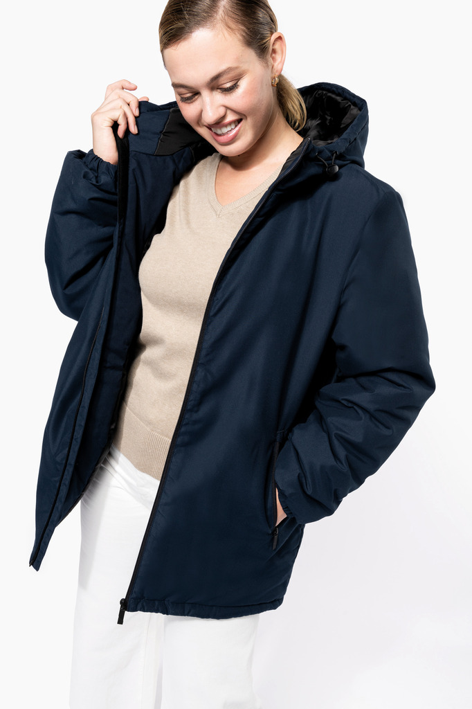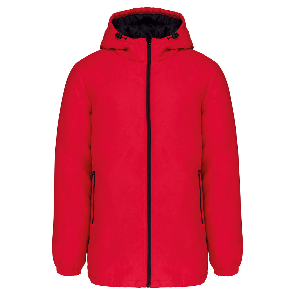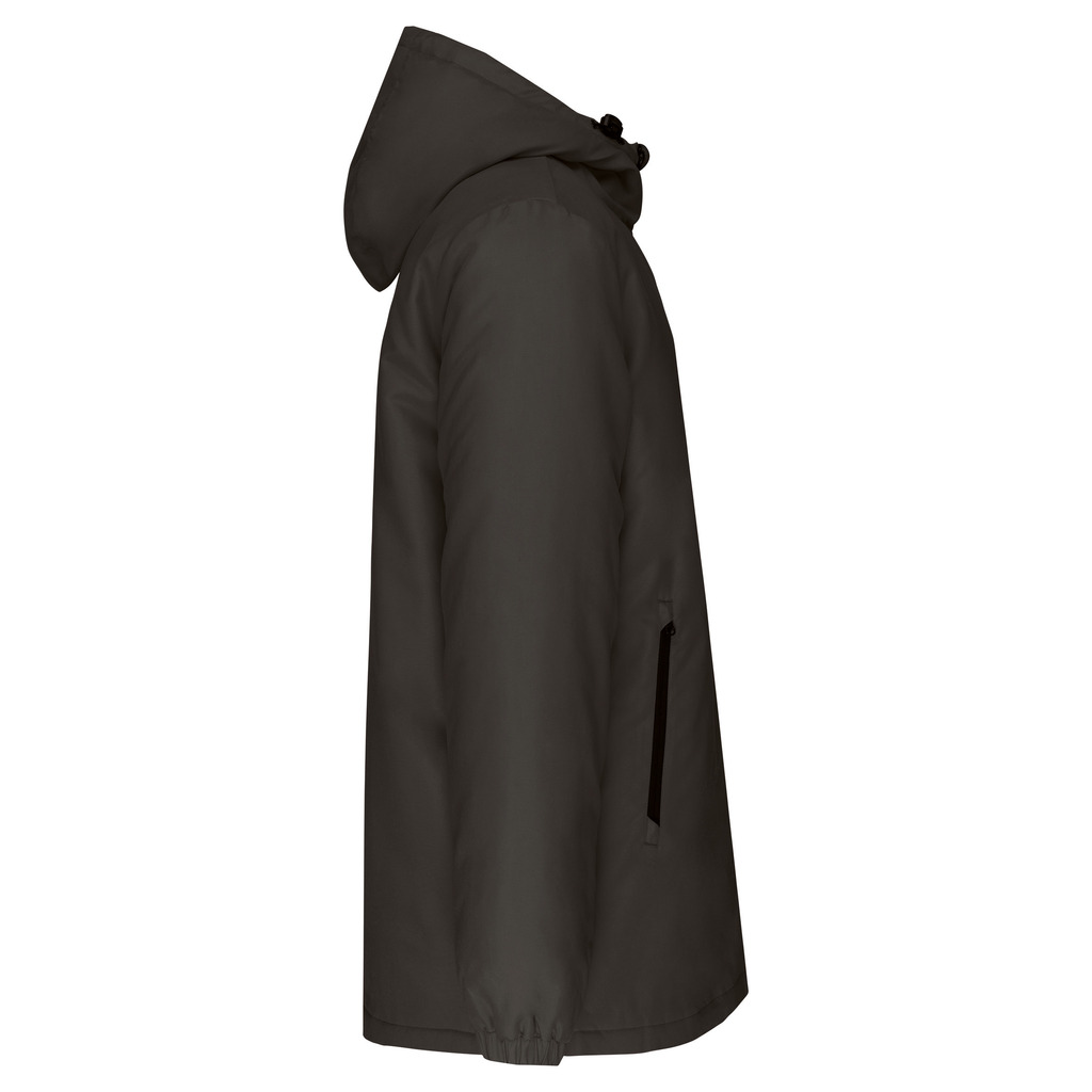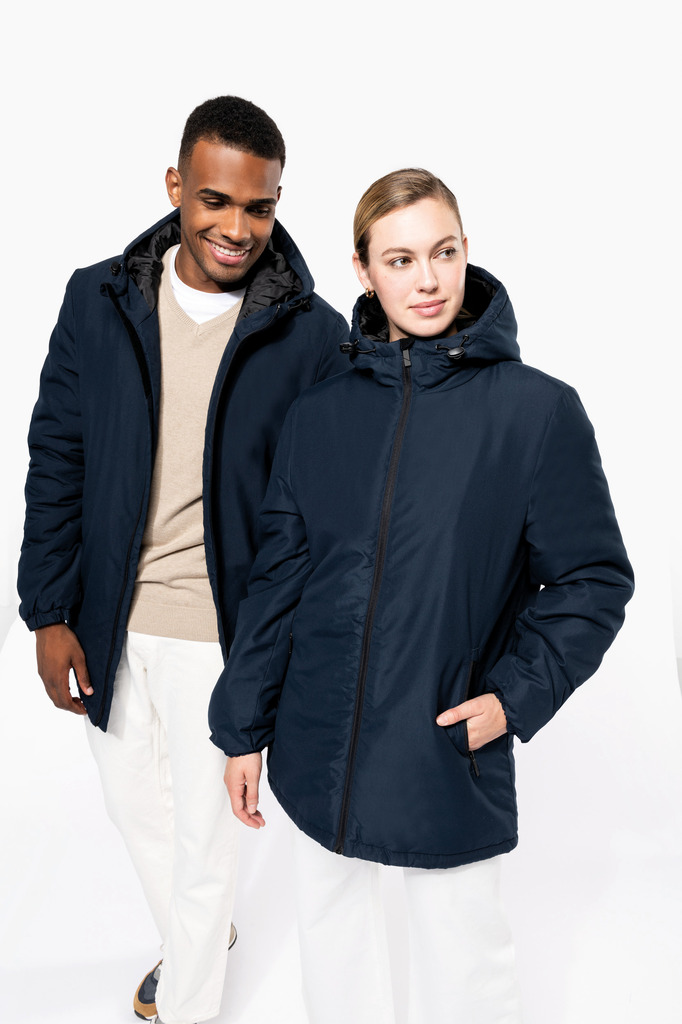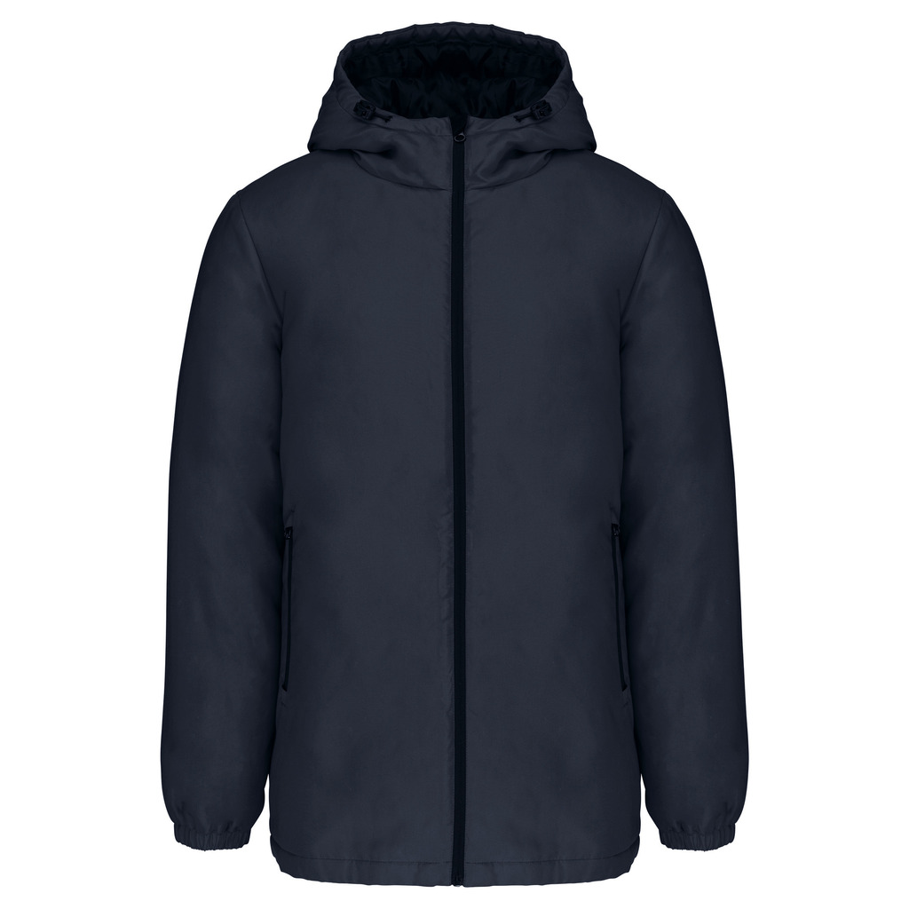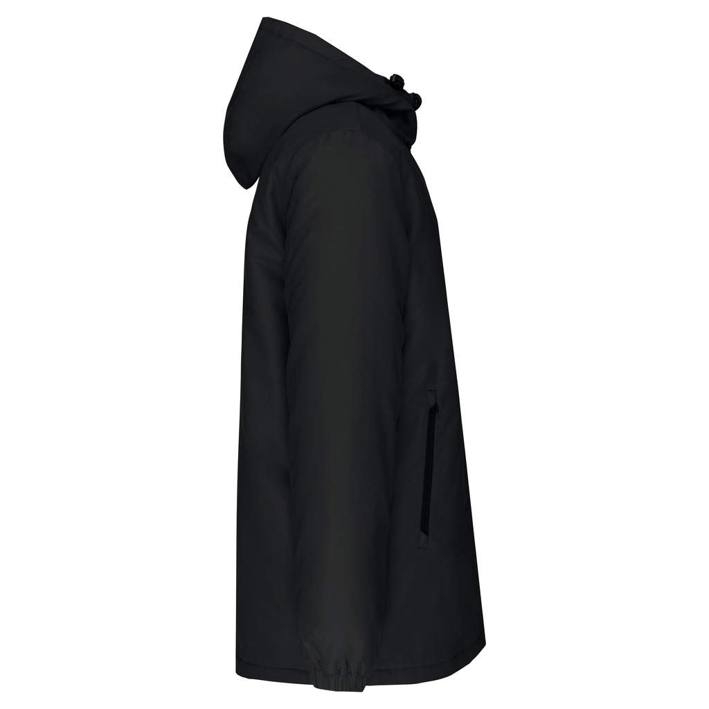 100% poliéster reciclado pós-consumo. Tecido repelente à água. Acabamento com toque de pele de pêssego para maior suavidade. Forro em poliéster taffeta 210T preto. Interior acolchoado em 100% poliéster. Corte confortável. Com fecho em nylon e puxador metálico. Capuz com 3 painéis forrado em poliéster com cordão de ajuste e stoppers. 2 bolsos frontais com fecho. 1 bolso interior com fecho em velcro. Acabamento das mangas elástico. Mais comprido nas costas para maior conforto. Patch em tecido interior na gola para personalização. Fecho invisÃvel do lado esquerdo e na parte inferior de acesso para personalização. Sem etiqueta de marca para facilitar a personalização.