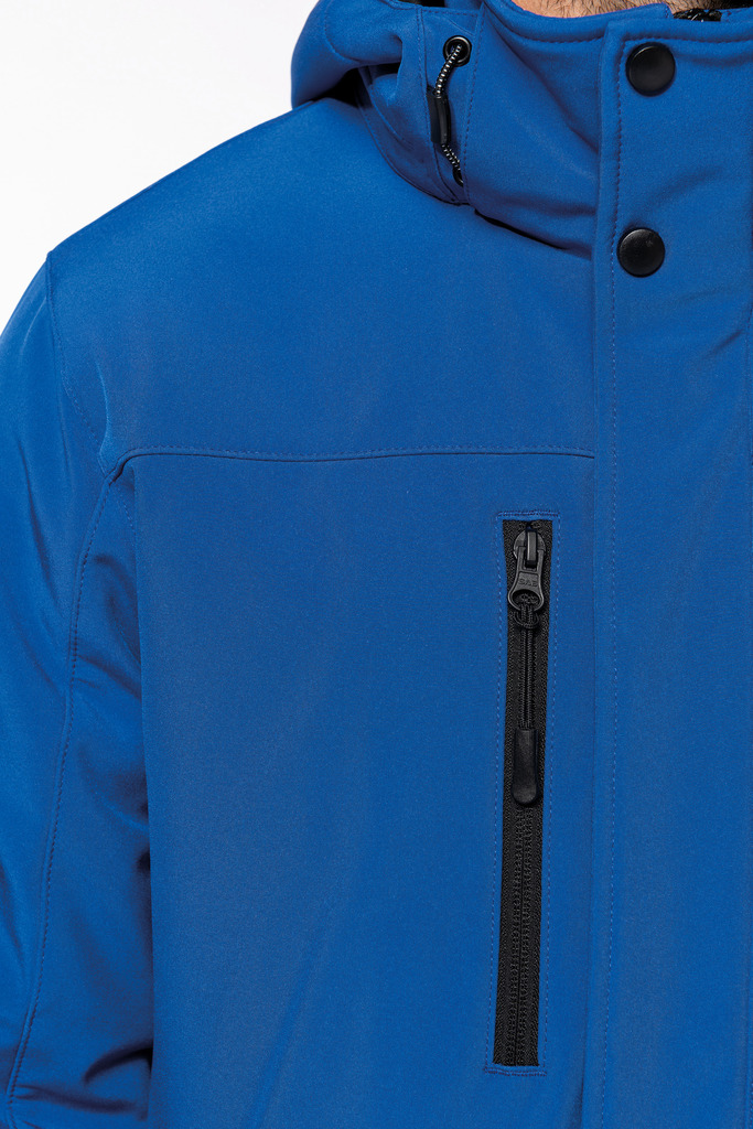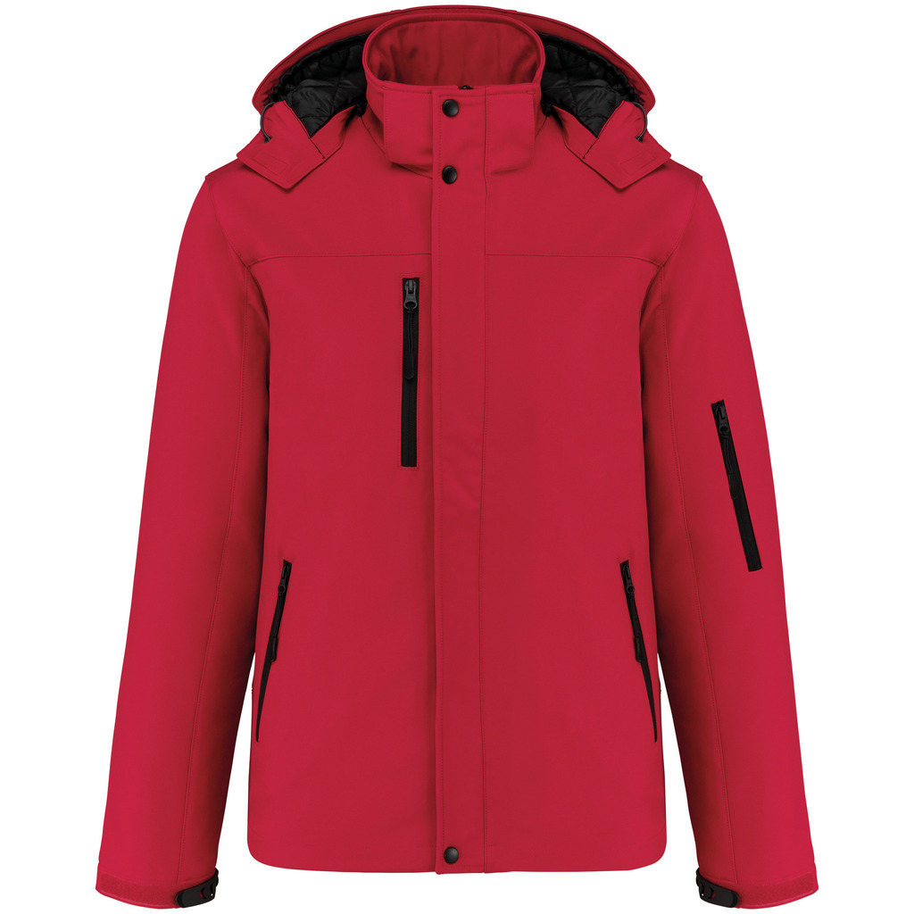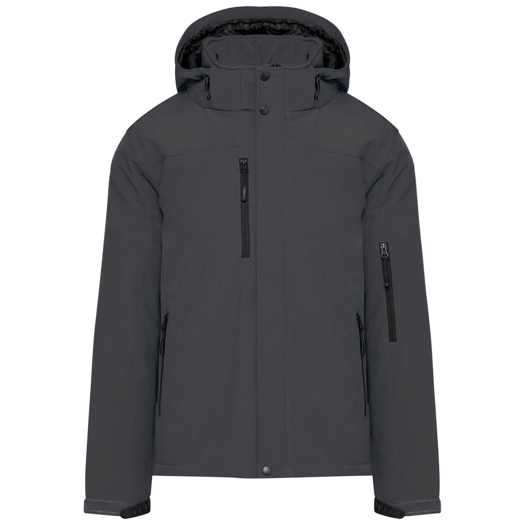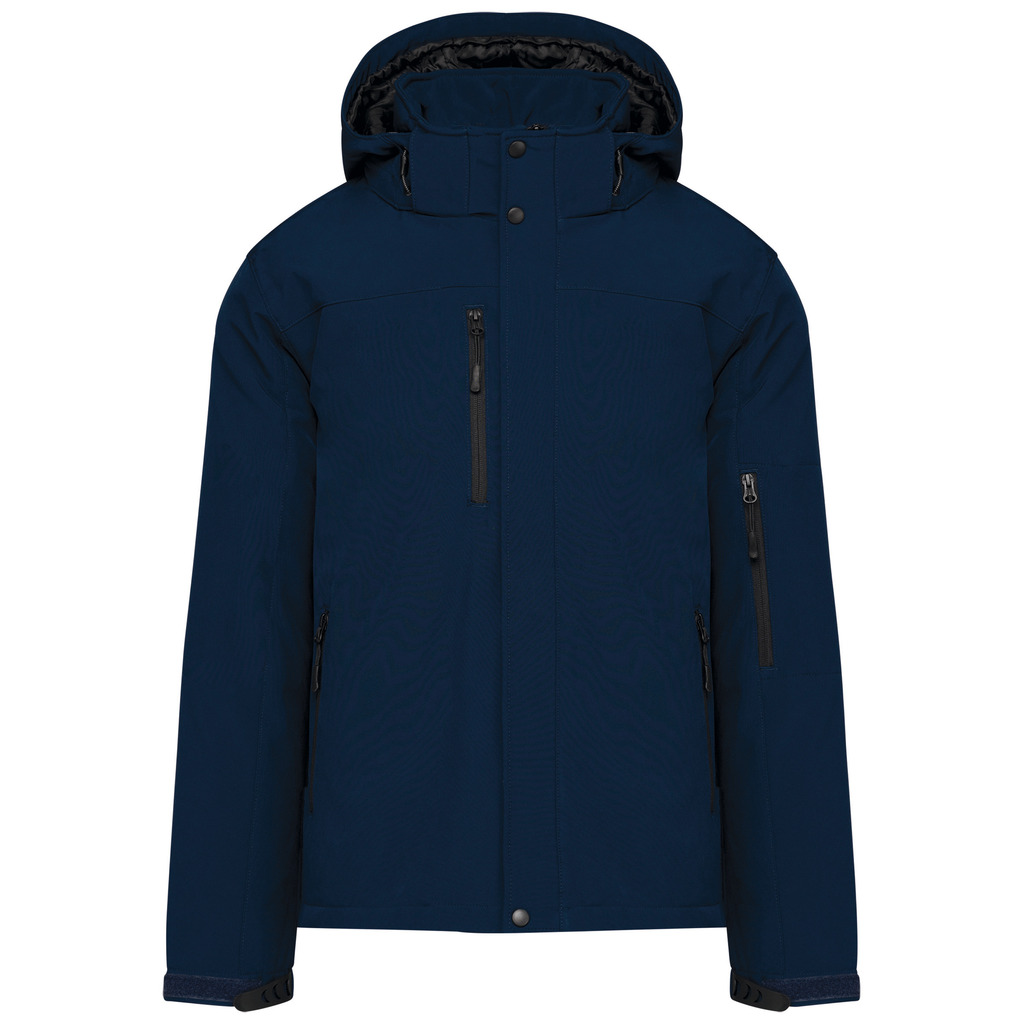 95% poliéster / 5% elastano. Tecido colado com 3 camadas respirável 3000 g / m² / 24 horas e impermeável 8000 mm. Exterior: 95% poliéster / 5% elastano. Camada intermédia: membrana respirável. Camada interior: micropolar. Forro acolchoado 100% poliéster. Frente: 4 bolsos com fecho (2 laterais, 1 na manga e 1 no peito do lado direito). 2 bolsos interiores com fecho de mola. Capuz amovível com 3 painéis forrado e acolchoado, regulável com stoppers. Acabamento da manga com ajuste em velcro. Fecho de acesso para personalização na zona inferior e no peito.