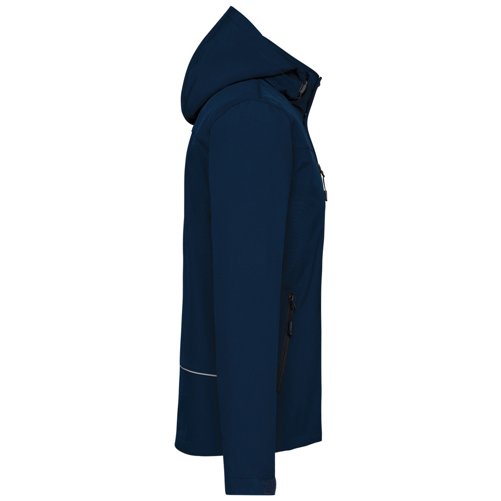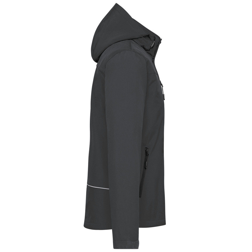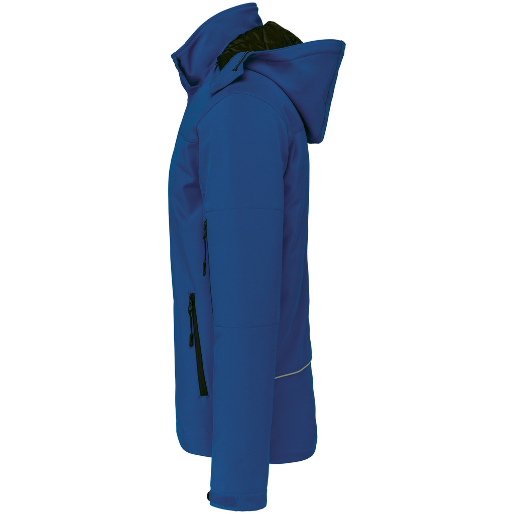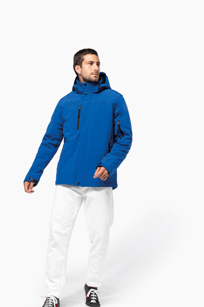 95% poliéster / 5% elastano. Tecido colado com 3 camadas respirável 3000 g / m² / 24 horas e impermeável 8000 mm. Exterior: 95% poliéster / 5% elastano. Camada intermédia: membrana respirável. Camada interior: micropolar. Forro acolchoado 100% poliéster. Frente: 4 bolsos com fecho (2 laterais, 1 na manga e 1 no peito do lado direito). 2 bolsos interiores com fecho de mola. Capuz amovível com 3 painéis forrado e acolchoado, regulável com stoppers. Acabamento da manga com ajuste em velcro. Fecho de acesso para personalização na zona inferior e no peito.