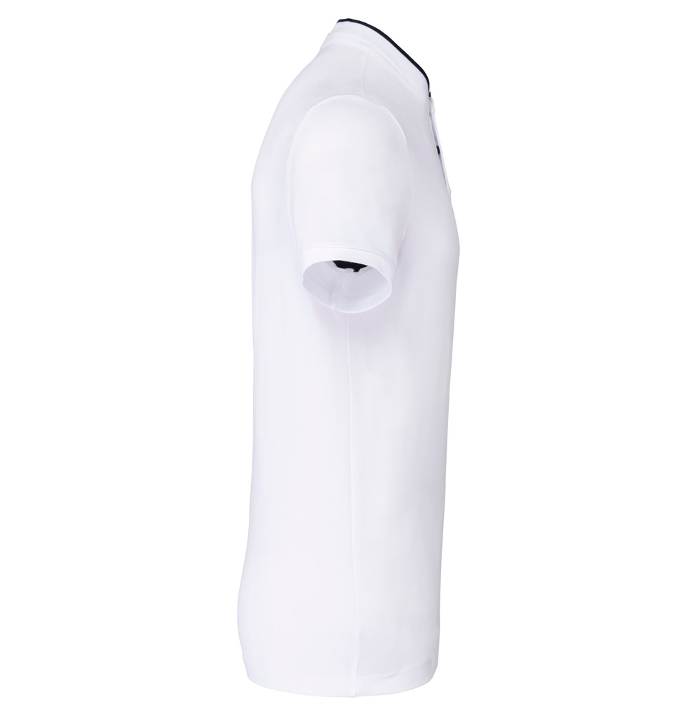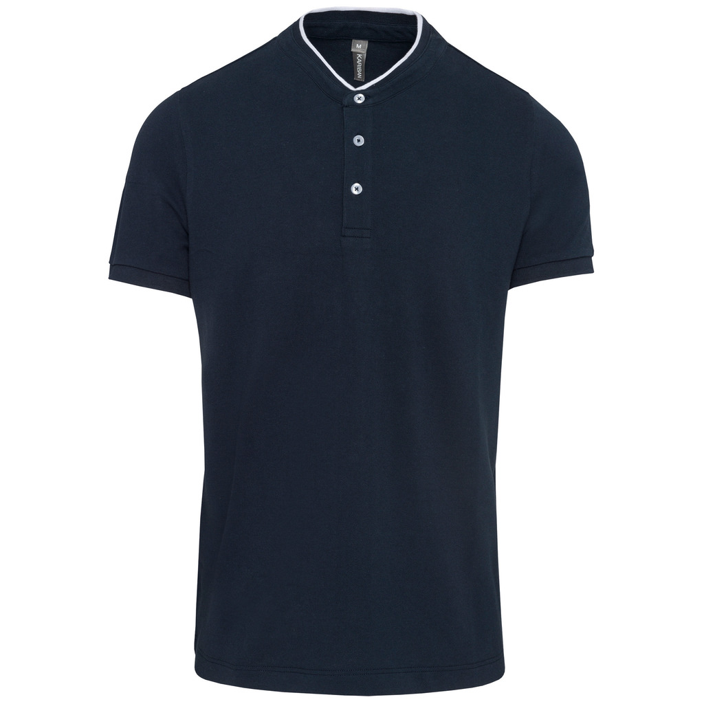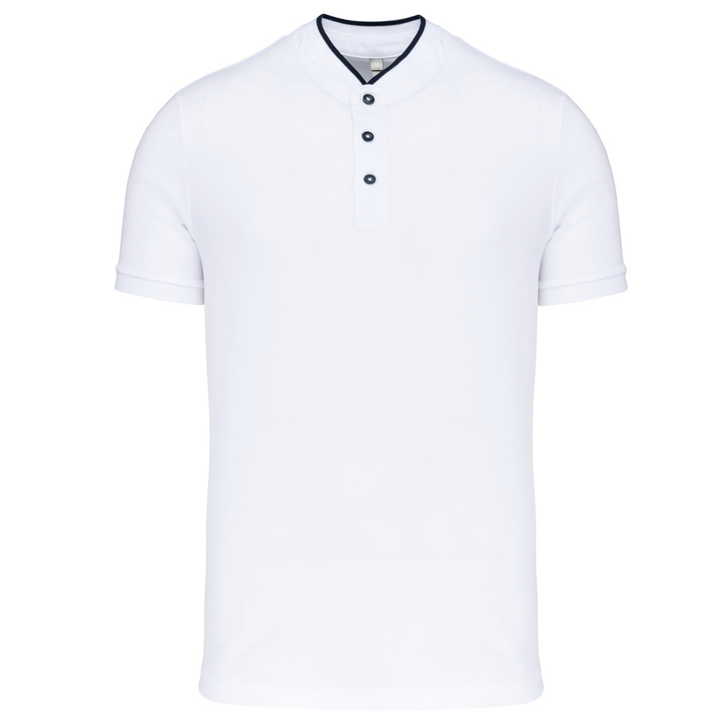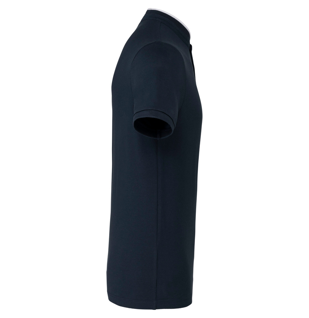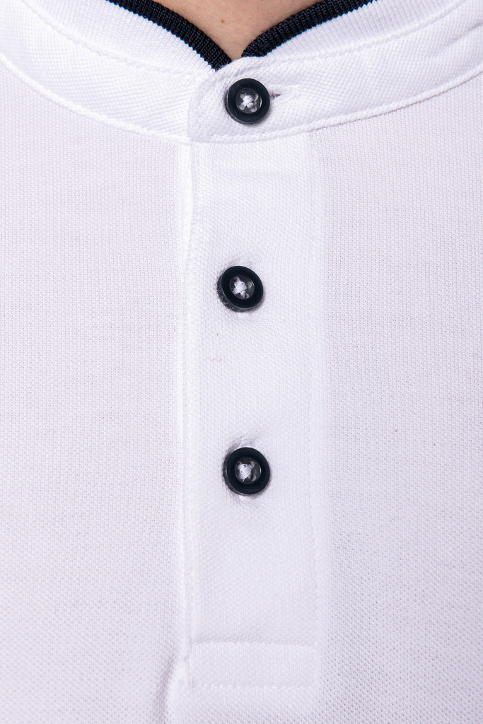 100% algodão (90% algodão / 10% viscose nas cores mescladas). Malha piqué em algodão penteado. Lavável a 60°C (40°C nas cores mescladas). Colarinho à padre (estilo mao) em malha rib com costura em contraste. Carcela com 3 botões em contraste. Acabamento da manga em malha rib. Acabamento da bainha com costura dupla.