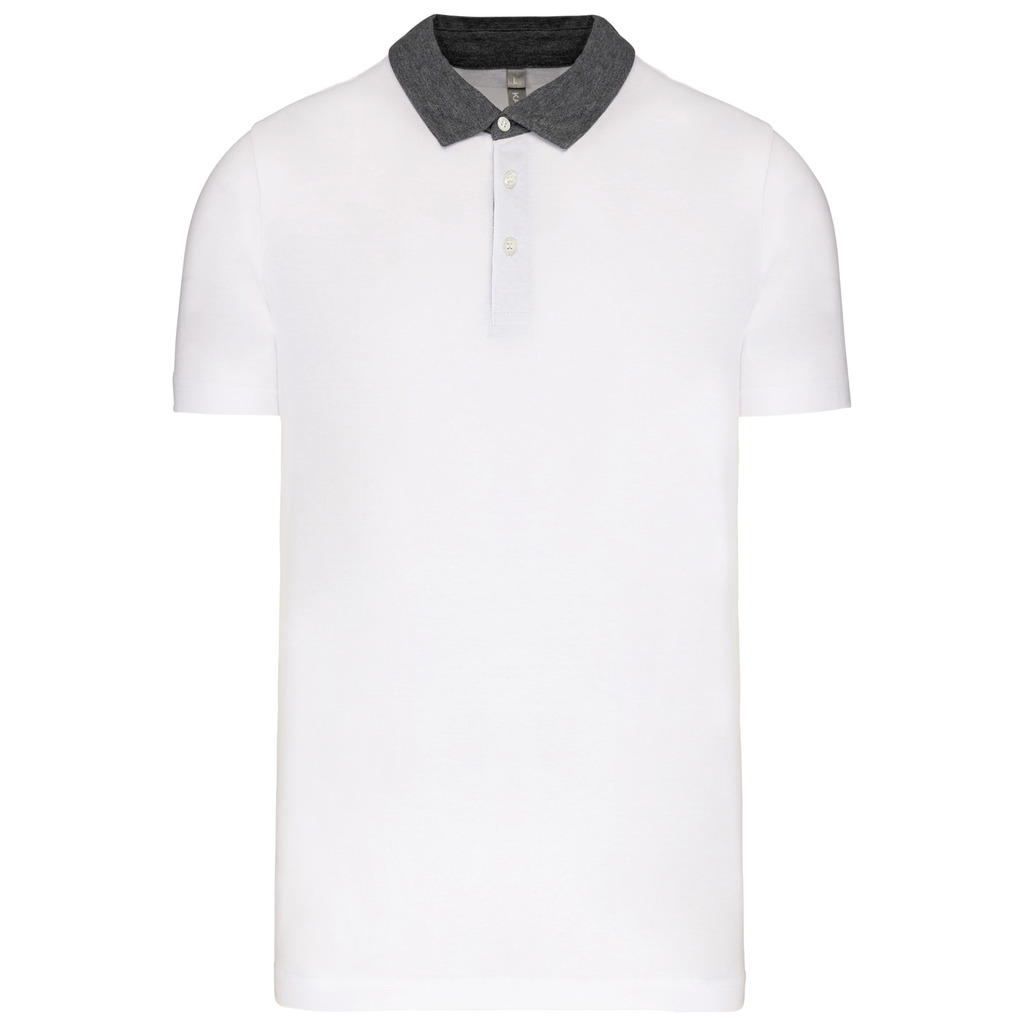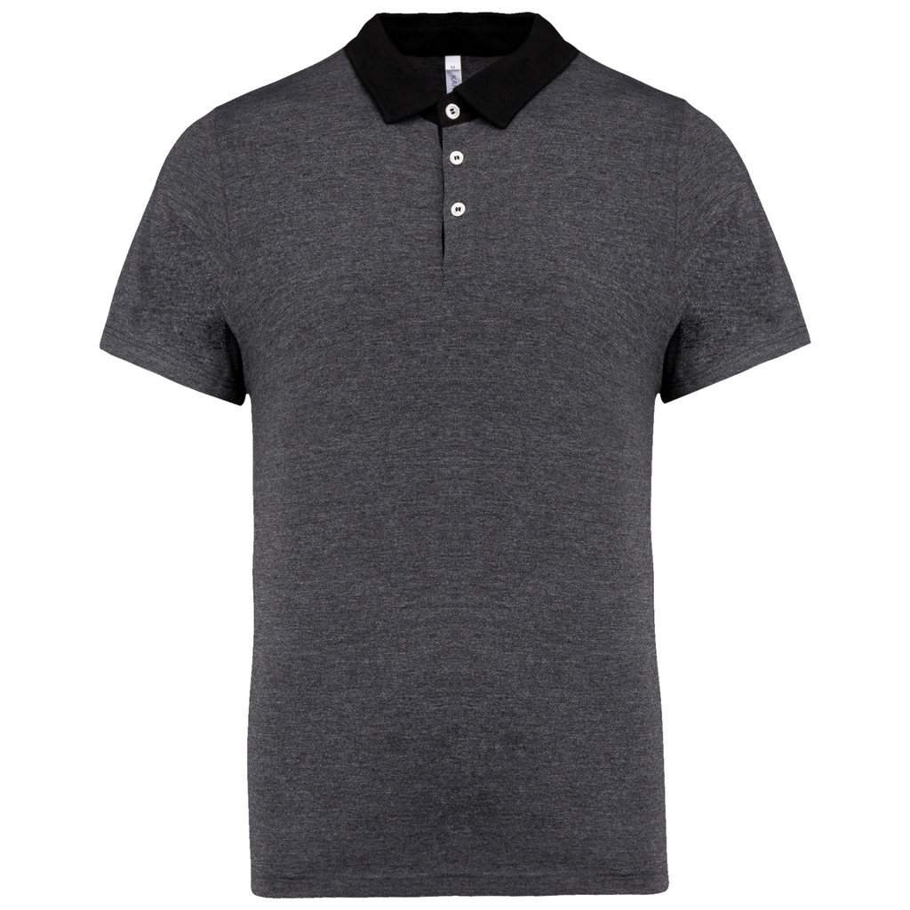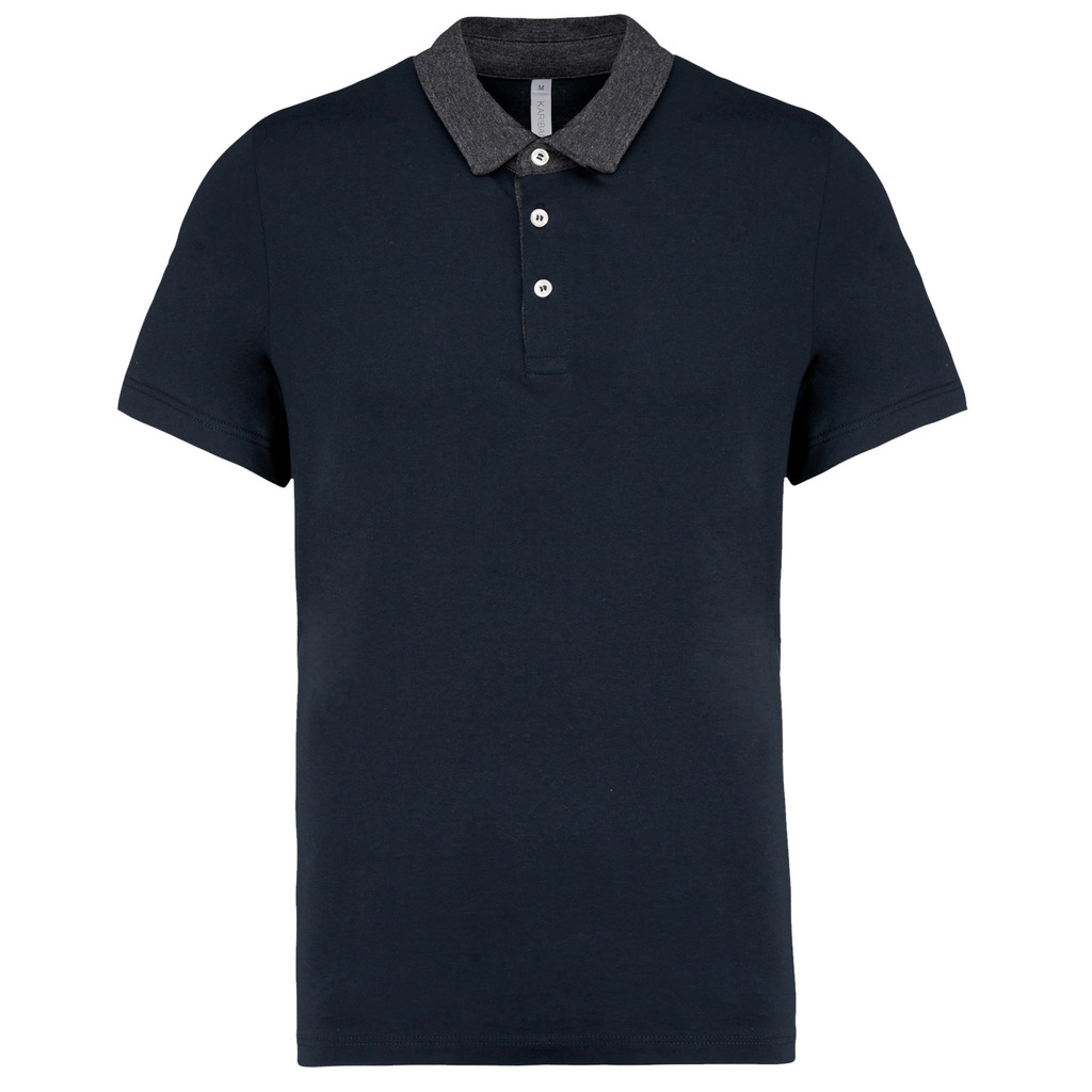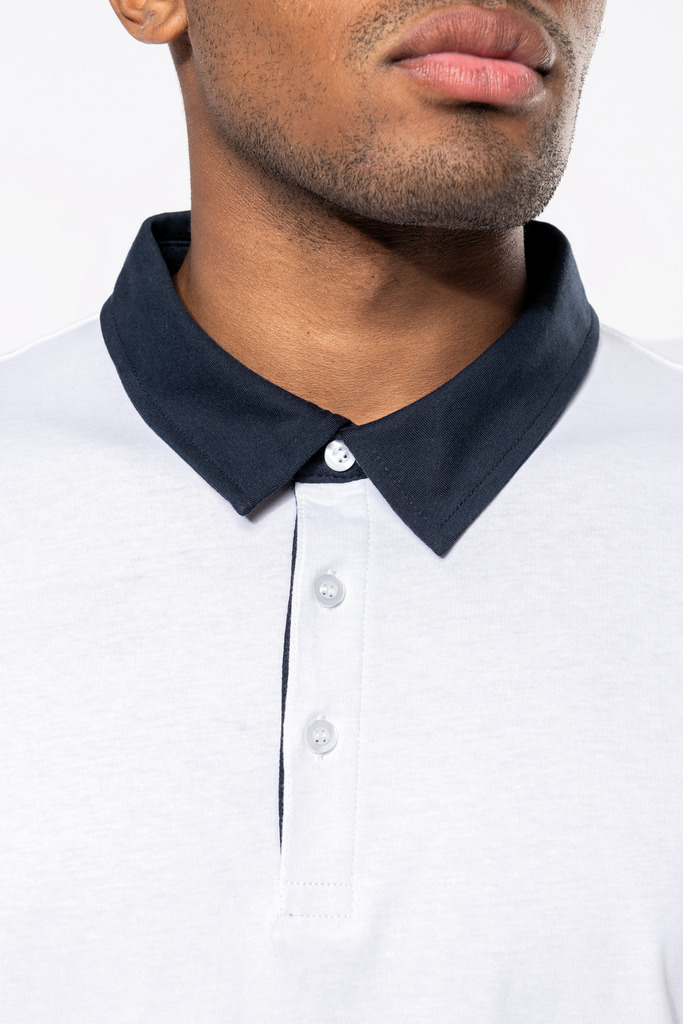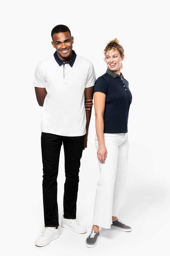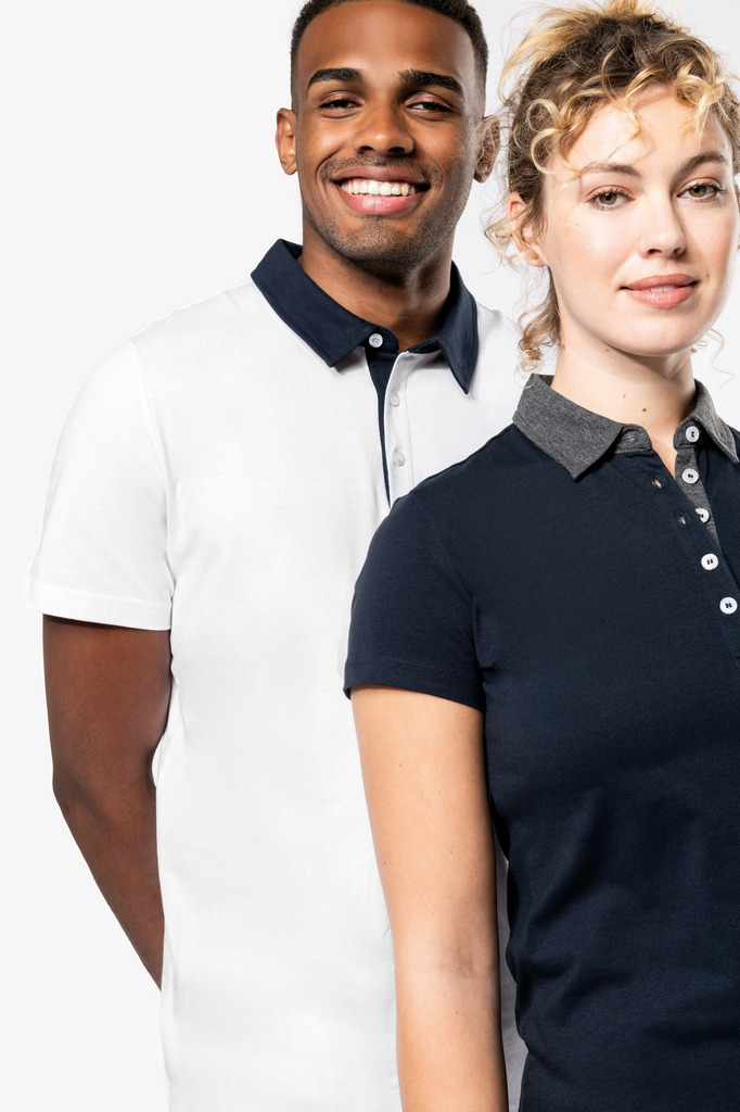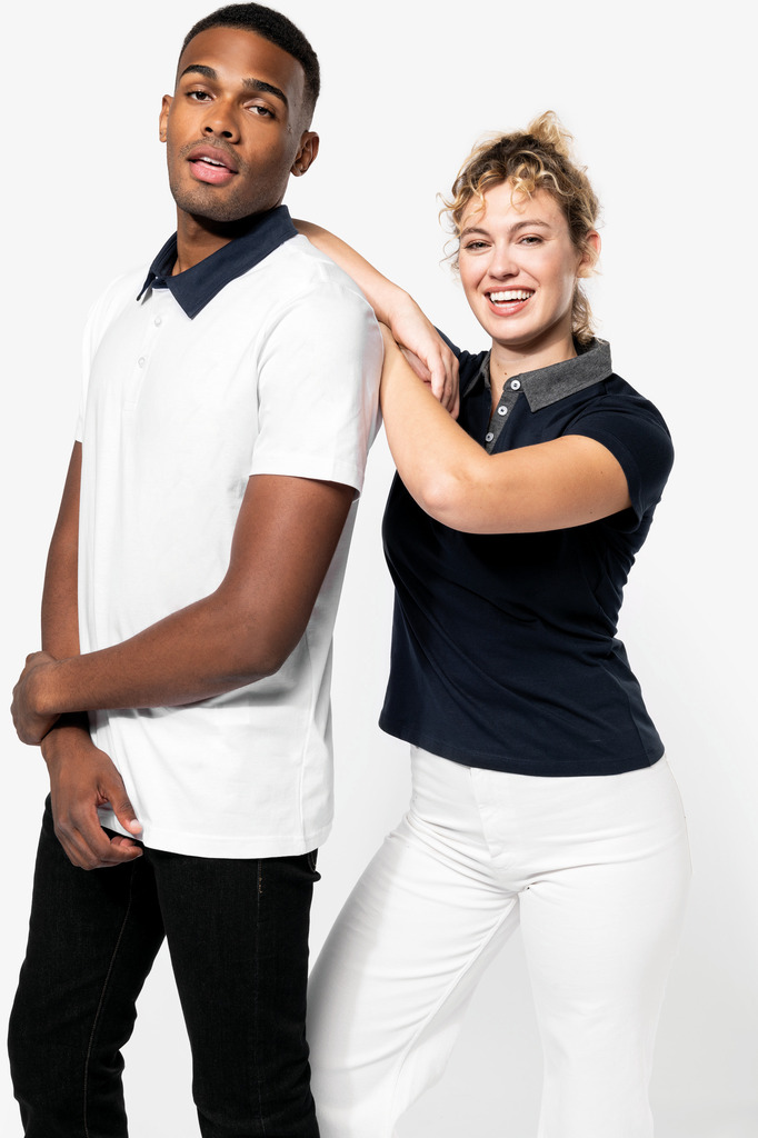100% algodão penteado com banho de enzimas (Cores mescladas: 65% poliéster / 35% algodão). Colarinho tipo camisa. Colarinho e interior da carcela em contraste com 3 botões em branco pérola. Acabamento da manga e bainha com costura dupla.