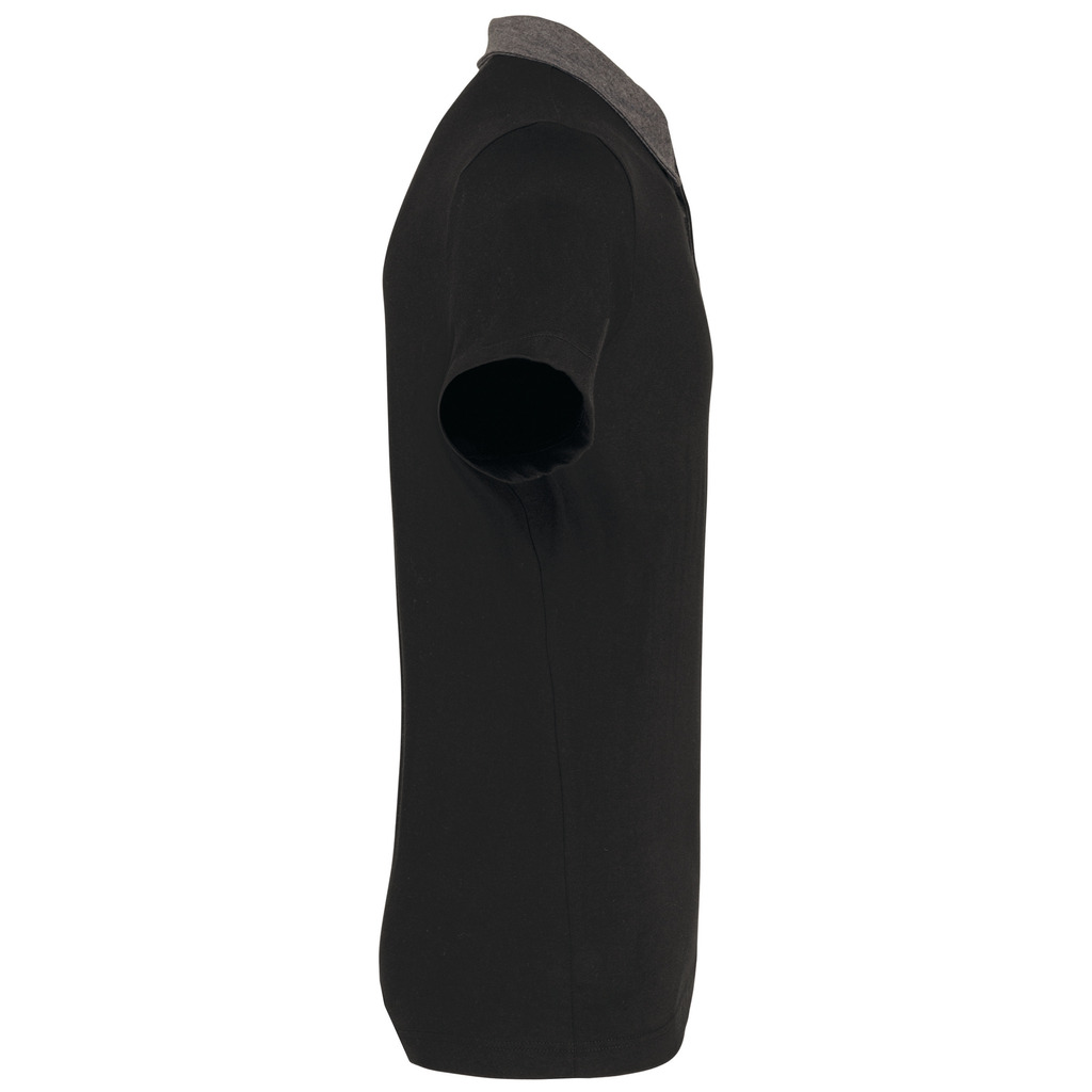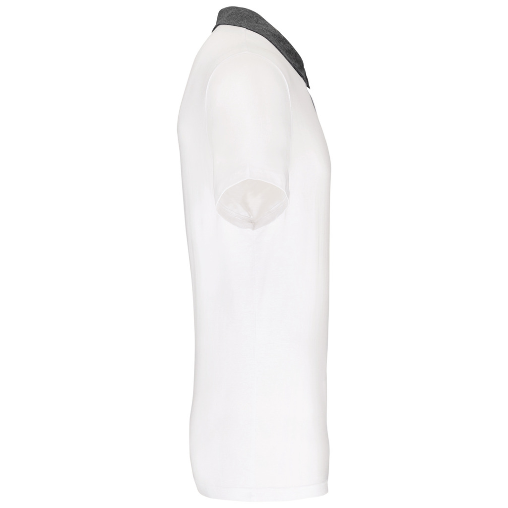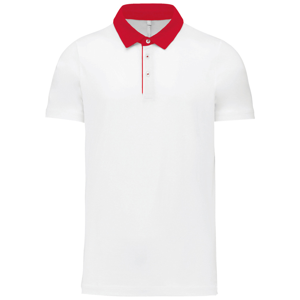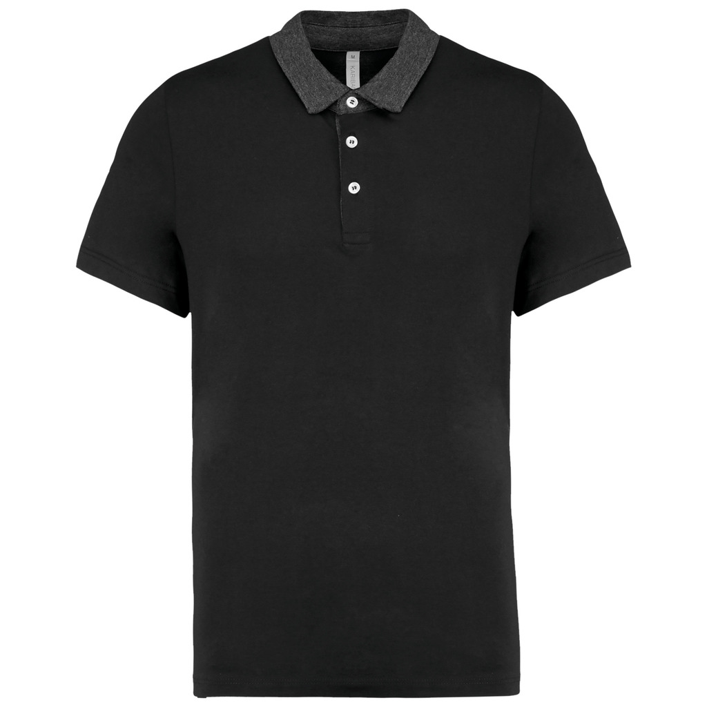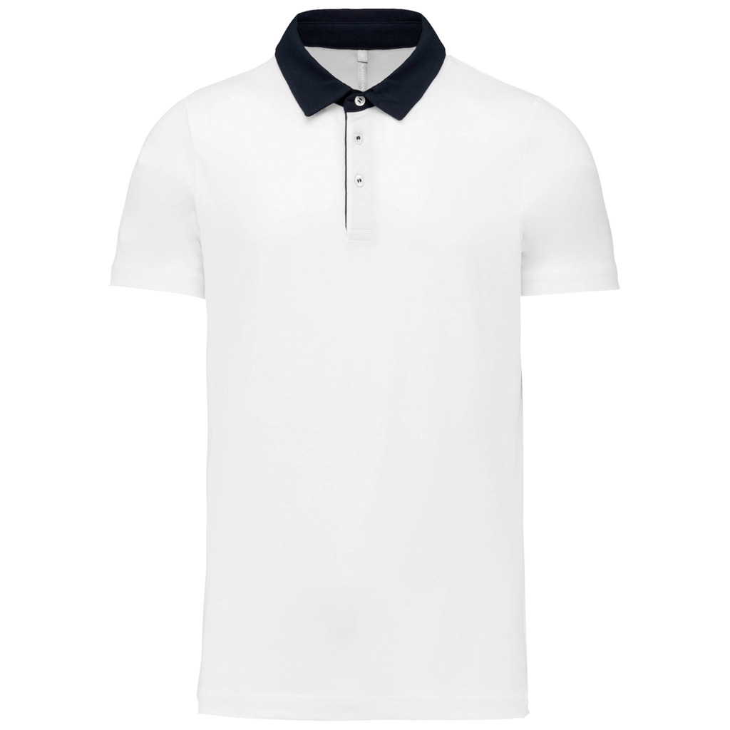 100% algodão penteado com banho de enzimas (Cores mescladas: 65% poliéster / 35% algodão). Colarinho tipo camisa. Colarinho e interior da carcela em contraste com 3 botões em branco pérola. Acabamento da manga e bainha com costura dupla.