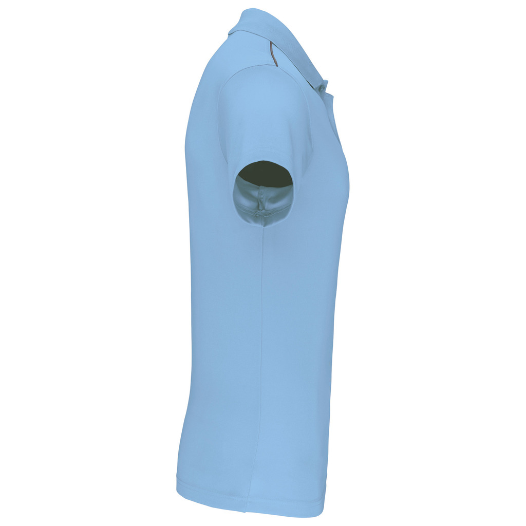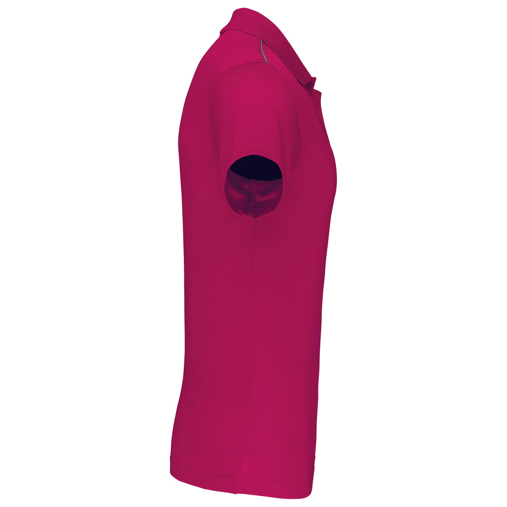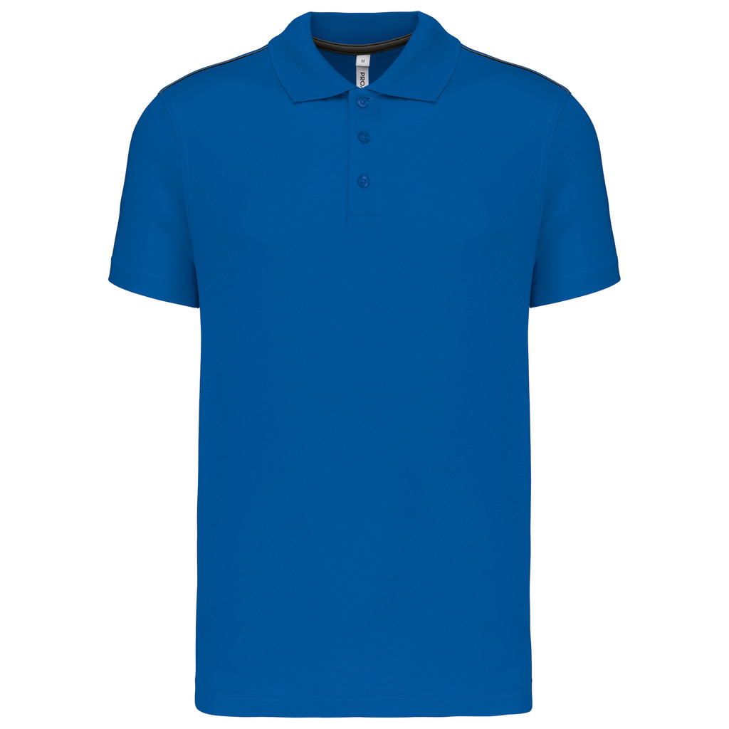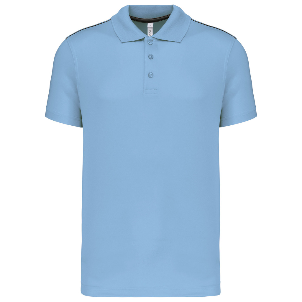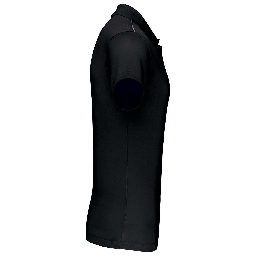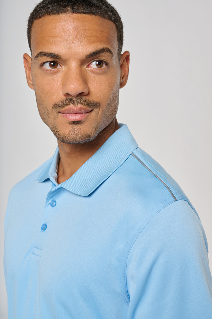 100% poliéster interlock. Tecido de secagem rápida Quick dry®. Colarinho em malha lisa. Carcela com 3 botões. Tapa-costuras e aberturas laterais em contraste. Pesponto em contraste no ombro. Acabamento costura dupla.