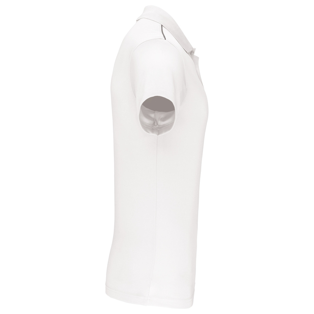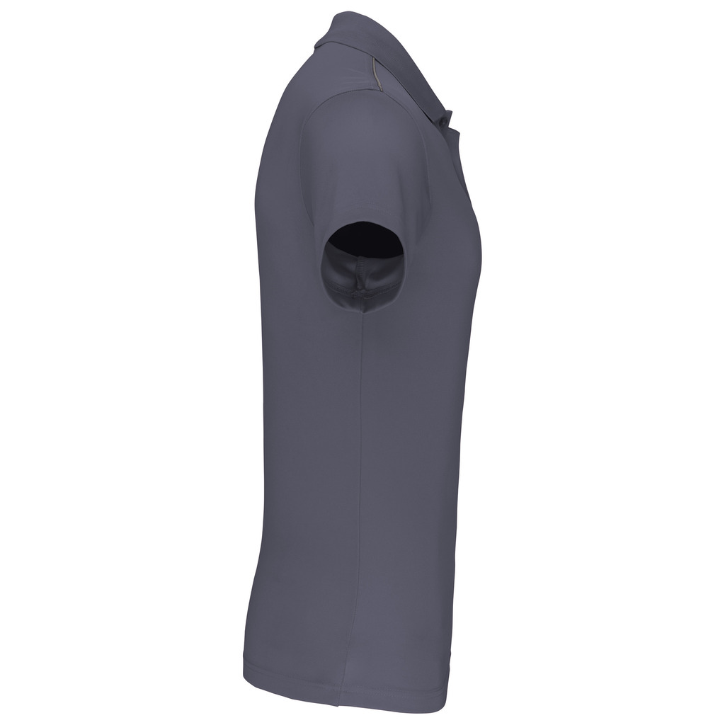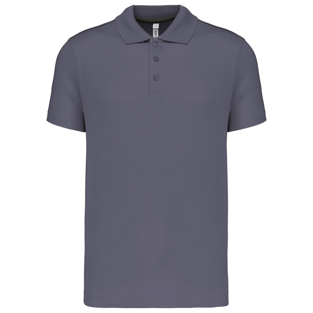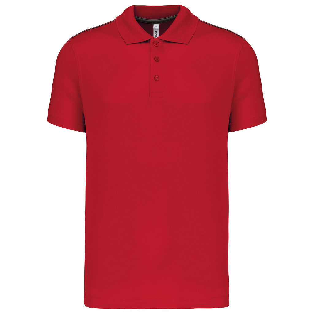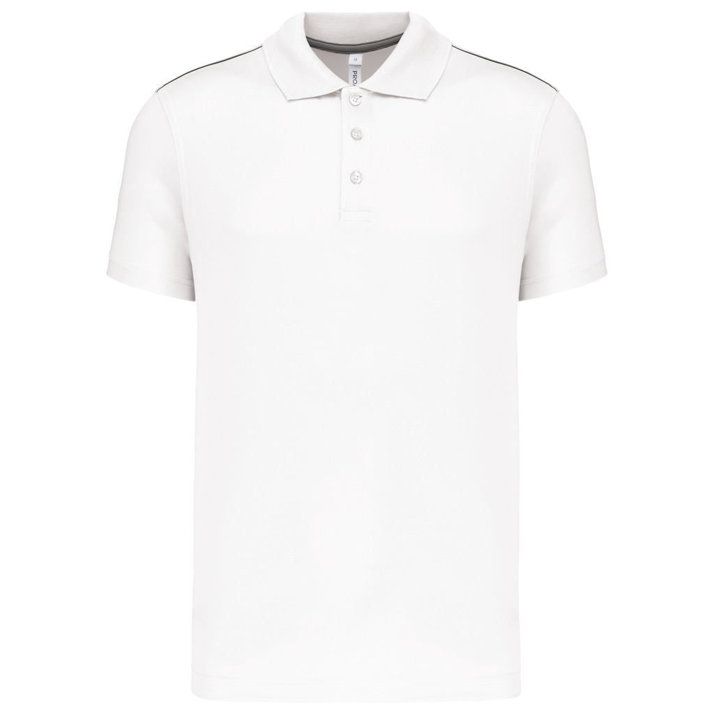 100% poliéster interlock. Tecido de secagem rápida Quick dry®. Colarinho em malha lisa. Carcela com 3 botões. Tapa-costuras e aberturas laterais em contraste. Pesponto em contraste no ombro. Acabamento costura dupla.