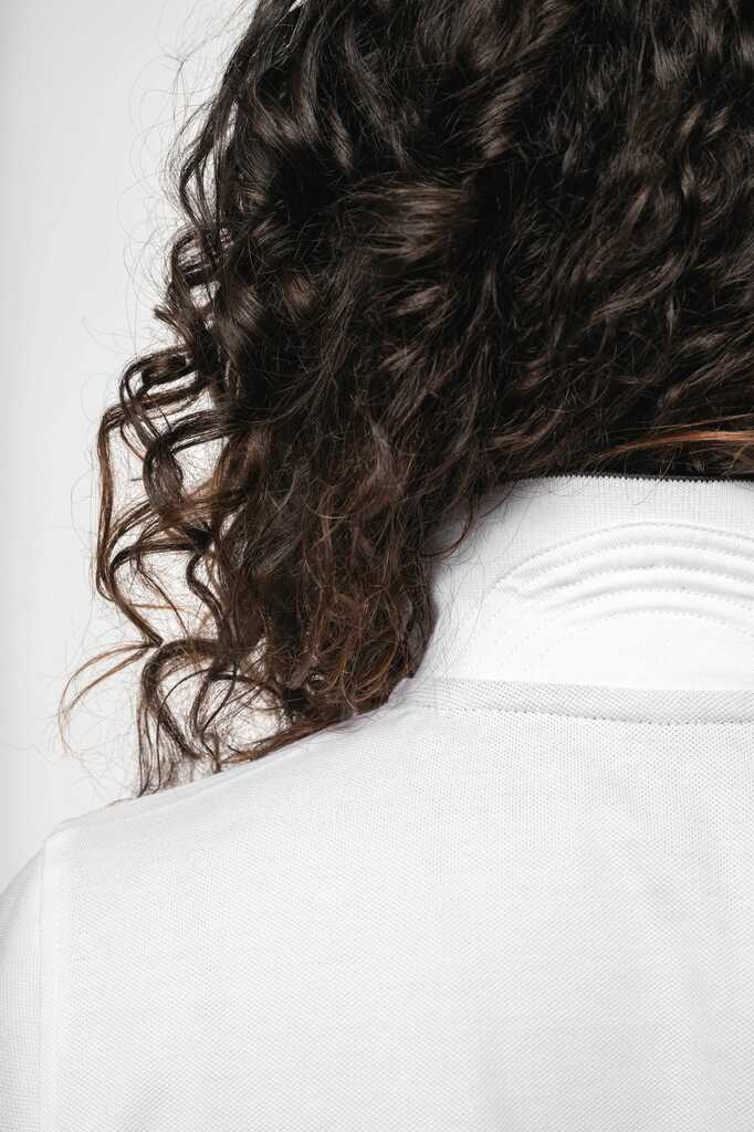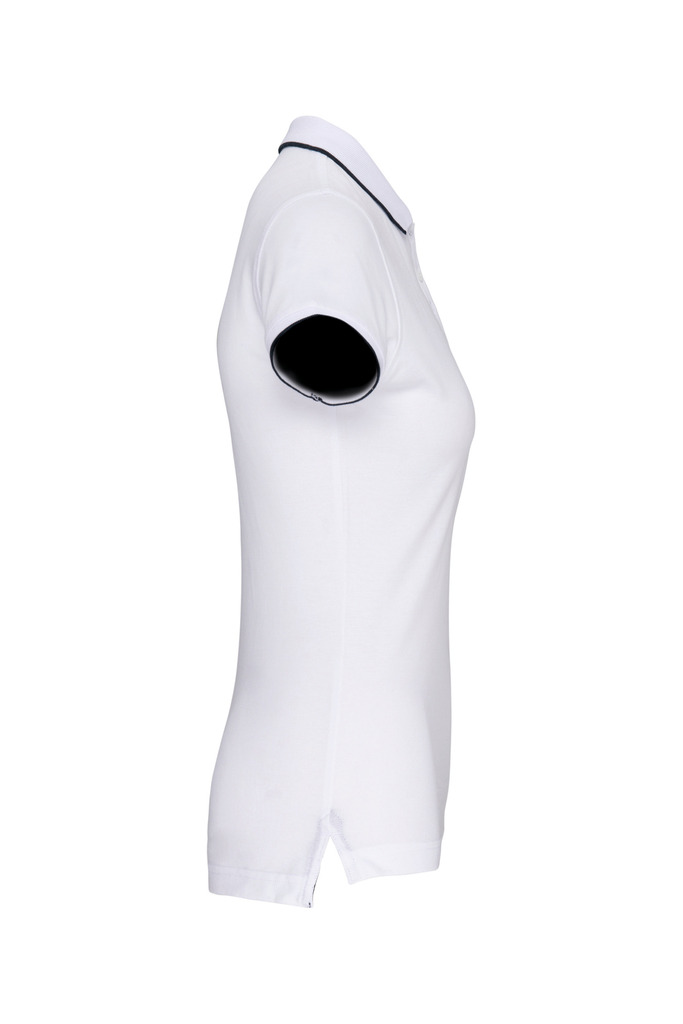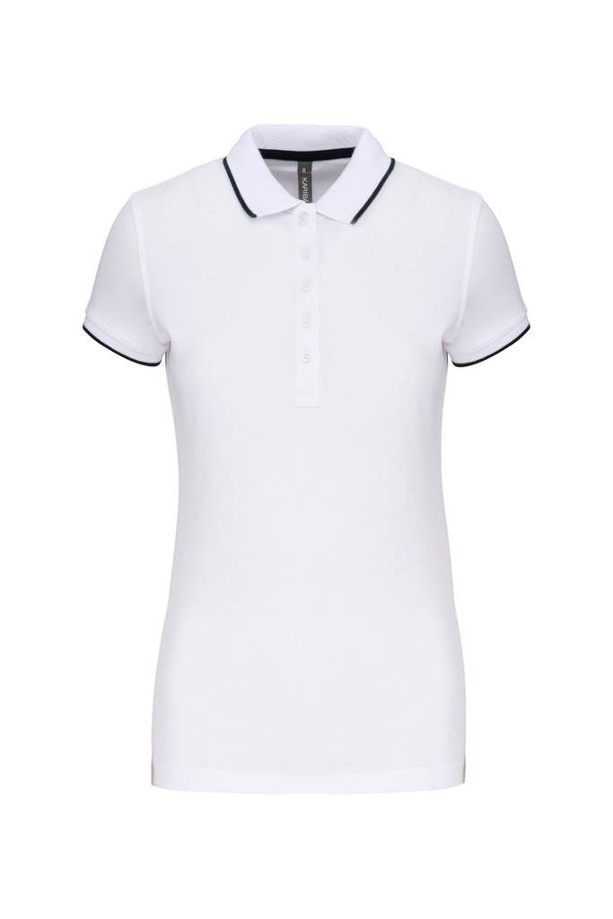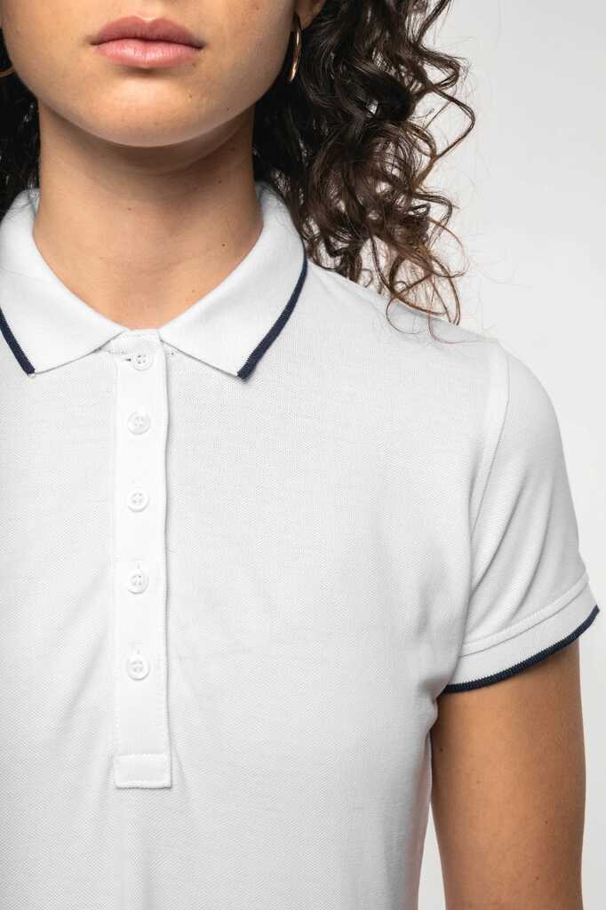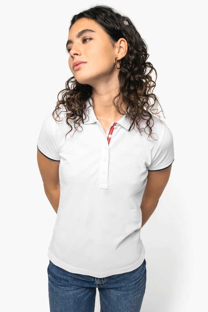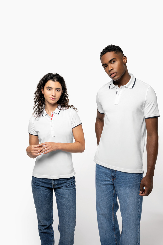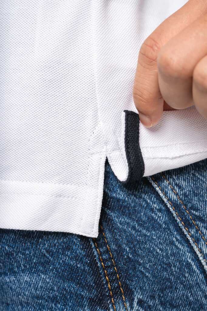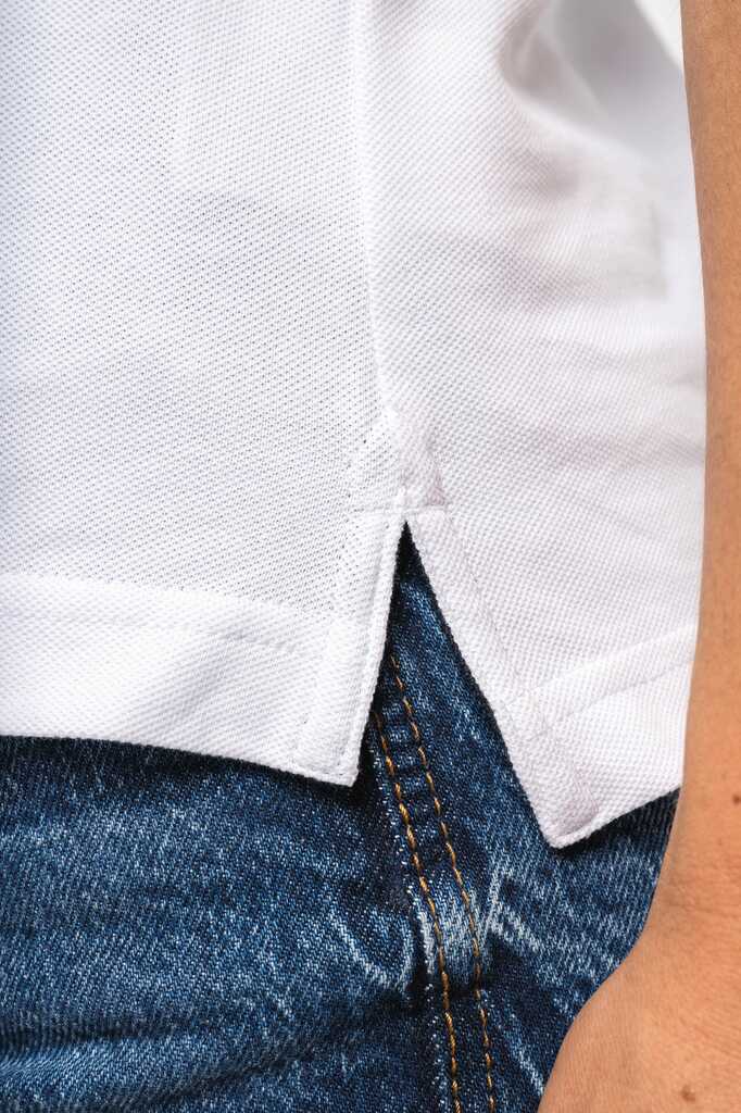 100% algodão piqué. Colarinho em malha rib com risca e parte inferior em contraste. Tapa-costuras e aberturas laterais em contraste (excepto White / Navy: sem contraste sob o colarinho, apenas uma fina borda vermelha sob o placket). Carcela com 5 botões. Acabamento da manga com risca em contraste e malha rib. Acabamento costura dupla.