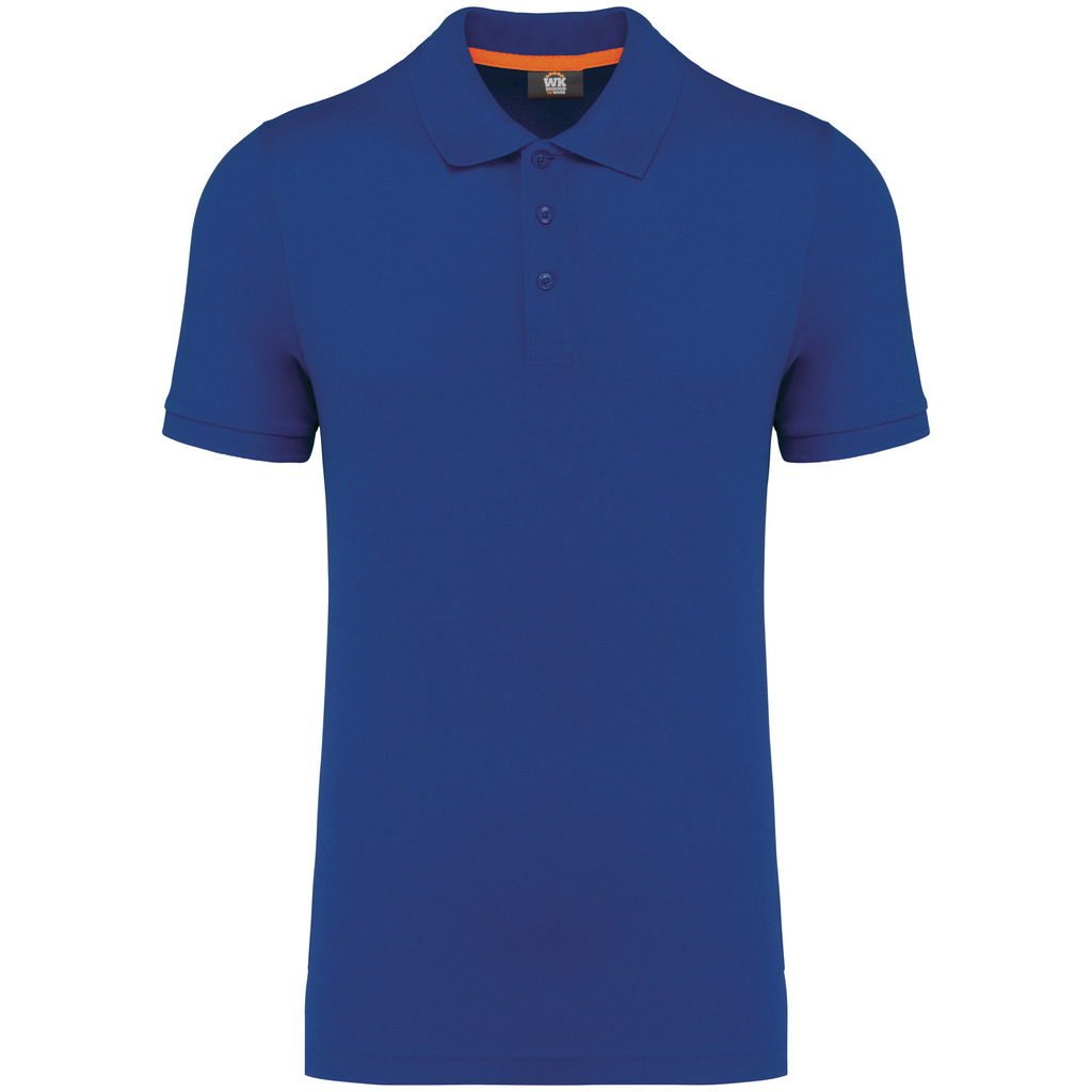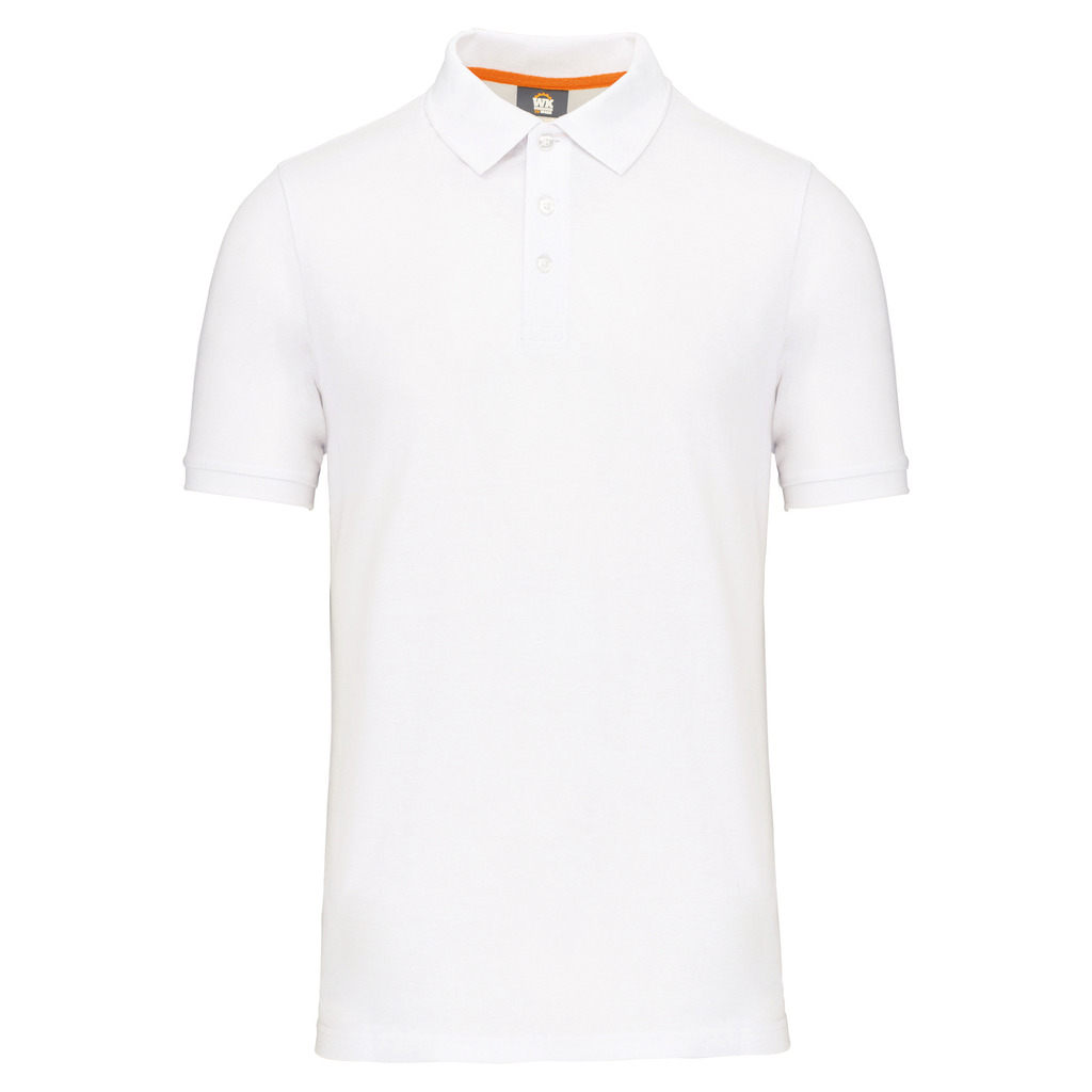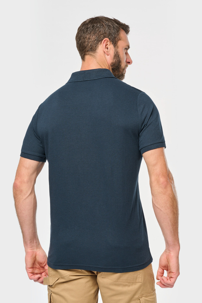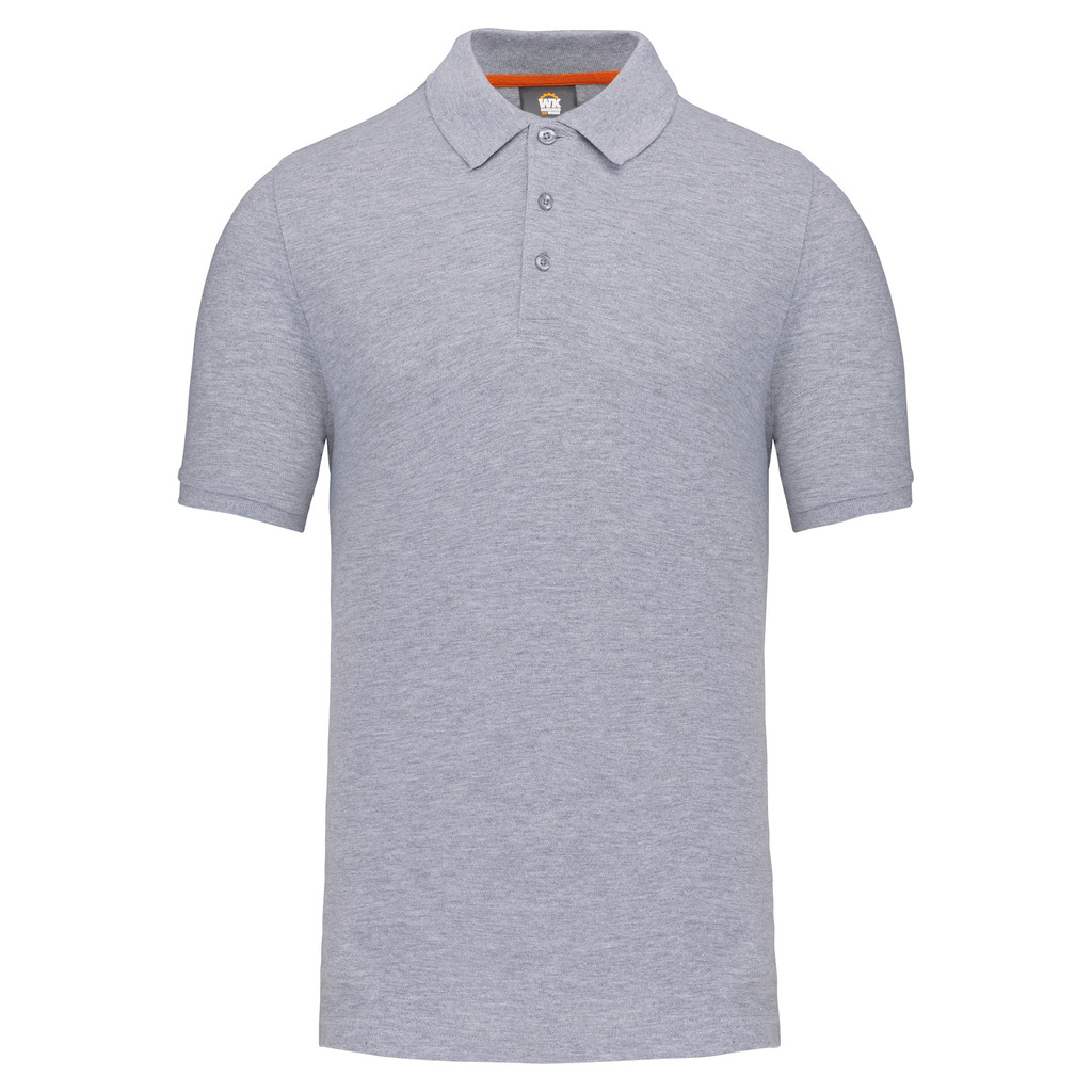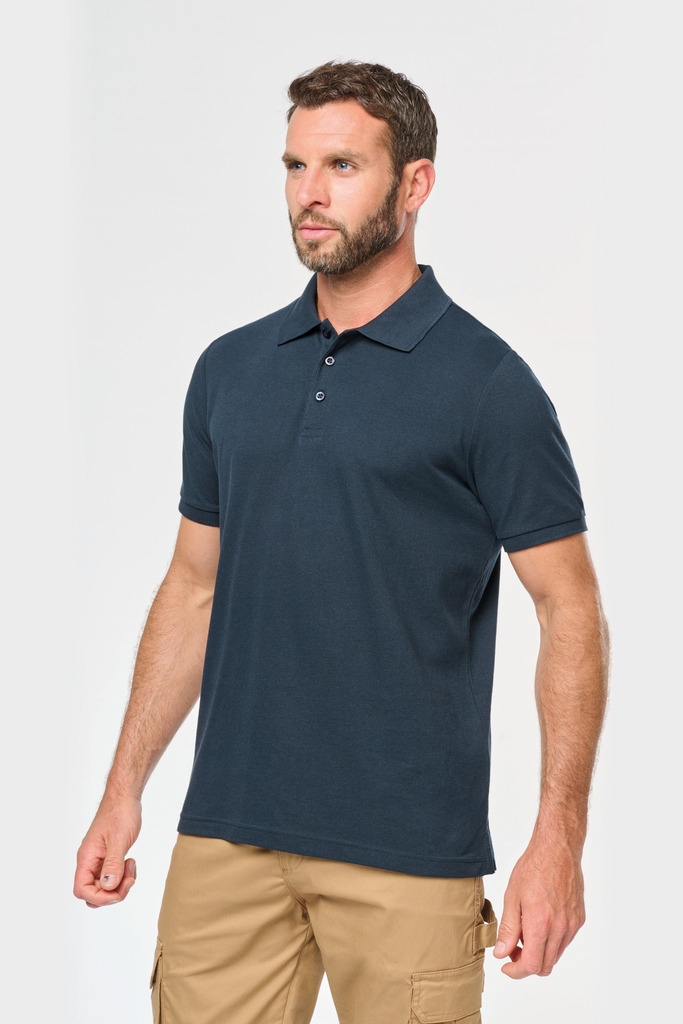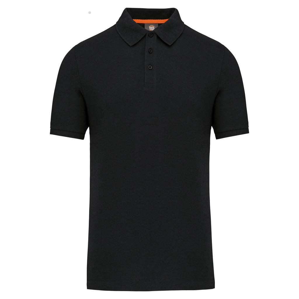 Cores lisas: 60% algodão biológico/40% poliéster reciclado. Cor Oxford Grey: 90% algodão biológico/10% viscose. Tecido de malha piqué. Lavável a 60 °C. Corte direito. Colarinho e acabamento das mangas em malha rib 1 x 1 com tapa-costuras em contraste cor de laranja. Carcela com três botões à cor. 1.ª casa do botão na horizontal. Aberturas laterais com banda em contraste cor de laranja. Acabamento da bainha com costura dupla. Etiqueta de marca «tearaway» para facilitar a personalização.