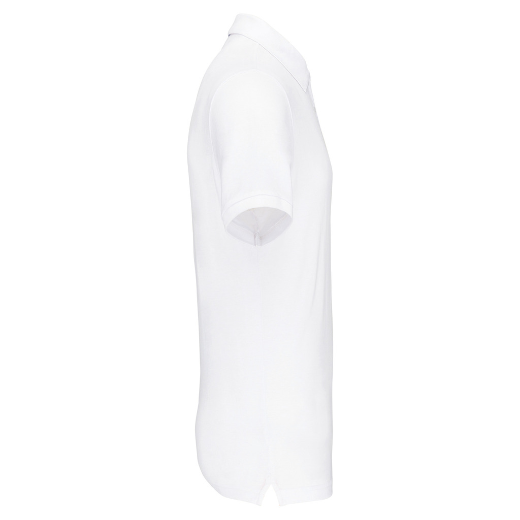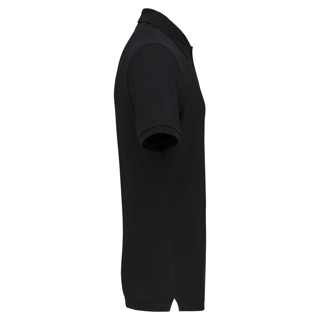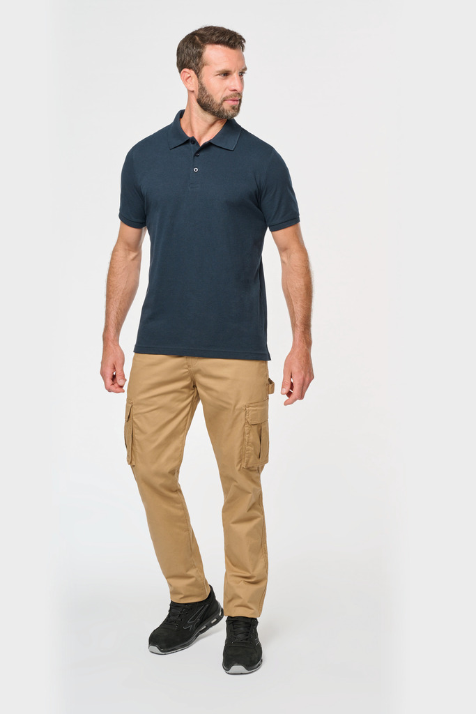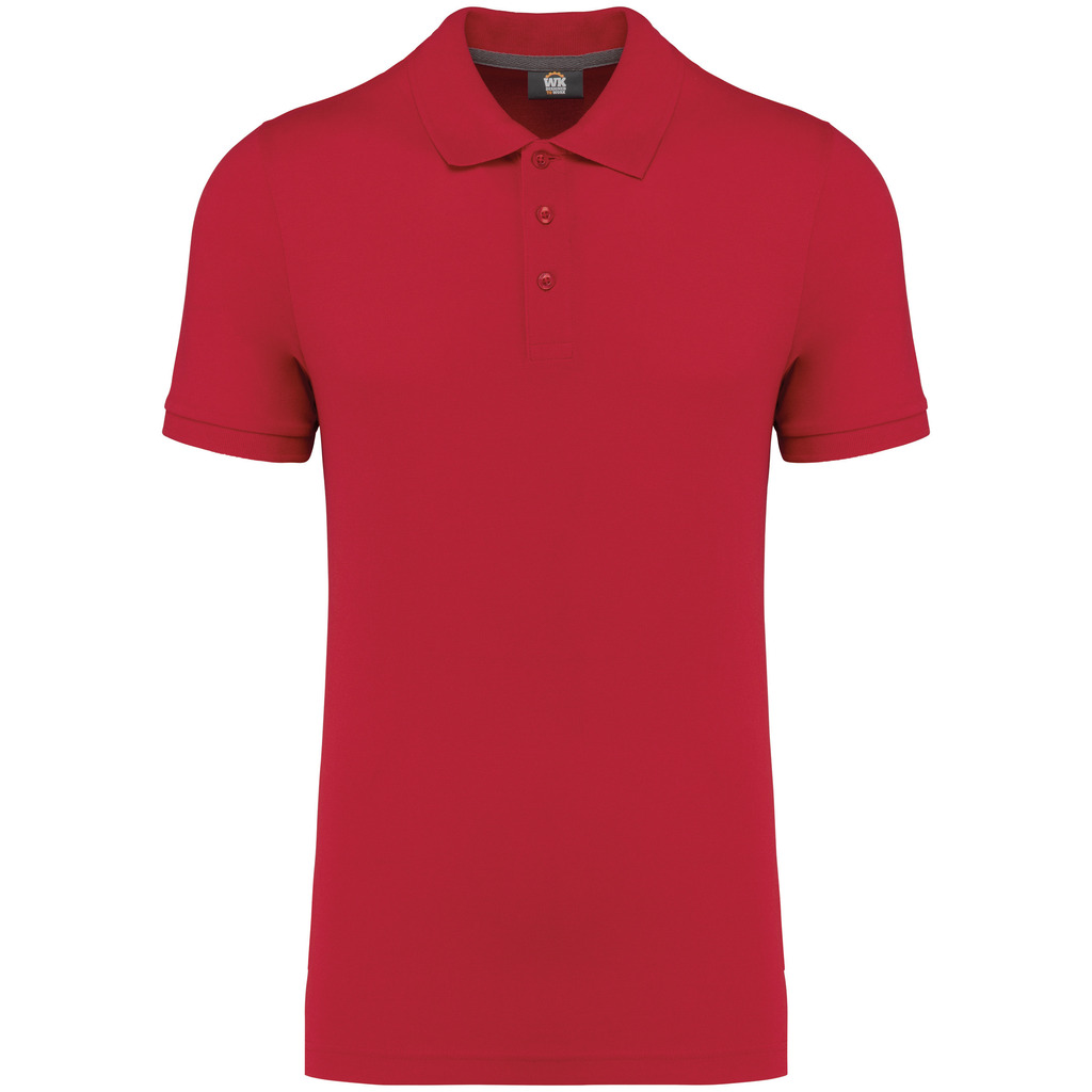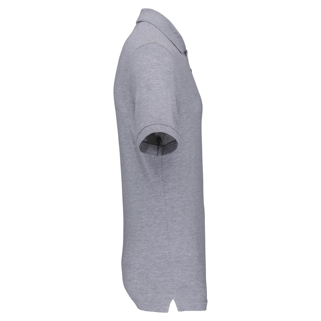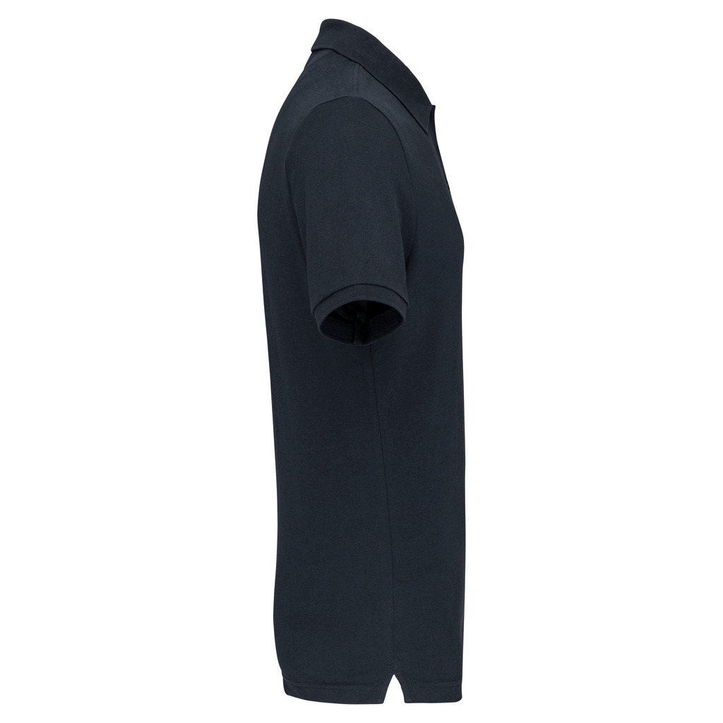 Cores lisas: 60% algodão biológico/40% poliéster reciclado. Cor Oxford Grey: 90% algodão biológico/10% viscose. Tecido de malha piqué. Lavável a 60 °C. Corte direito. Colarinho e acabamento das mangas em malha rib 1 x 1 com tapa-costuras em contraste cor de laranja. Carcela com três botões à cor. 1.ª casa do botão na horizontal. Aberturas laterais com banda em contraste cor de laranja. Acabamento da bainha com costura dupla. Etiqueta de marca «tearaway» para facilitar a personalização.