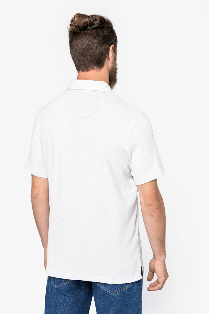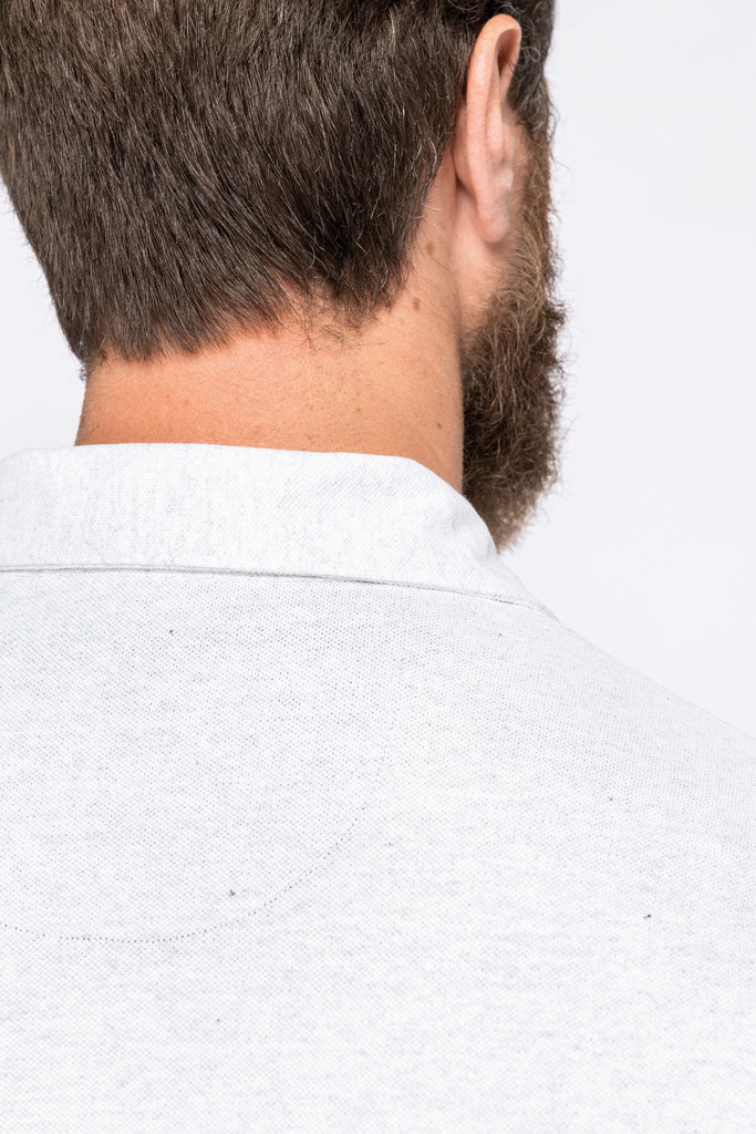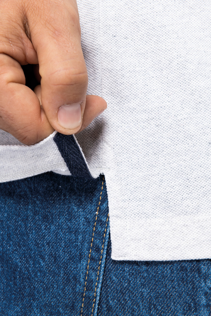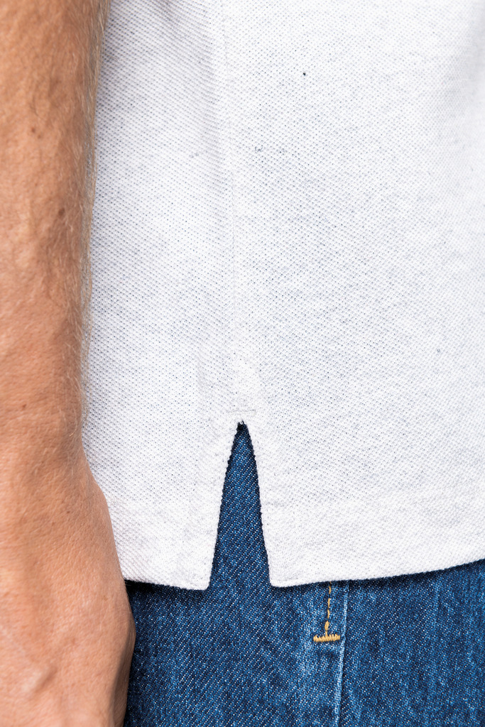 55% algodão reciclado pré-consumo. 45% poliéster reciclado pós-consumo. Corte justo. Carcela com 3 botões. Colarinho no material principal. Meia-lua em contraste nas costas. Abertura lateral com acabamento interior em contraste.