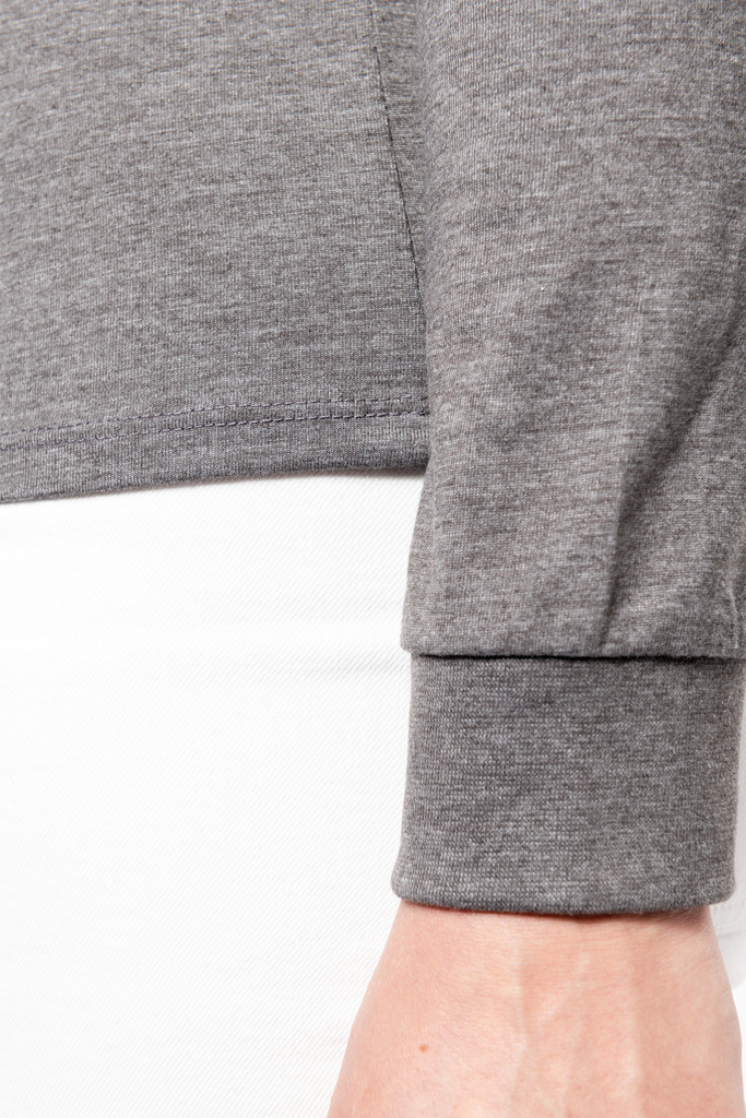 100% algodão (Grey Heather: 65% poliéster / 35% algodão – Oxford Grey: 90% algodão / 10% viscose). Malha jersey em algodão penteado. Colarinho tipo camisa. Carcela com 4 botões de metal. Detalhes no ombro. Punho com acabamento em malha rib. Costura dupla na bainha.