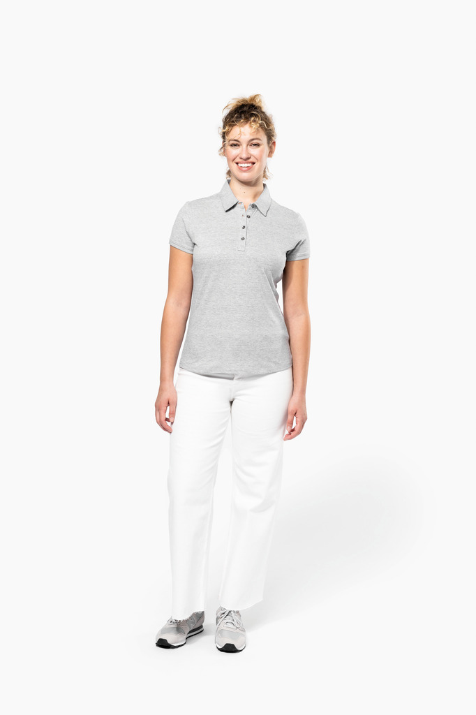 100% algodão penteado (French Navy Heather: 80% algodão / 20% poliéster – Grey Heather: 65% poliéster / 35% algodão – Oxford Grey: 90% algodão / 10% viscose). Malha jersey. Colarinho tipo camisa. Carcela com 4 botões de metal. Detalhes no ombro. Acabamento da manga em malha rib. Costura dupla na bainha.