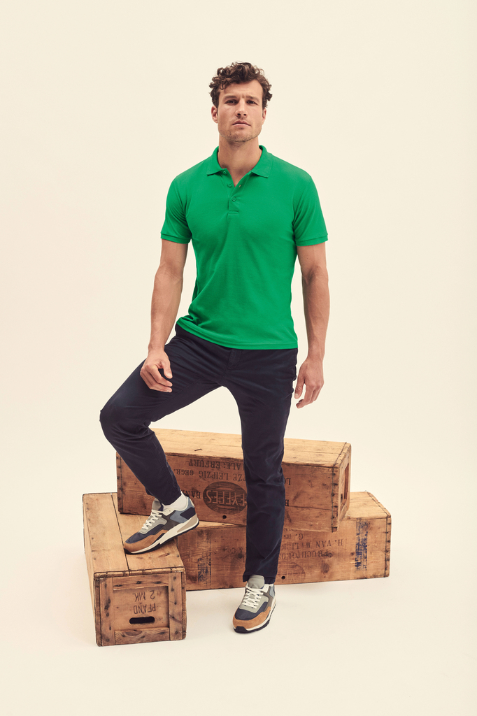 100% algodão piqué (Heather Grey: 97% algodão / 3% poliéster). Carcela com três botões à cor. Aberturas laterais.