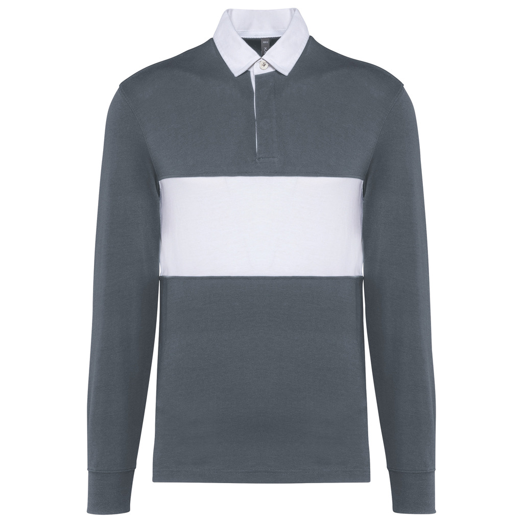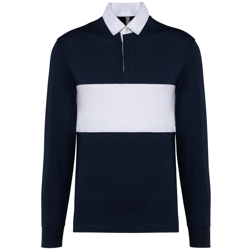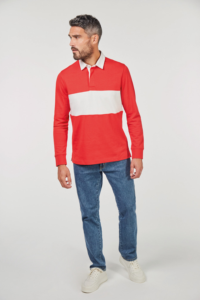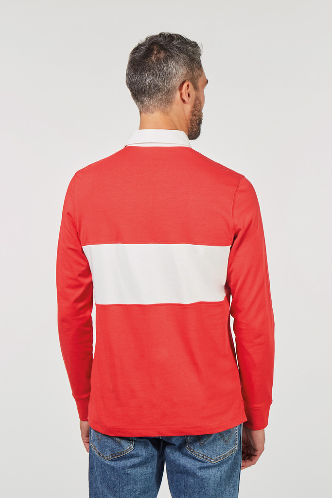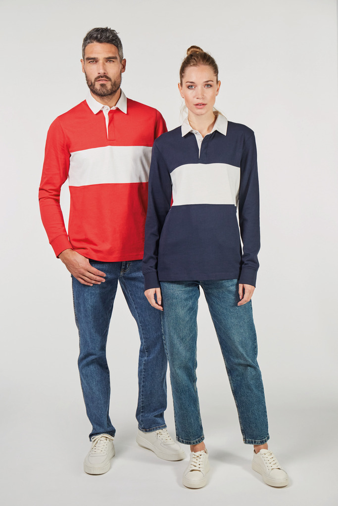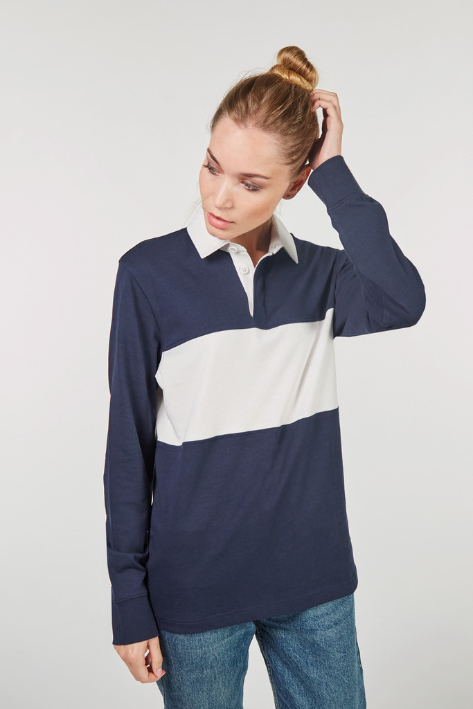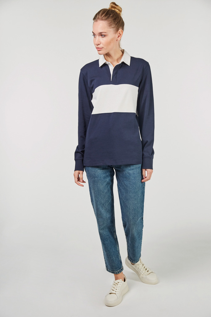 100% algodão. Tecido jersey. Corte direito. Colarinho e carcela interior em sarja de algodão branco. Carcela com 3 botões de borracha. Punhos em malha rib 1 x 1. Tapa-costuras na gola em chevron tom sobre tom. Faixa central frontal e nas costas em contraste. Bainha, aberturas laterais e banda em chevron tom sobre tom. Costura com pesponto duplo nas cavas e nos punhos. Acabamentos costura dupla na bainha. Etiqueta de marca amovÃvel.