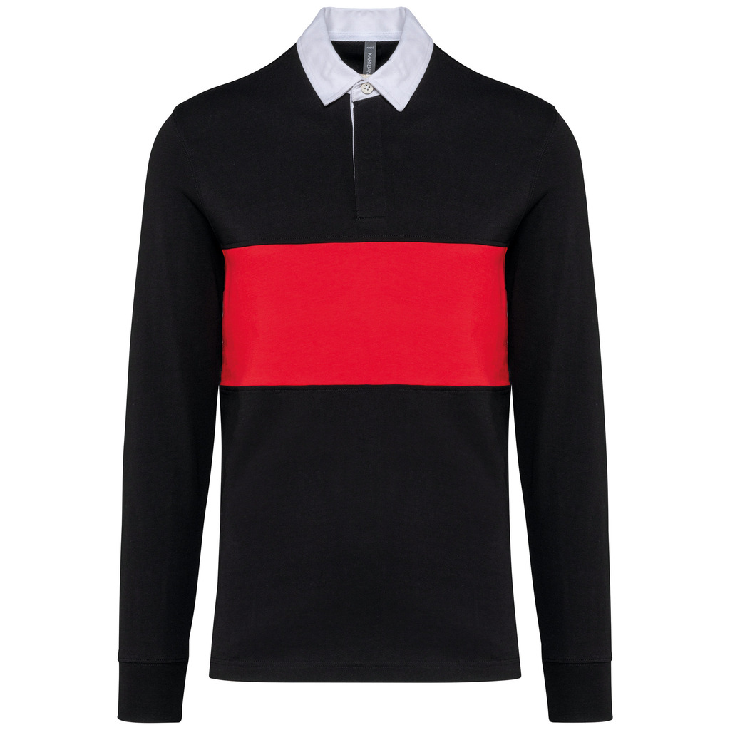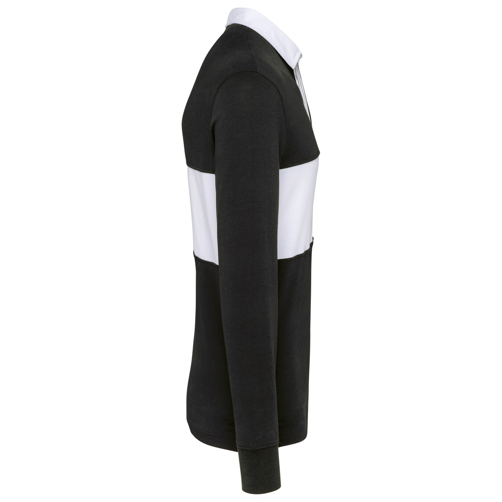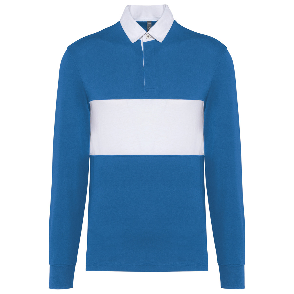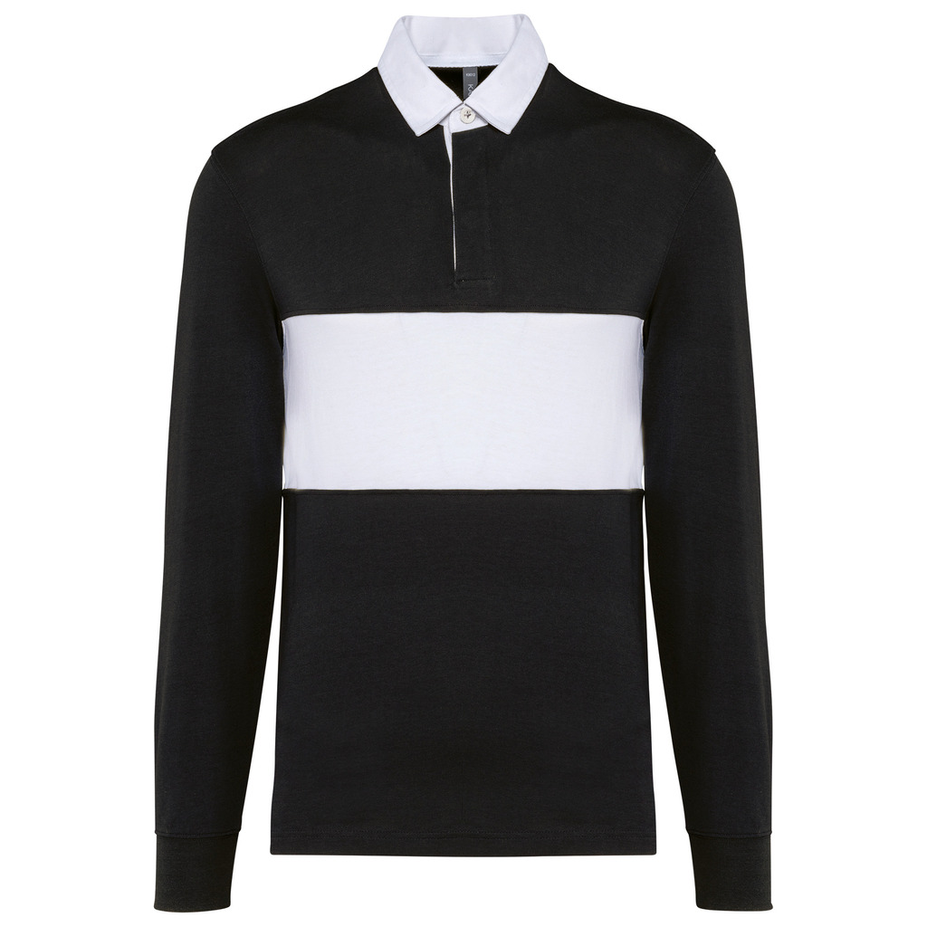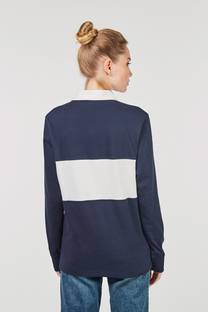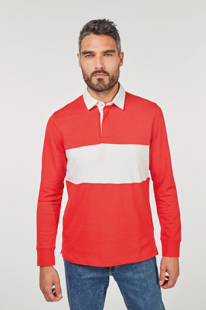 100% algodão. Tecido jersey. Corte direito. Colarinho e carcela interior em sarja de algodão branco. Carcela com 3 botões de borracha. Punhos em malha rib 1 x 1. Tapa-costuras na gola em chevron tom sobre tom. Faixa central frontal e nas costas em contraste. Bainha, aberturas laterais e banda em chevron tom sobre tom. Costura com pesponto duplo nas cavas e nos punhos. Acabamentos costura dupla na bainha. Etiqueta de marca amovÃvel.