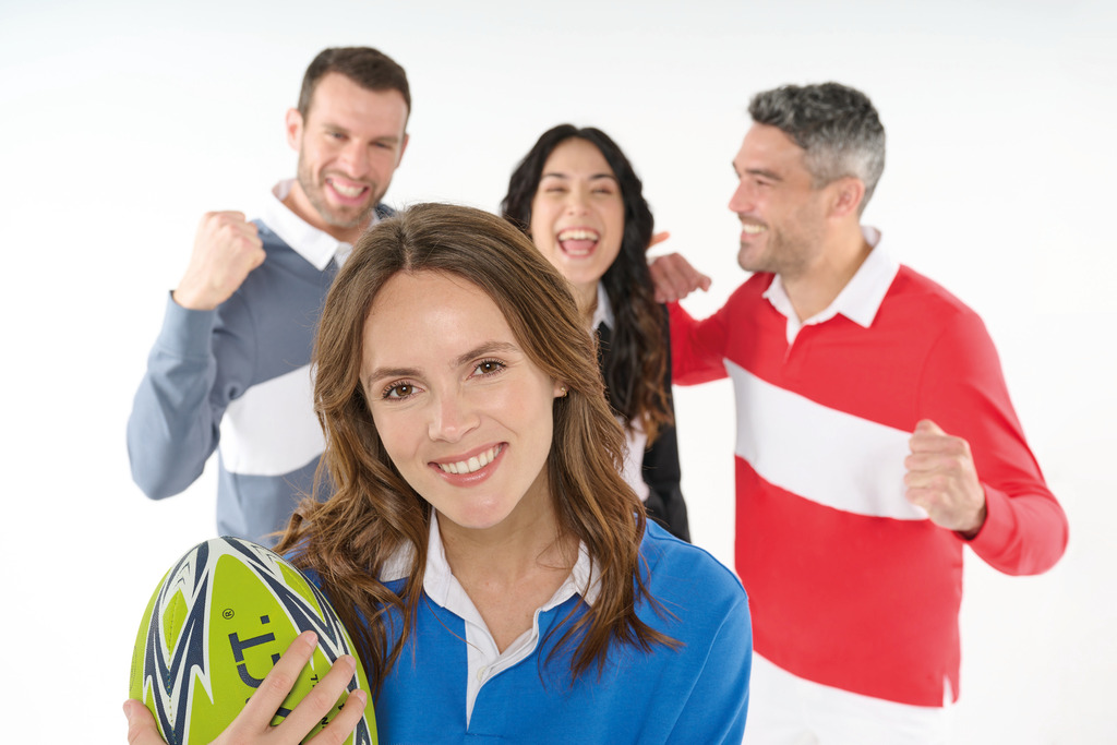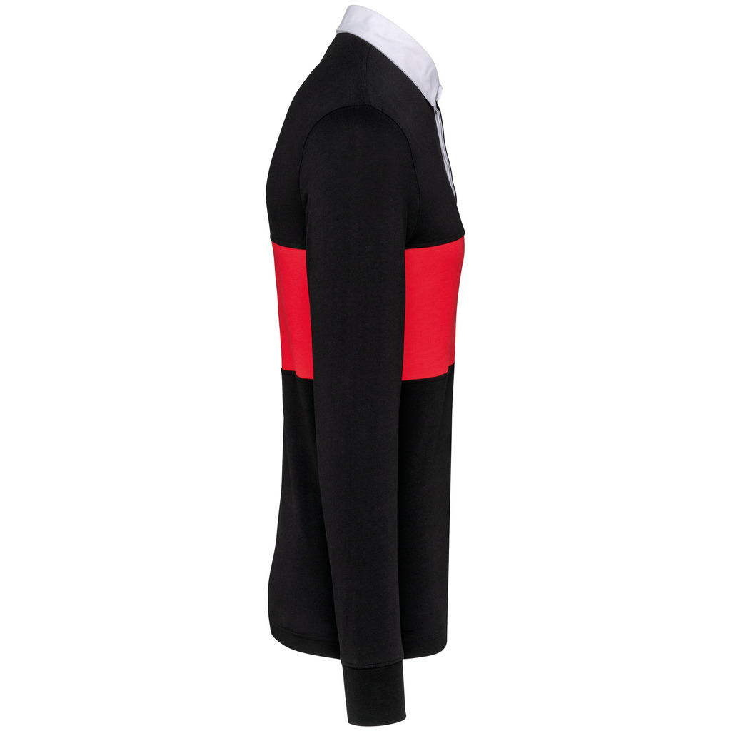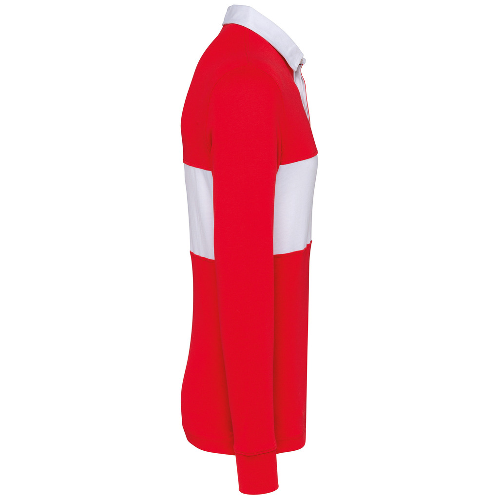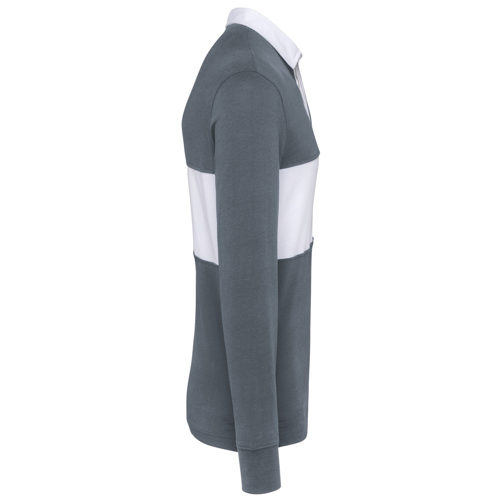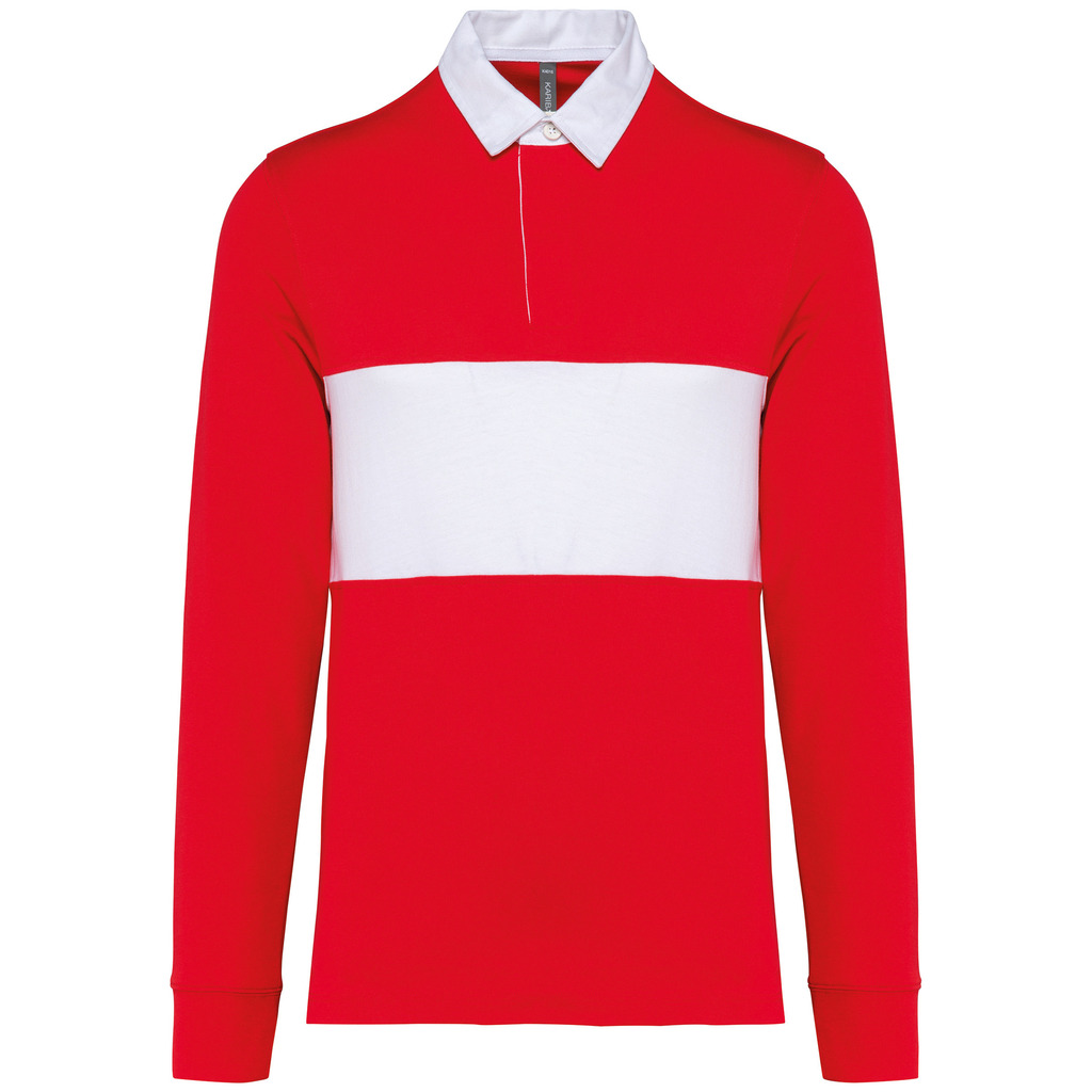 100% algodão. Tecido jersey. Corte direito. Colarinho e carcela interior em sarja de algodão branco. Carcela com 3 botões de borracha. Punhos em malha rib 1 x 1. Tapa-costuras na gola em chevron tom sobre tom. Faixa central frontal e nas costas em contraste. Bainha, aberturas laterais e banda em chevron tom sobre tom. Costura com pesponto duplo nas cavas e nos punhos. Acabamentos costura dupla na bainha. Etiqueta de marca amovÃvel.