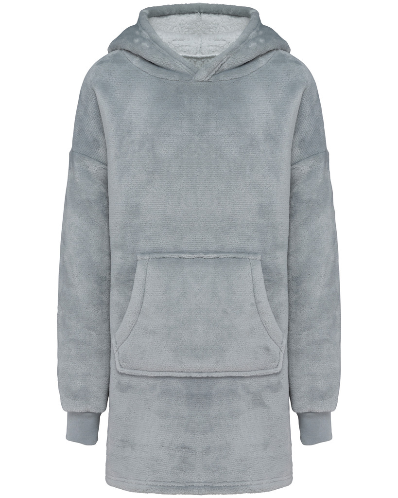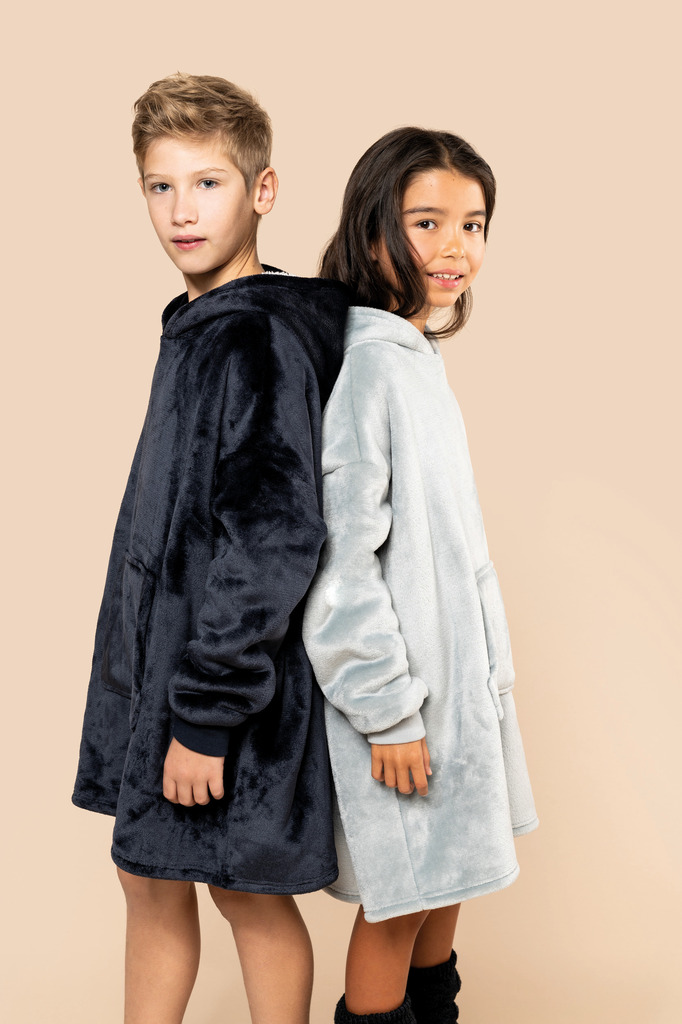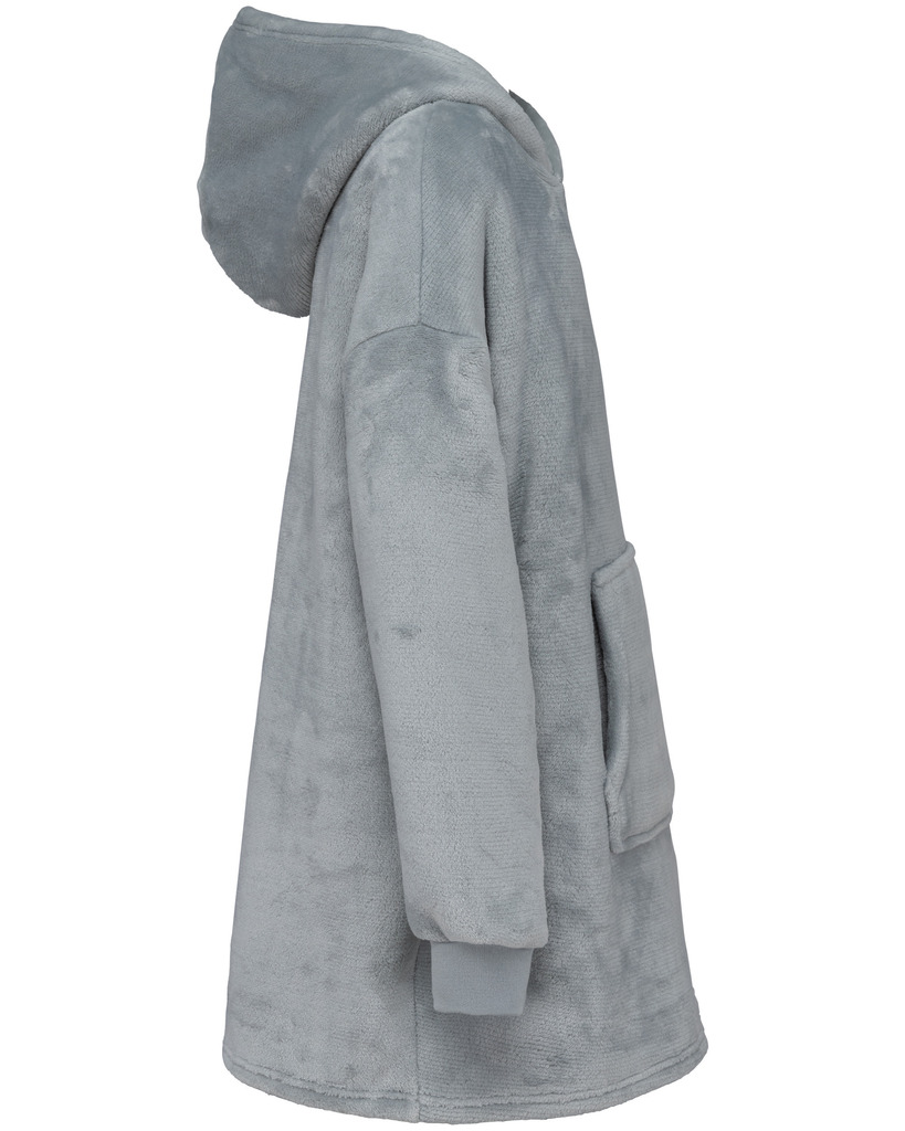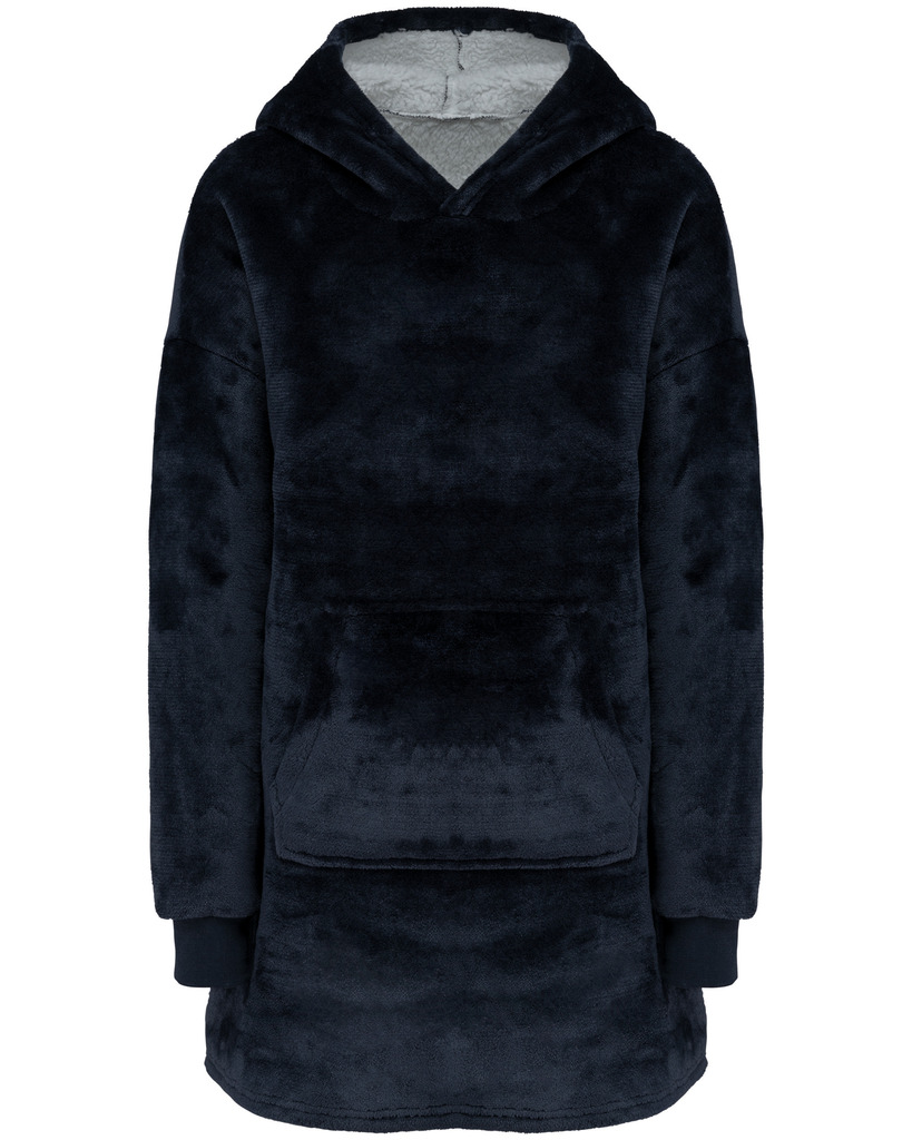 100% poliéster. Corte oversize nos ombros descaídos. Tecido dupla face, exterior em veludo com interior em sherpa. Capuz cruzado à frente com dois painéis com acabamento pesponto duplo. Manga comprida com punho em malha rib 1 x 1 com acabamento tubular para melhor acabamento. Elastano na malha rib nos punhos para evitar que se deformem. Bolso à canguru. Acabamento da bainha com pesponto duplo. Sem etiqueta de marca na gola, apenas indicação de tamanho amovível para facilitar a personalização.