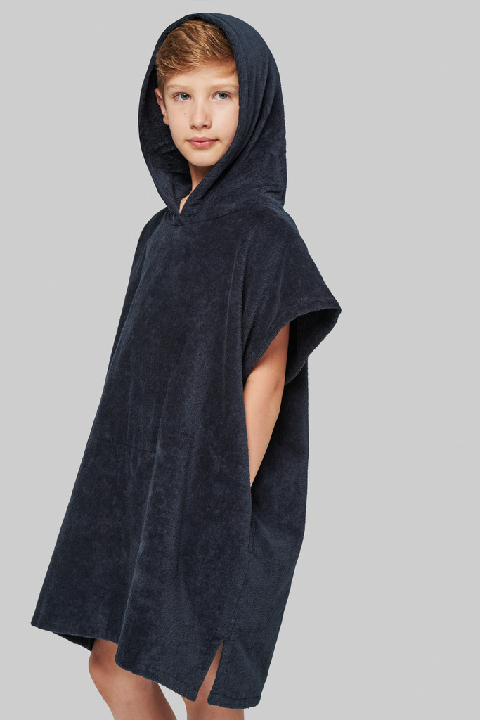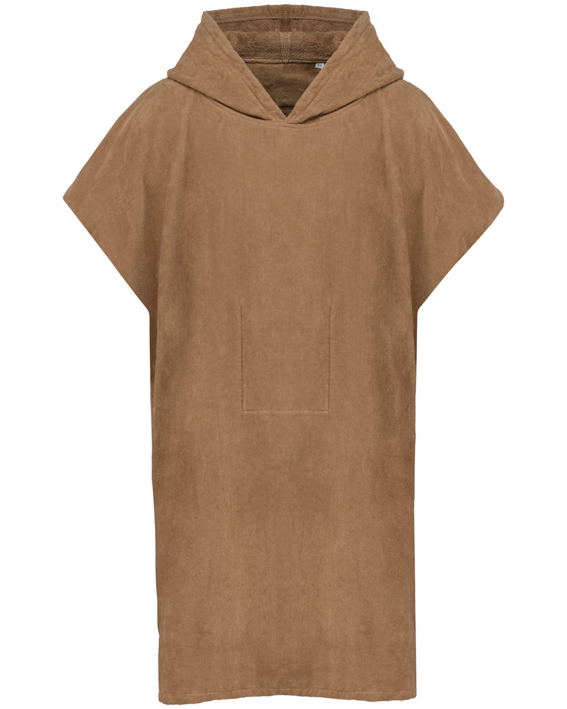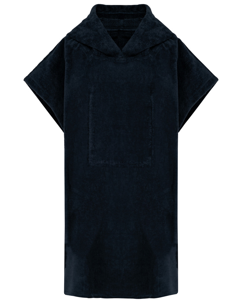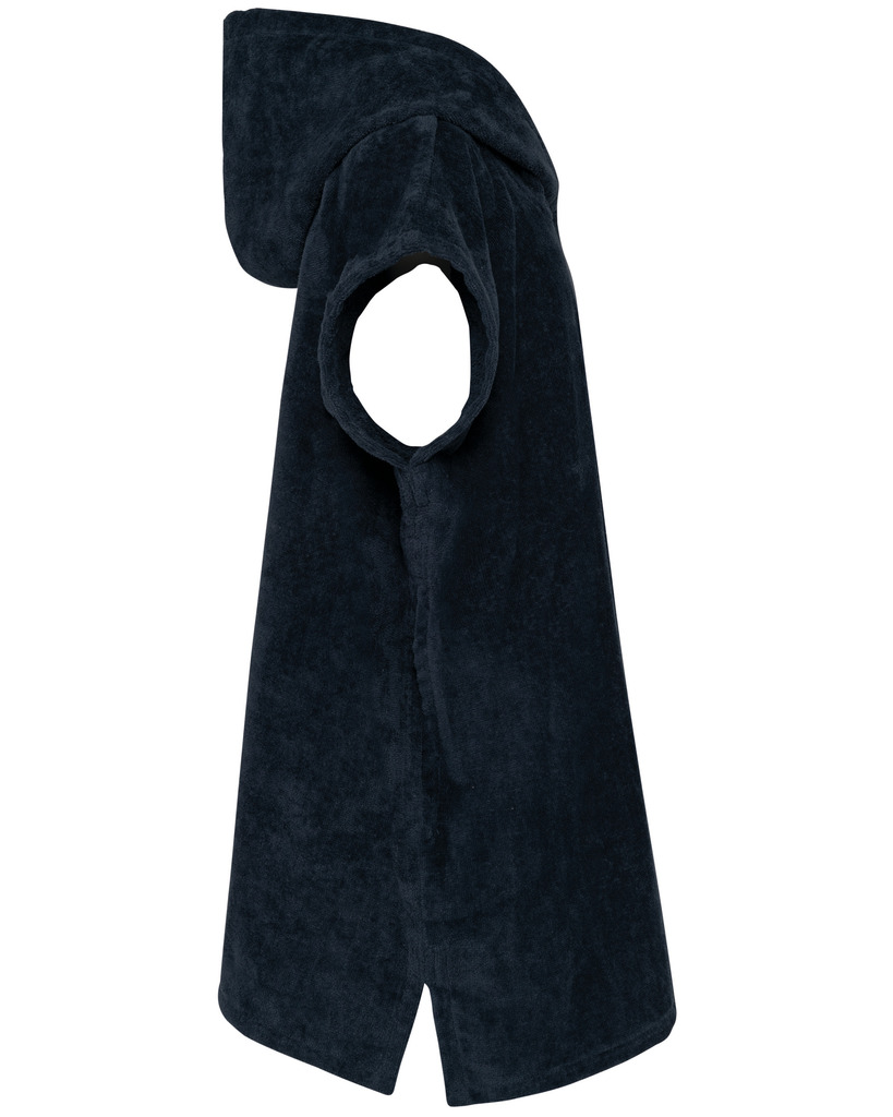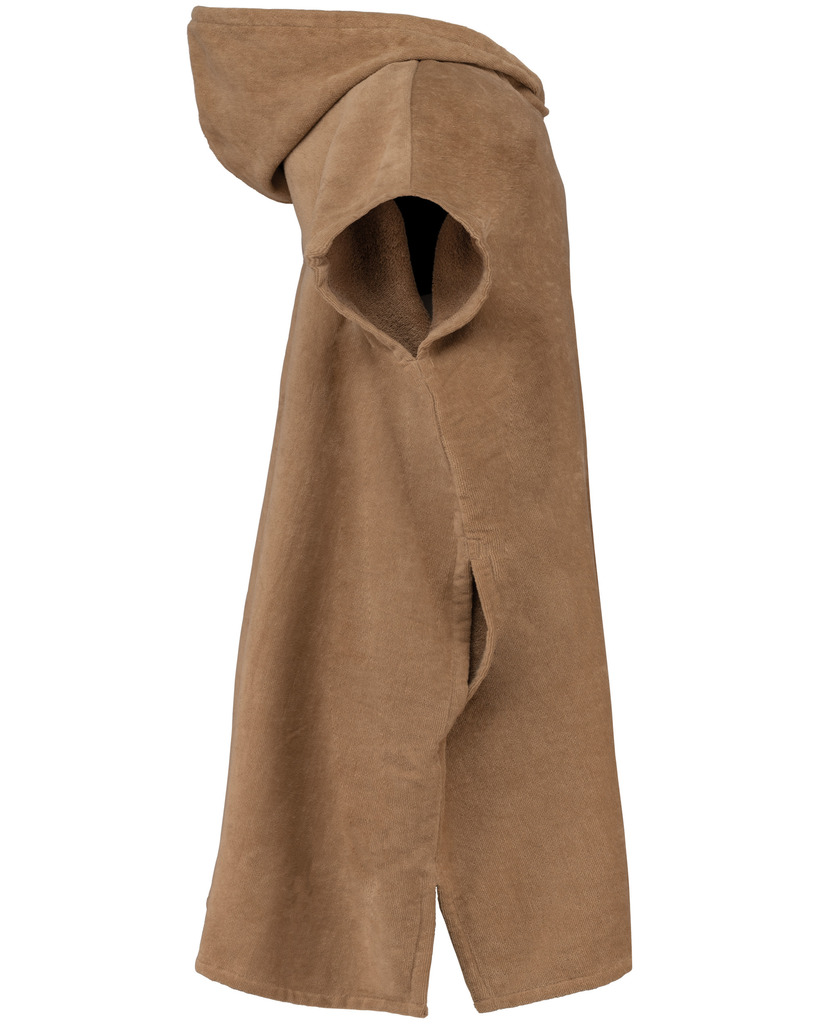 100% algodão biológico. Tecido Terry. Capuz cruzado na frente. Bolso grande central aberto no interior da peça. 2 aberturas laterais a meio para facilitar o vestir e o despir. 2 aberturas laterais com costuras de reforço. Acabamento em meia-lua nas costas para facilitar a personalização de marca no interior. Etiqueta da marca Tear-away.
