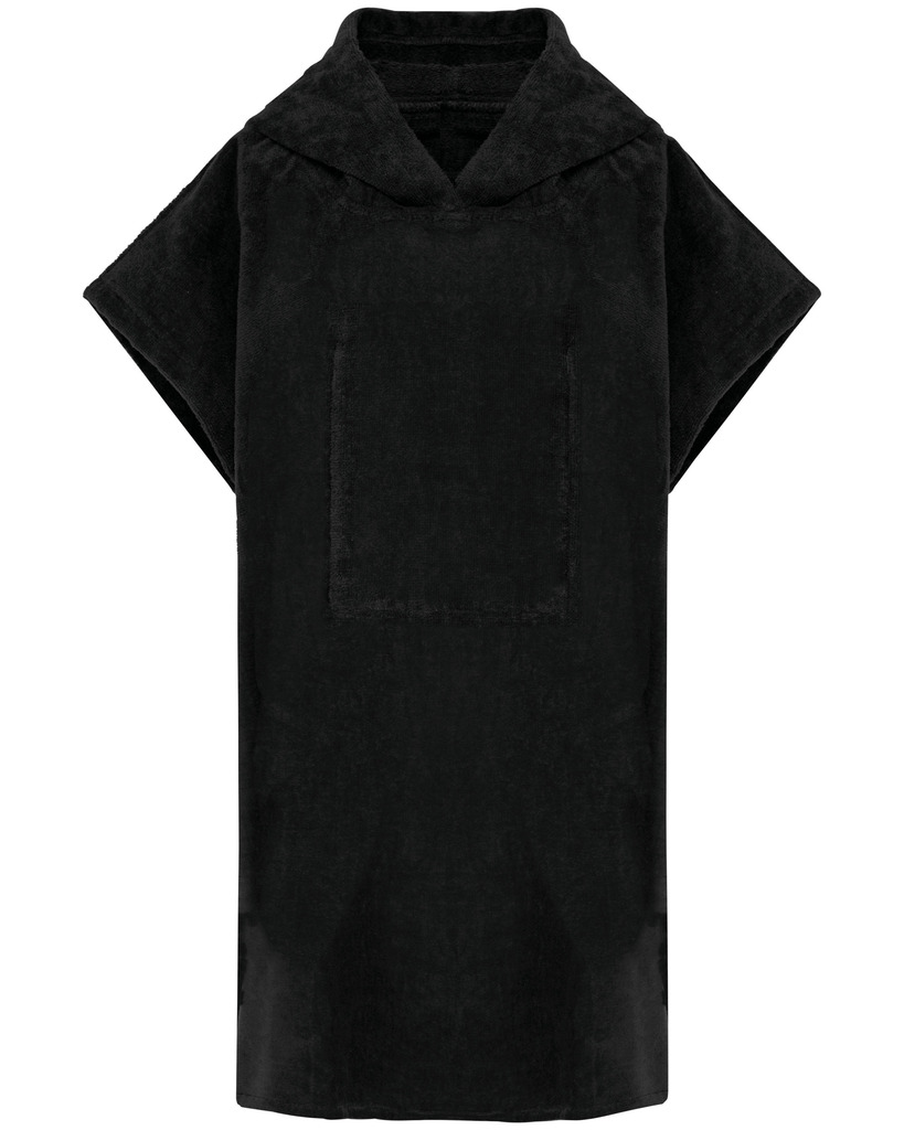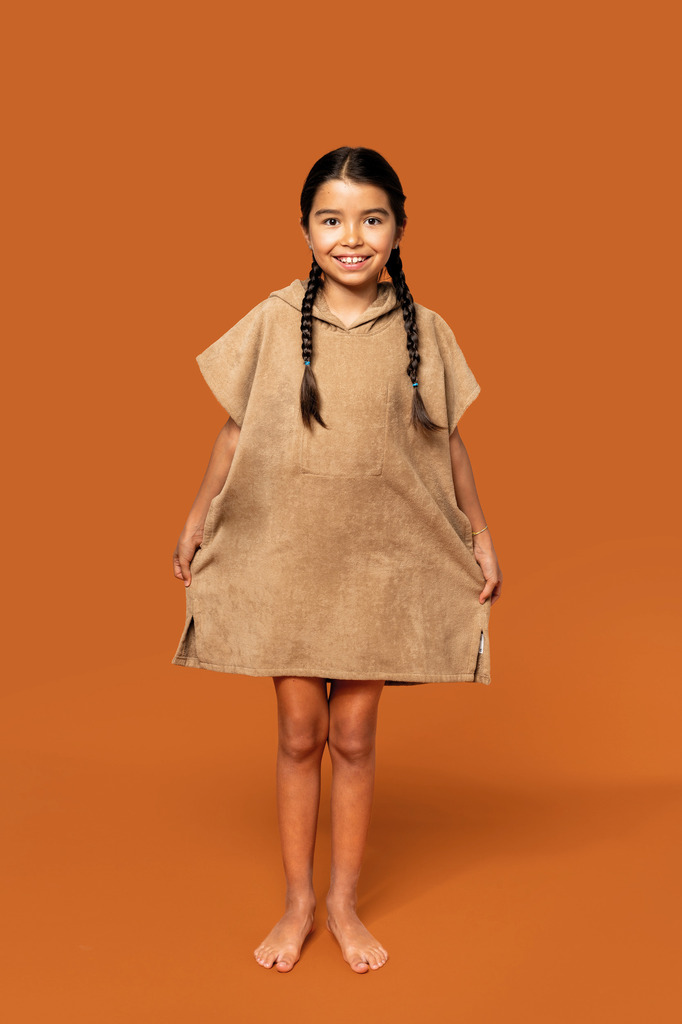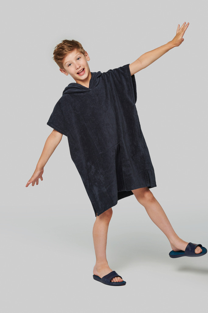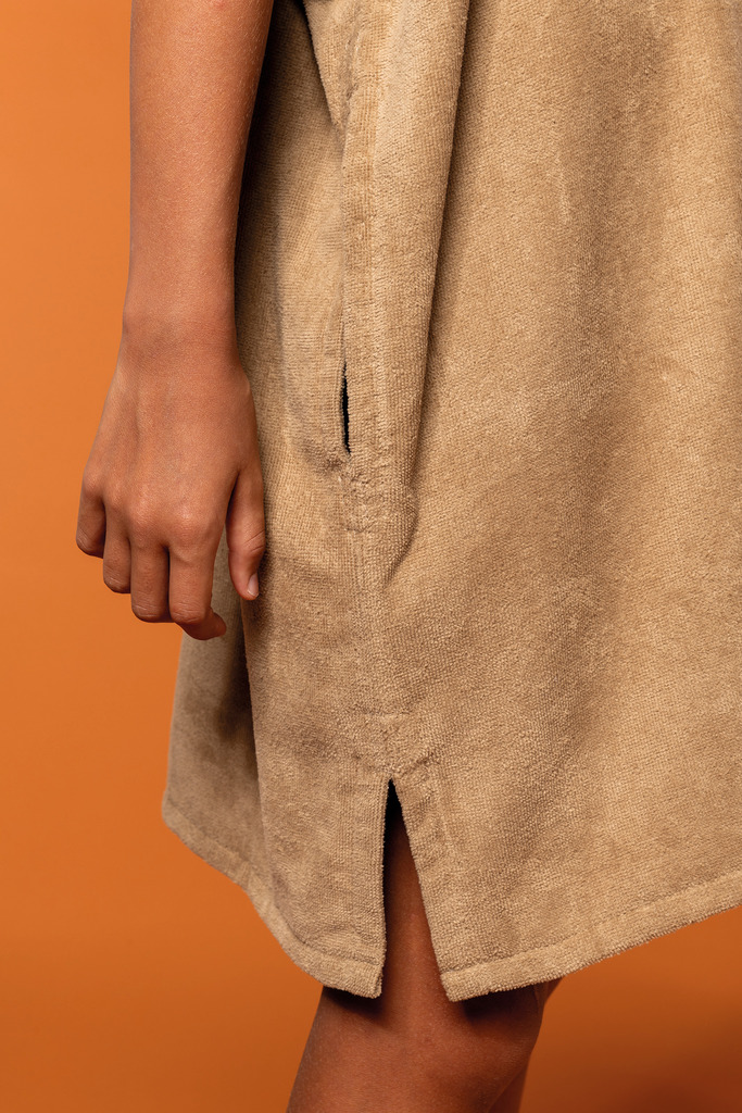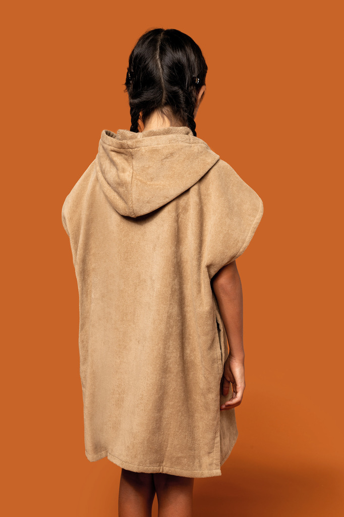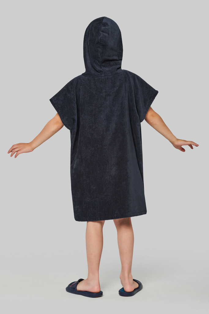 100% algodão biológico. Tecido Terry. Capuz cruzado na frente. Bolso grande central aberto no interior da peça. 2 aberturas laterais a meio para facilitar o vestir e o despir. 2 aberturas laterais com costuras de reforço. Acabamento em meia-lua nas costas para facilitar a personalização de marca no interior. Etiqueta da marca Tear-away.