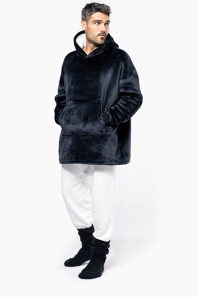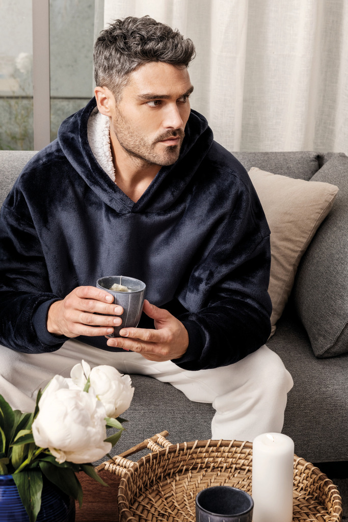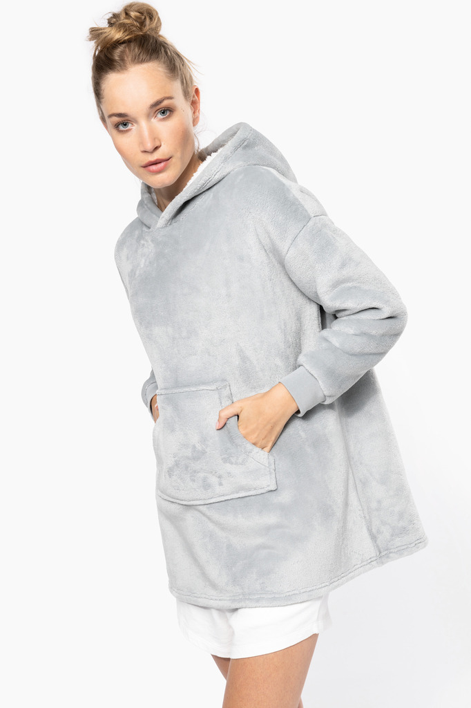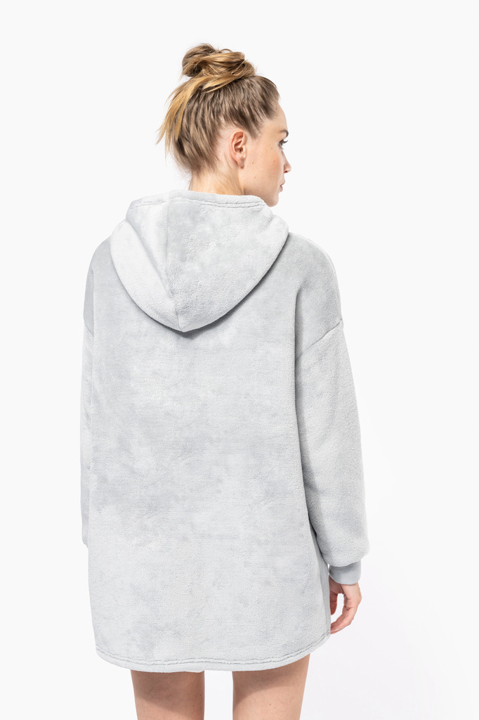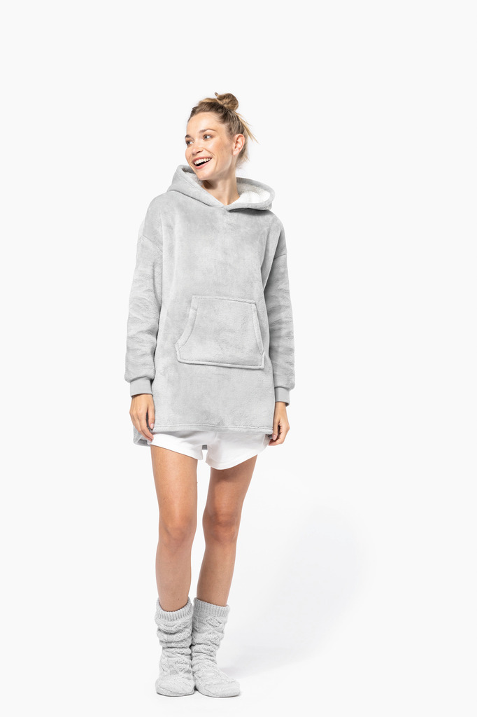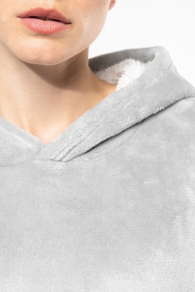 100% poliéster. Corte oversize com ombros descaídos. Tecido dupla face, exterior em veludo com interior em sherpa. Capuz cruzado na frente com dois painéis com pesponto duplo. Manga comprida com punho em malha rib 1 x 1. Elastano na malha rib para evitar que os punhos se deformem. Bolso canguru. Acabamento da bainha com pesponto duplo. Sem etiqueta de marca, apenas com indicação de tamanho para facilitar a personalização.