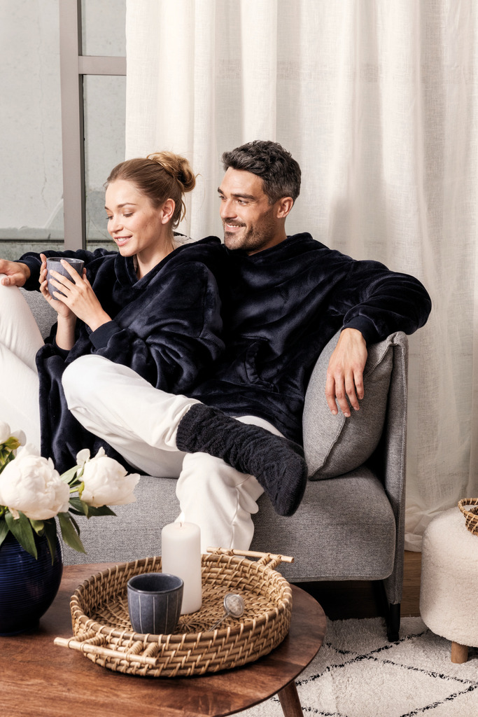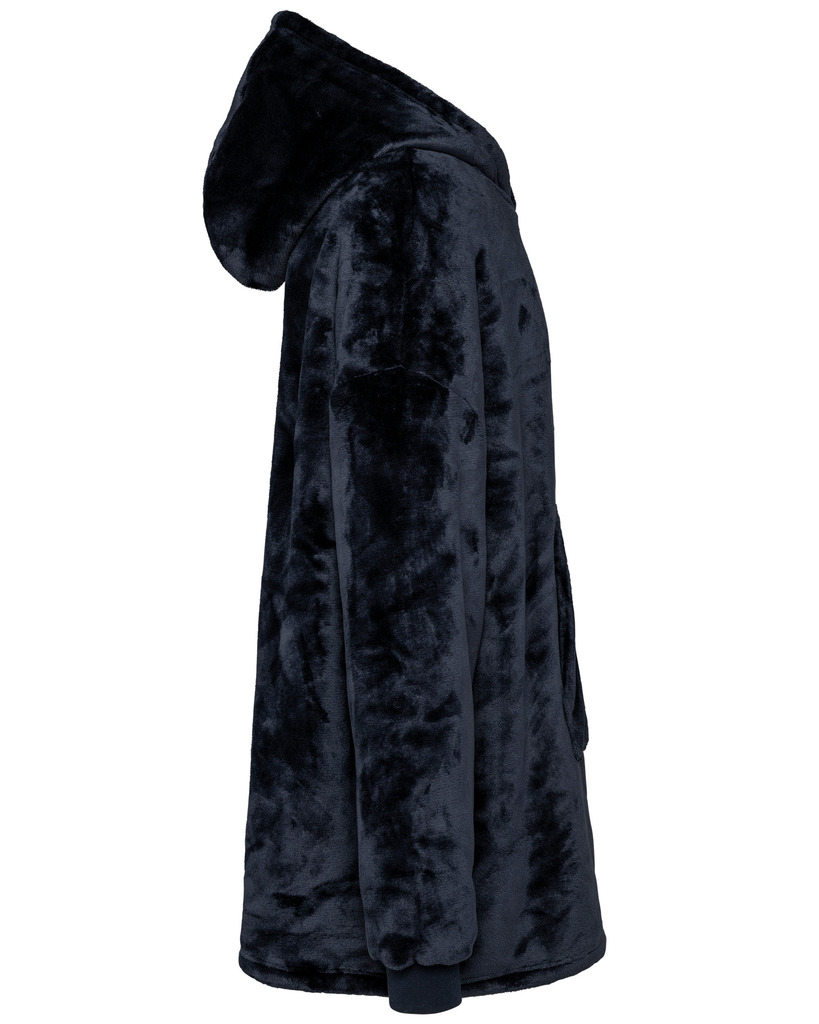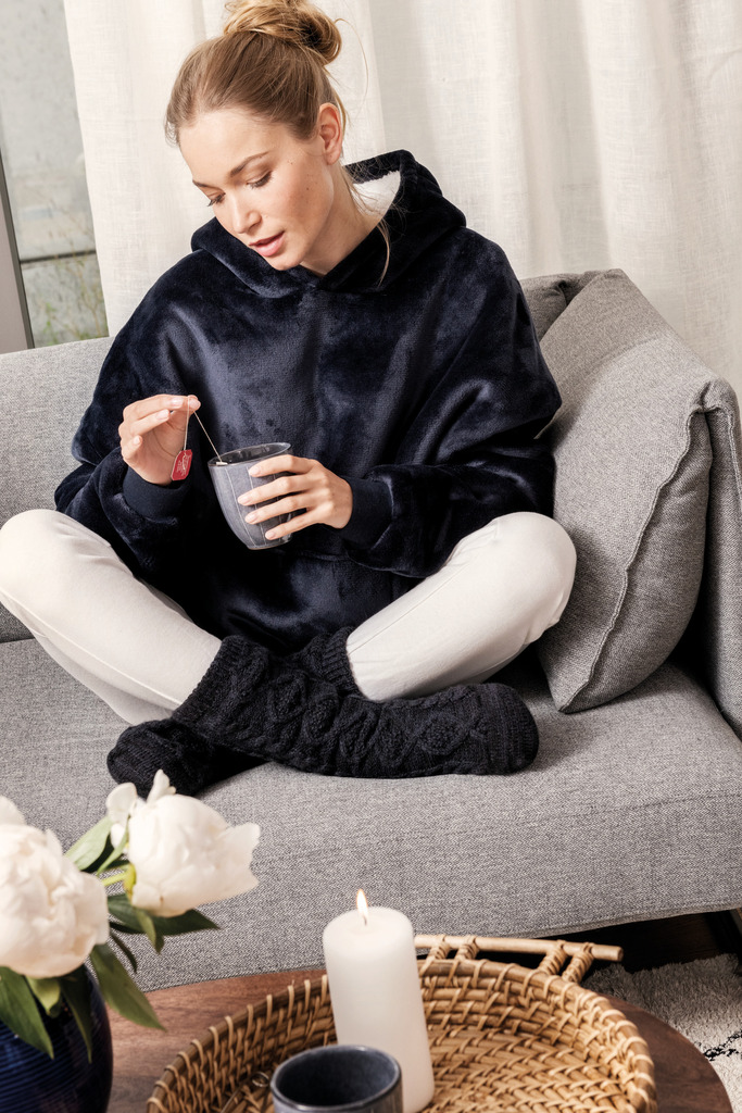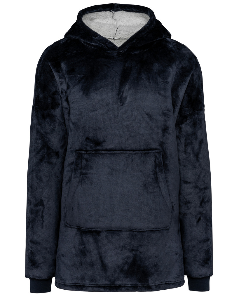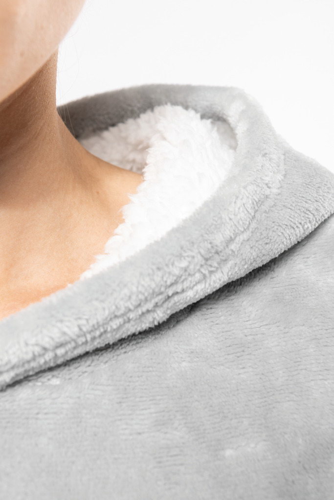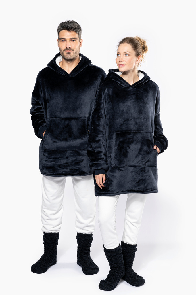 100% poliéster. Corte oversize com ombros descaídos. Tecido dupla face, exterior em veludo com interior em sherpa. Capuz cruzado na frente com dois painéis com pesponto duplo. Manga comprida com punho em malha rib 1 x 1. Elastano na malha rib para evitar que os punhos se deformem. Bolso canguru. Acabamento da bainha com pesponto duplo. Sem etiqueta de marca, apenas com indicação de tamanho para facilitar a personalização.