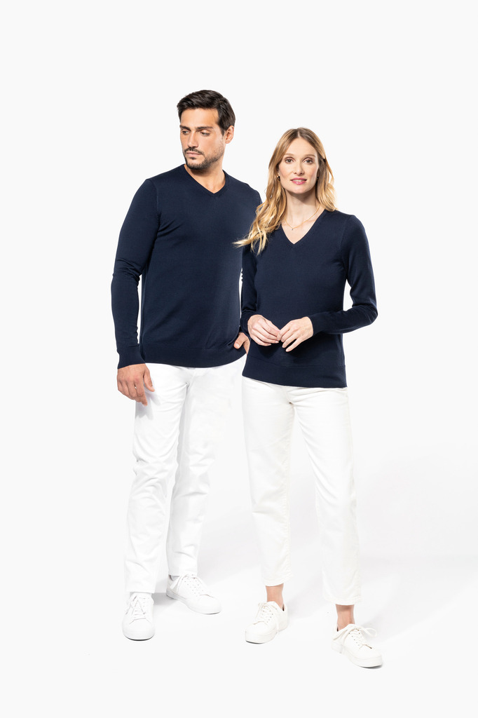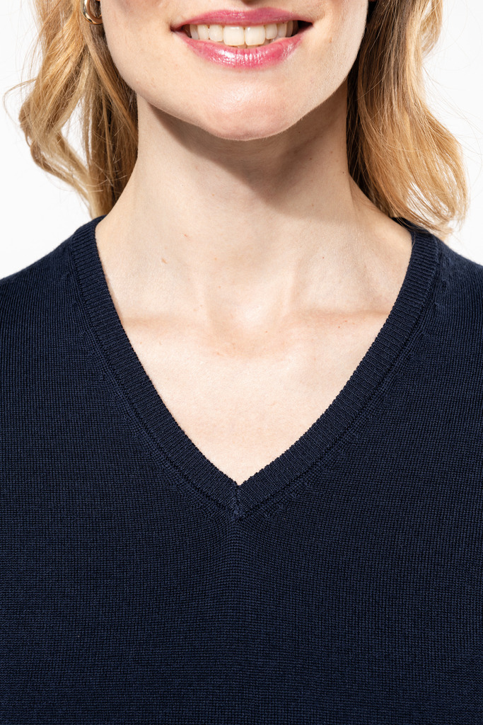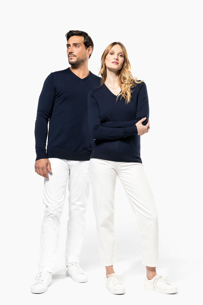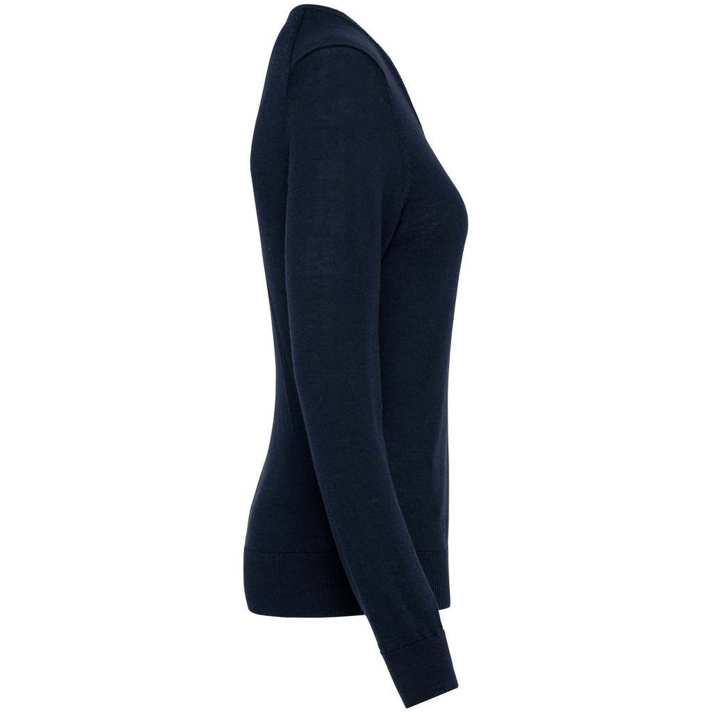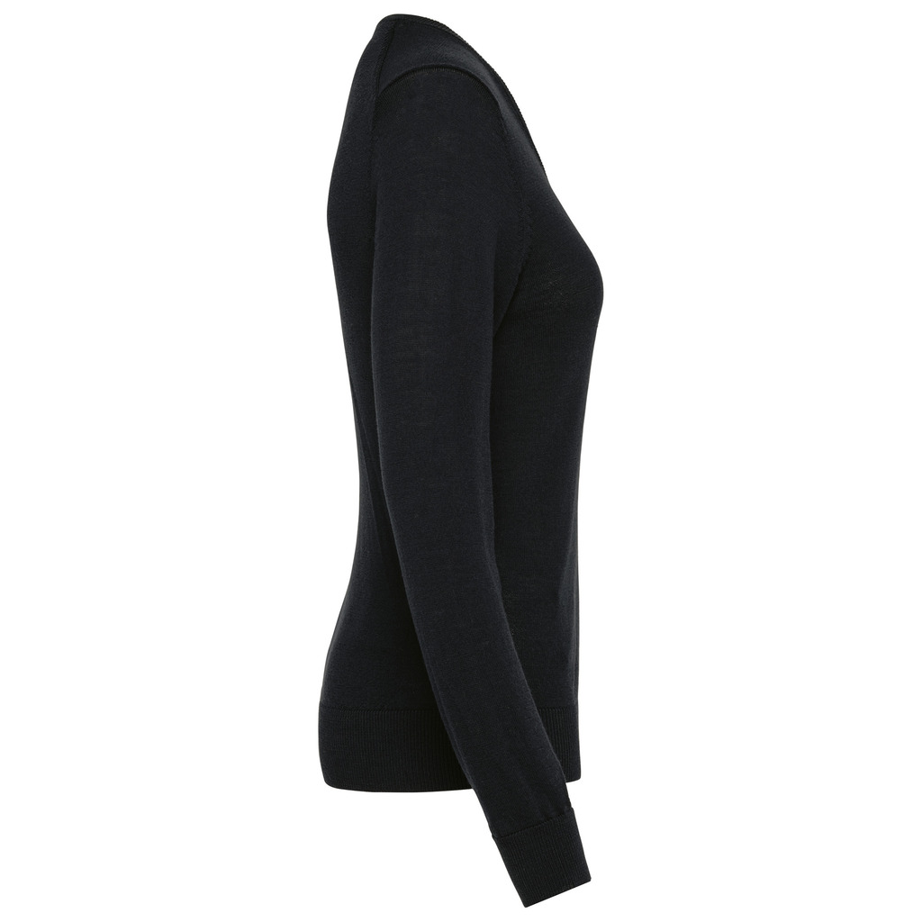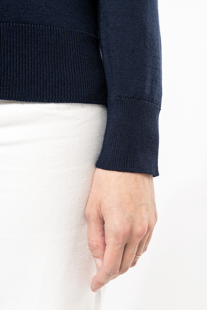 100% Lã Merino extrafina penteada. Arqueado 14. Muito fashion: tricotada na forma e montada na máquina das malhas. Decote, punhos e bainha em malha rib 1 x 1.