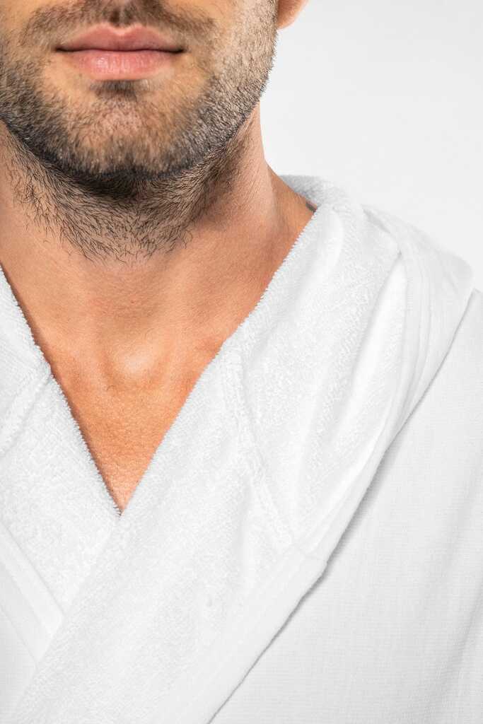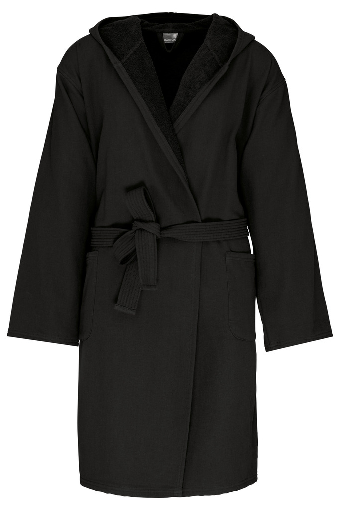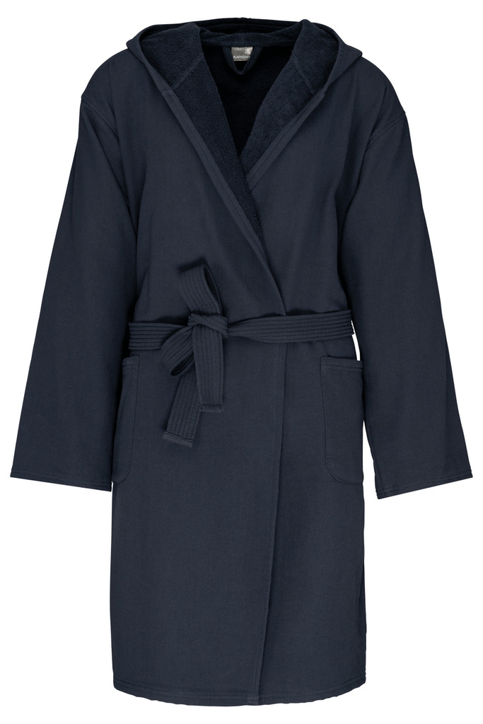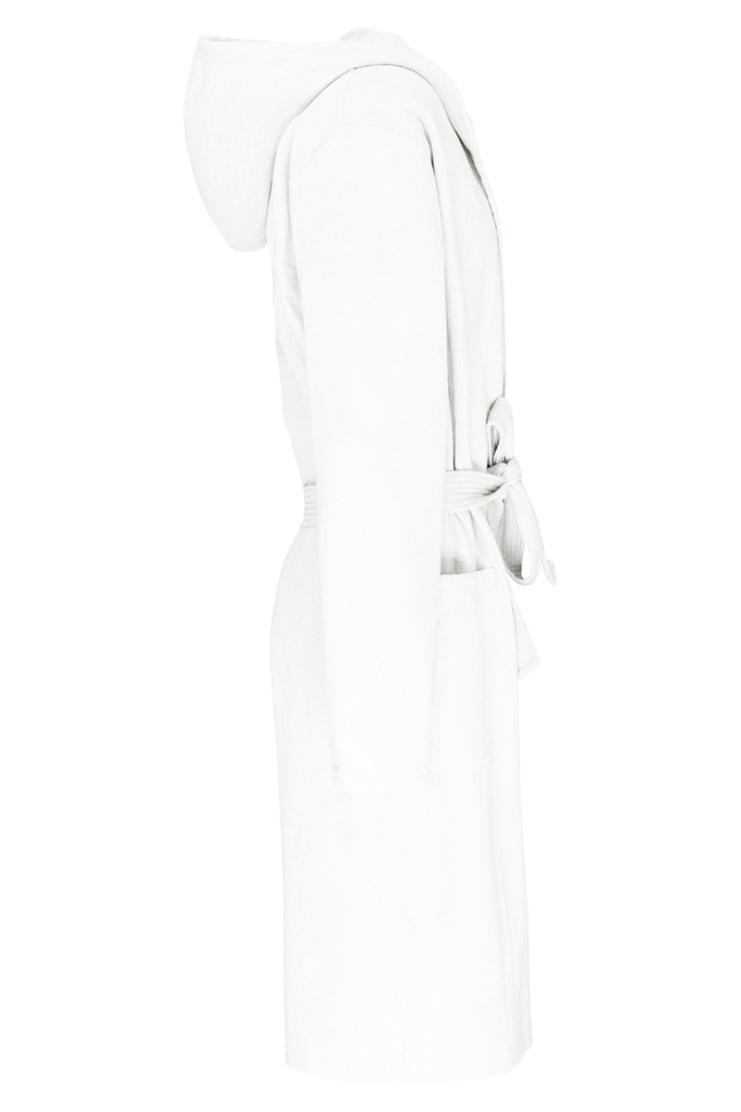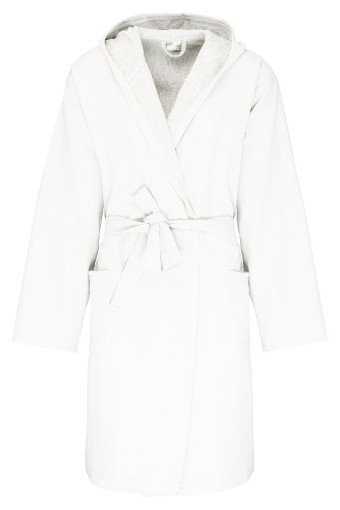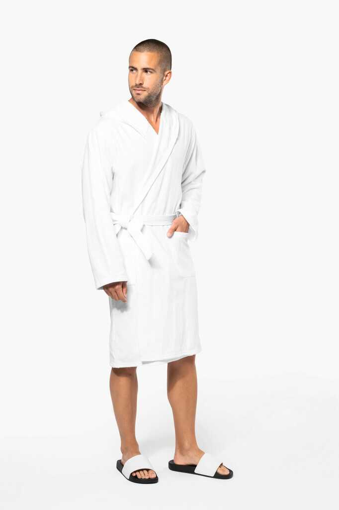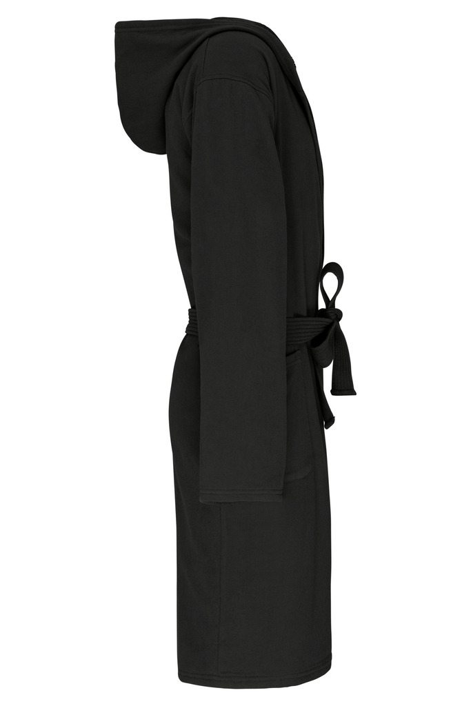 100% algodão biológico. Malha Terry. Toque suave e agradável de usar. Capuz grande. 2 bolsos laterais cosidos com pesponto de reforço na parte superior. Presilhas na cintura. Presilha para pendurar. Acabamento com costura dupla na borda do capuz, nas mangas e na bainha. Acabamento tubular na bainha e nas mangas.