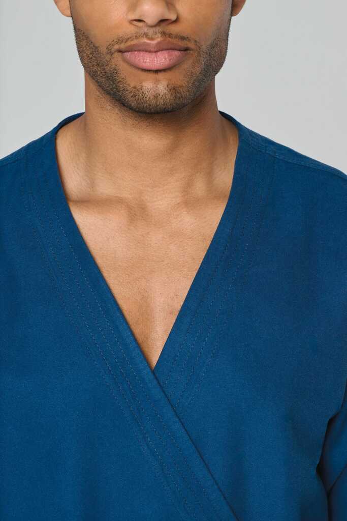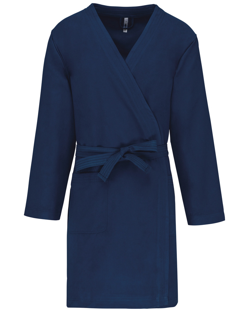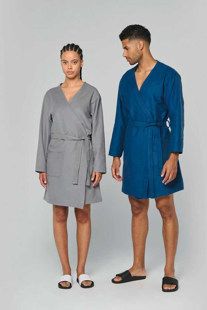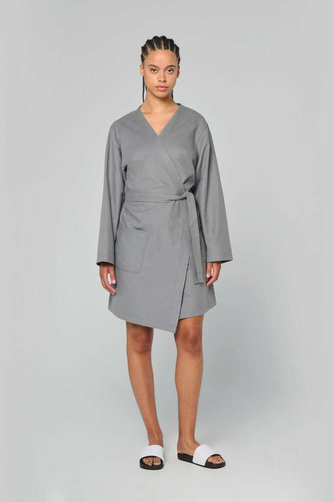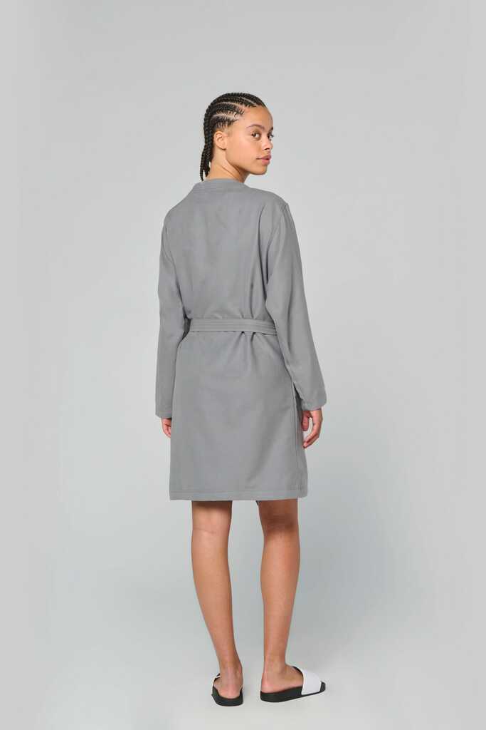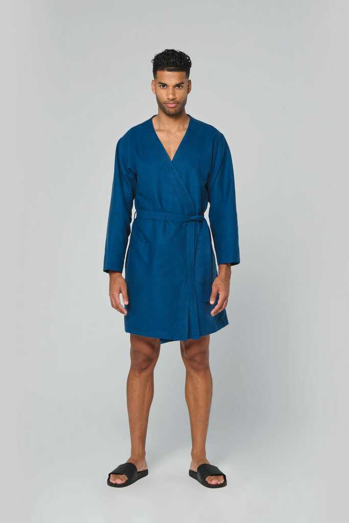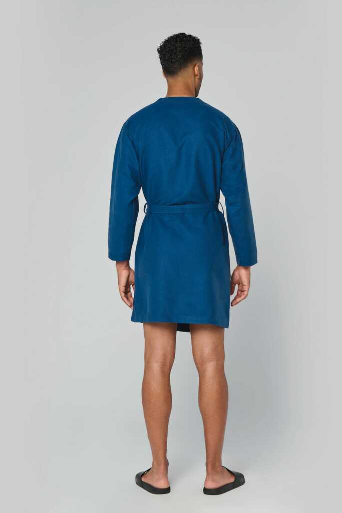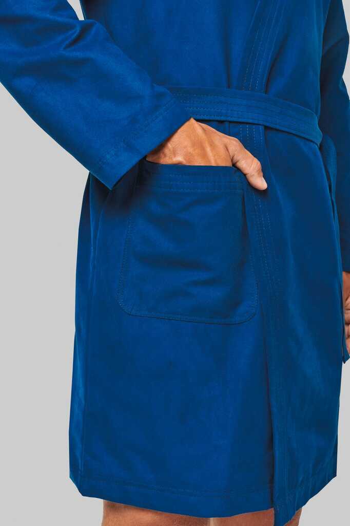 85% poliéster/15% poliamida. Muito leve, permitindo uma secagem rápida e eficaz. Cinto largo e dois bolsos frontais.
