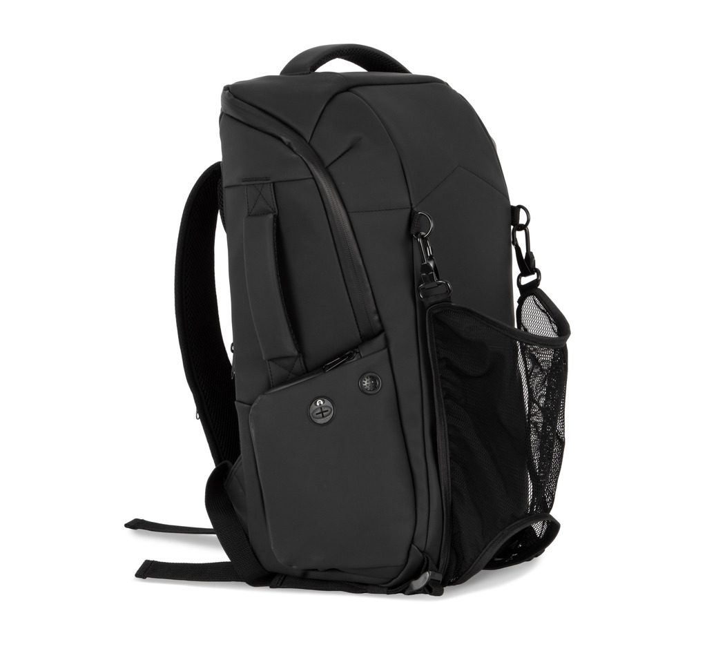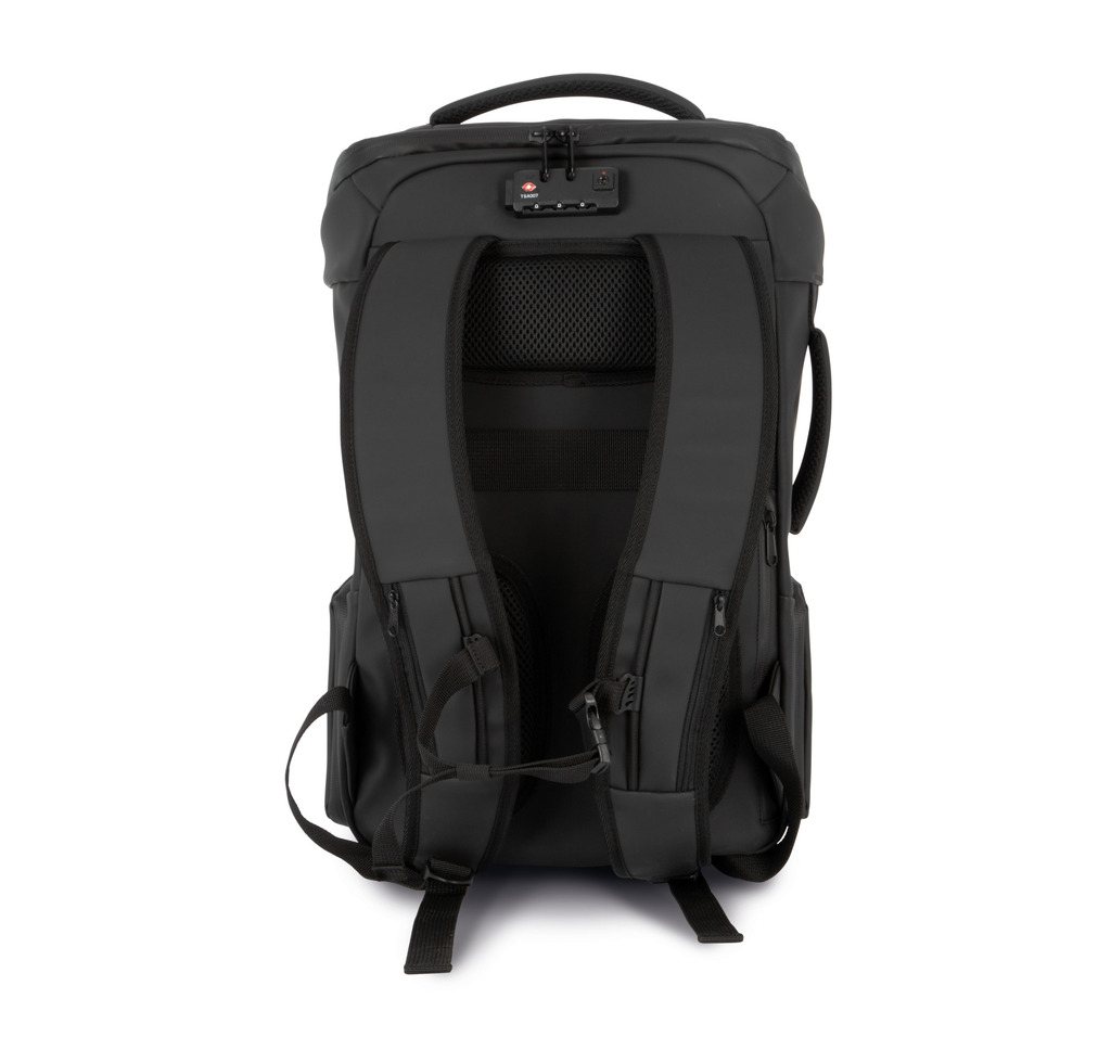 100% poliuretano. Saco anti-roubo impermeável. Particularidades: rede elástica amovÃvel porta-capacete; sistema de bloqueio TSA por código; bolso lateral com cabo anti-roubo; bolso interior com protecção RFID; bolso na parte traseira com fecho; bolsos com fecho nas alças; fivelas para fixação no saco; dois bolsos laterais com porta USB e micro-USB; compartimento interior para computador e tablet; dois bolsos interiores com fecho e em malha de rede; dois bolsos interiores para garragas/cantis e powerbank; dois bolsos amovÃveis com fecho para acessórios; reforço acolchoado na parte traseira; alças ajustáveis; e alça de peito regulável.