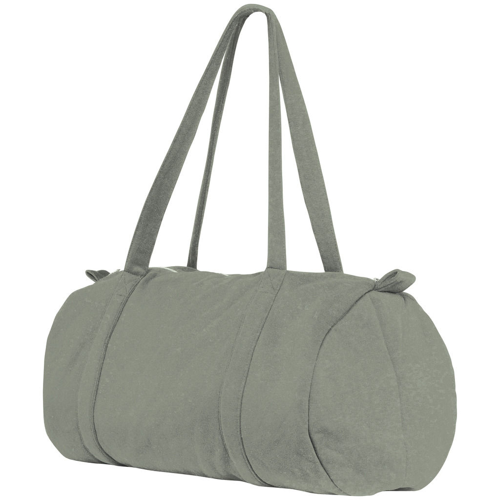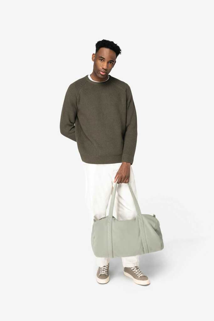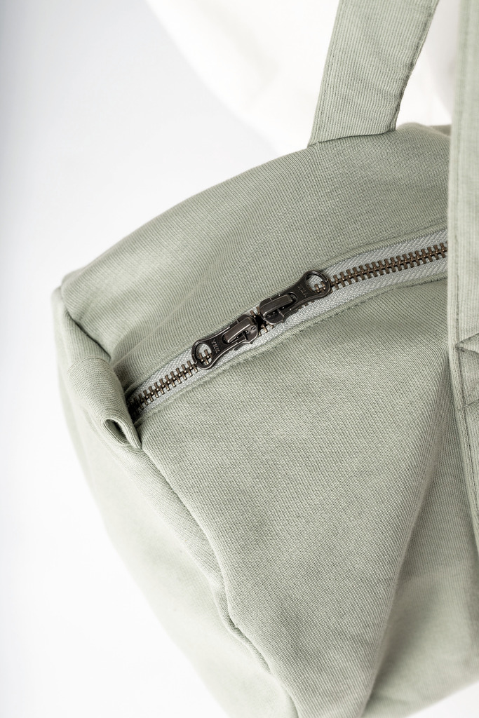 Exterior: 85% algodão biológico / 15% poliéster reciclado pós-consumo. Forro: 75% algodão reciclado / 22% poliéster reciclado / 3% outras fibras. ONE SIZE (25 x 50 x 25 cm). Capacidade: 25 l. Algodão penteado. Tecido LSF 3 fios (Low Shrinkage Fleece: malha pré-encolhida). Banho de enzimas. Abertura com duplo fecho. Forrado com bolso interior com fecho e fecho para a personalização em nylon reciclado. Fecho de abertura em metal reciclado. Alças reforçadas.