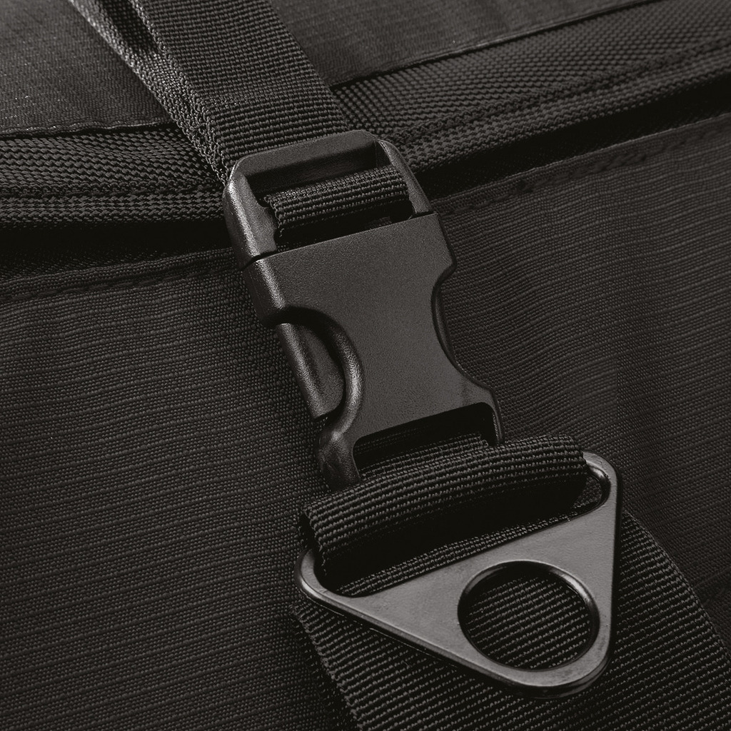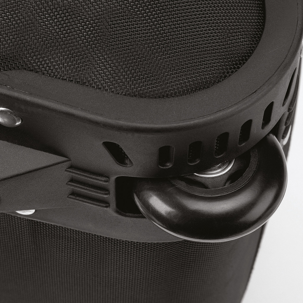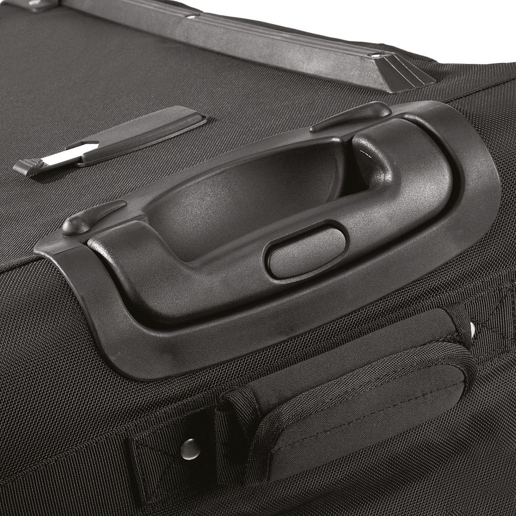 Poliéster 600D micro rip-stop, pega tubular dupla bloqueável e retráctil, pegas em malha, rodas integradas de alta resistência, alça a tiracolo amovível e ajustável com almofada para o ombro antiderrapante, fivelas de ajuste, correias interiores de ajuste, pega de transporte acolchoada em neopreno, pega de conforto acolchoada, espaço para o nome tapável, bolso frontal com fecho, bolsos interiores em malha em rede. Peso do produto: 3,7 kg.