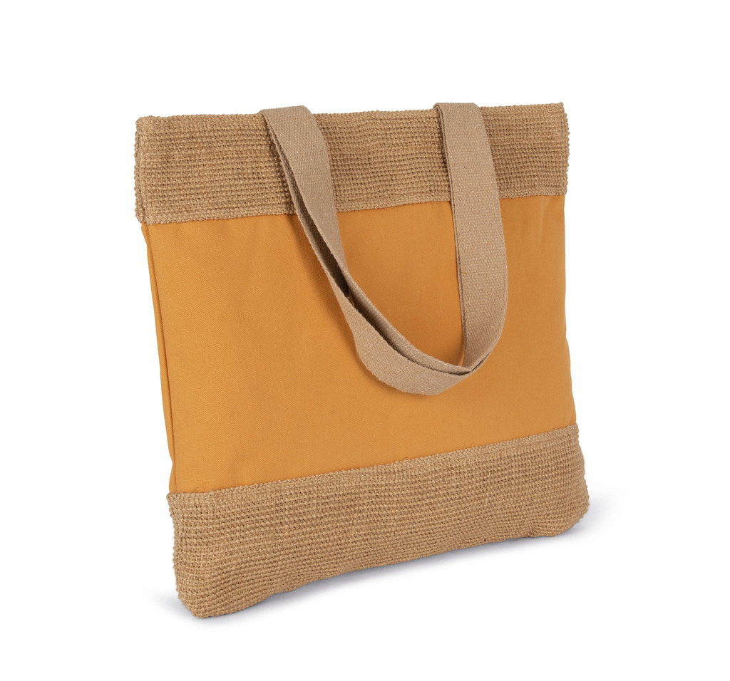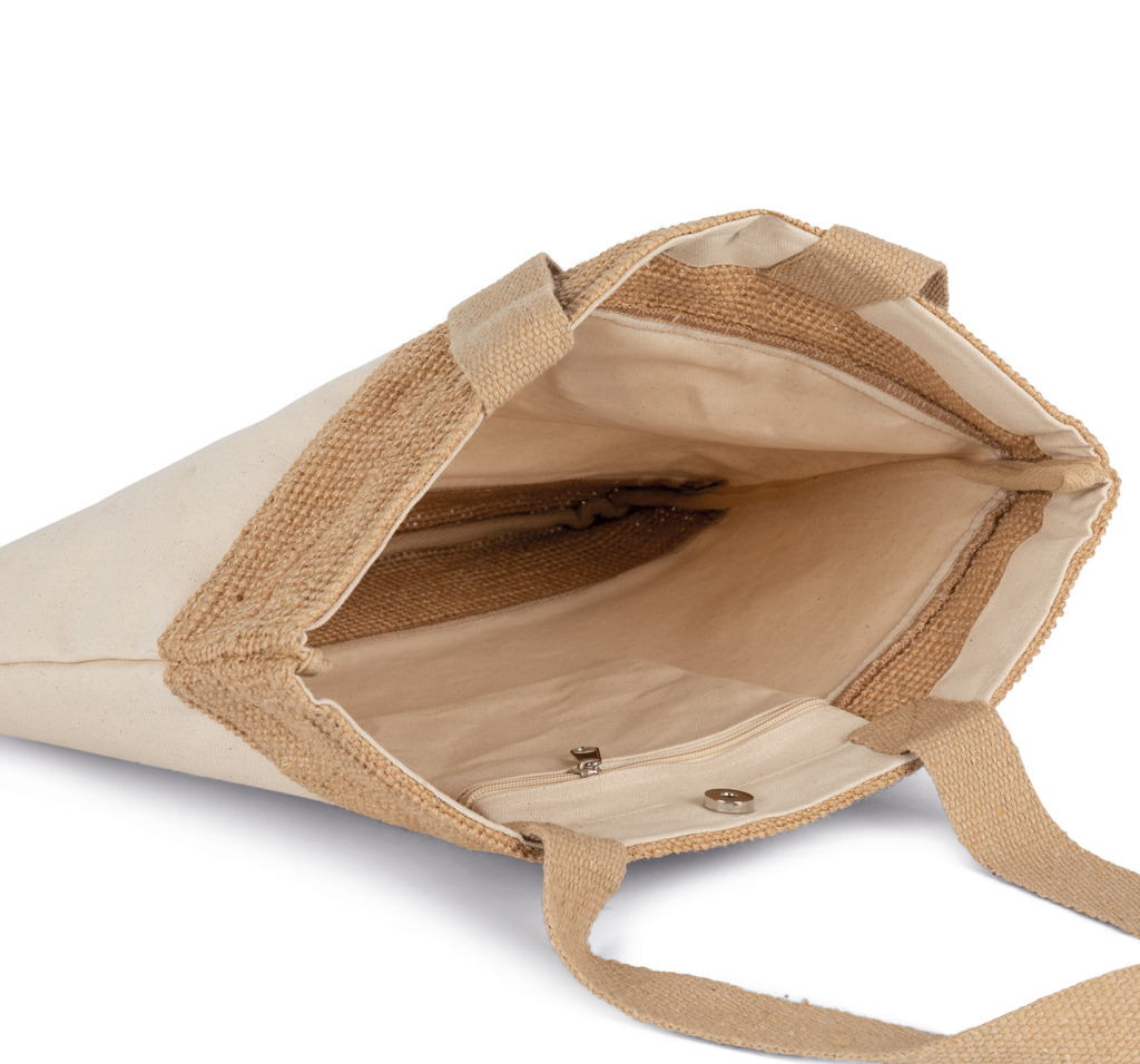 100% juta/100% algodão. Saco de compras composto por painéis superiores e interiores concebidos com fios de juta entrançada com efeito de malha e por um painel central concebido em algodão para facilitar a personalização. Bolso interior porta-objectos com fecho.