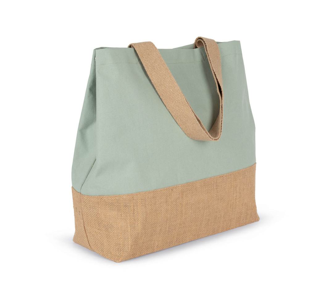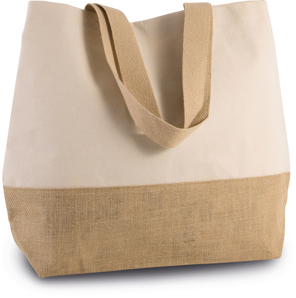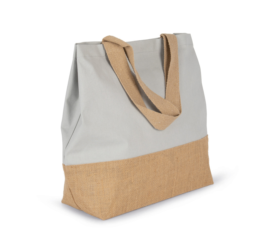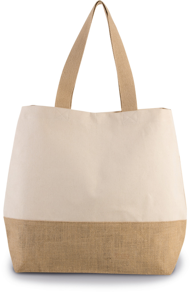 Saco grande multiusos em algodão com fundo laminado em juta natural. Bolso interior com fecho. Divisória. Pegas de 55 cm em algodão. Fecho com molas de pressão.