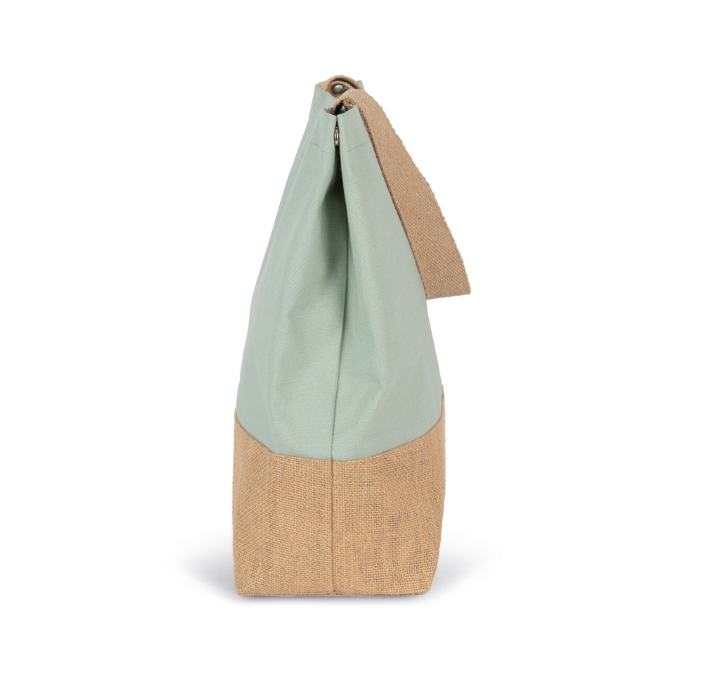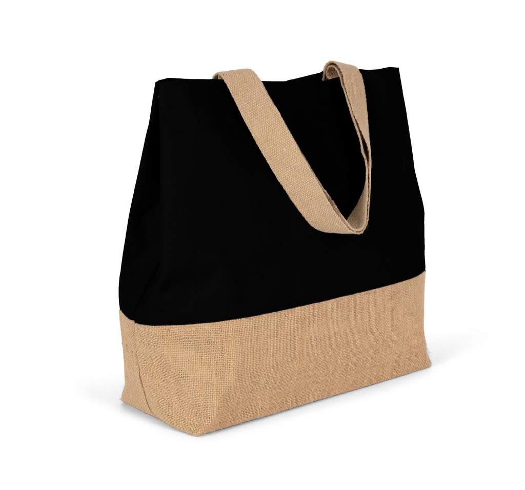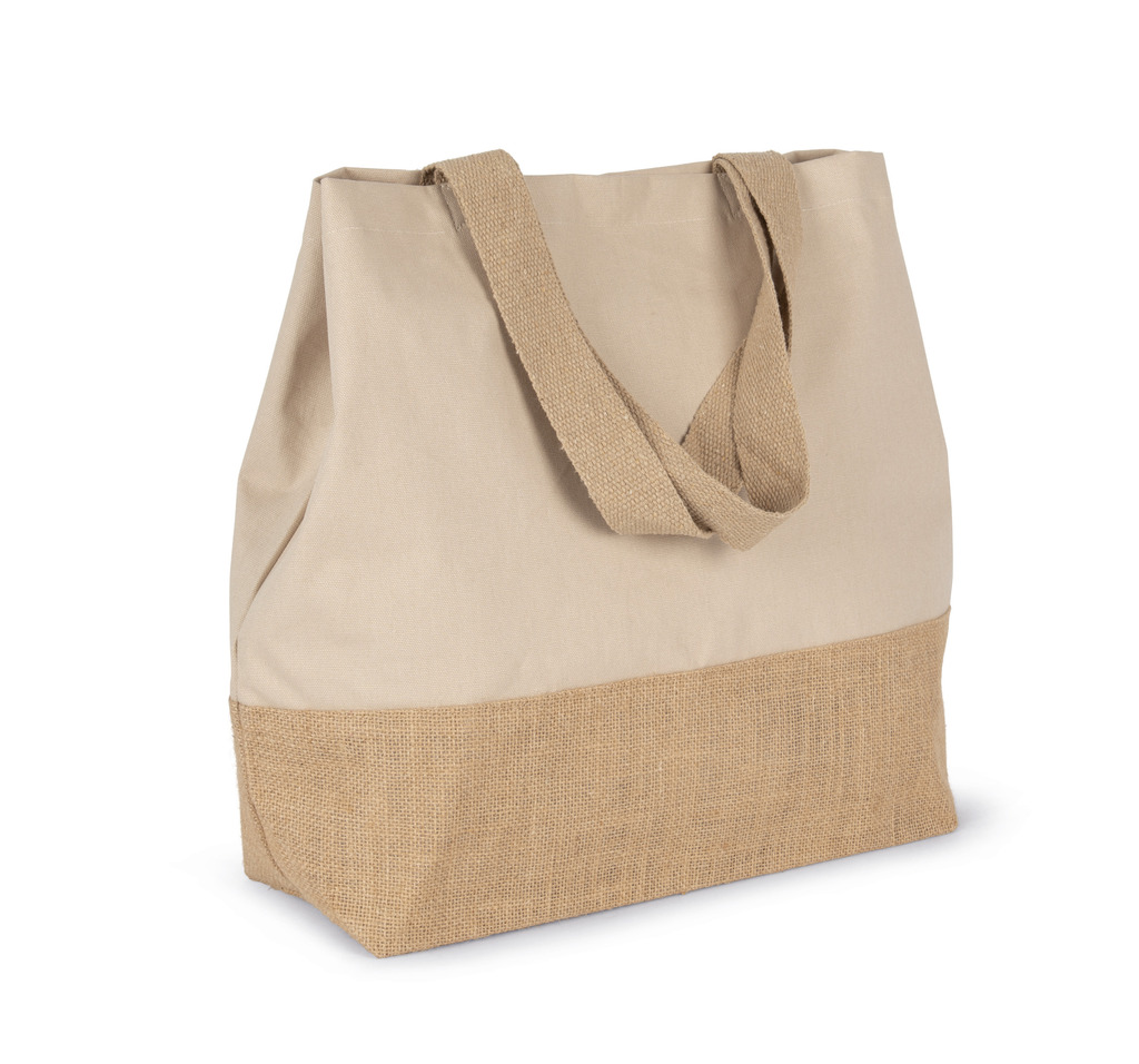 Saco grande multiusos em algodão com fundo laminado em juta natural. Bolso interior com fecho. Divisória. Pegas de 55 cm em algodão. Fecho com molas de pressão.