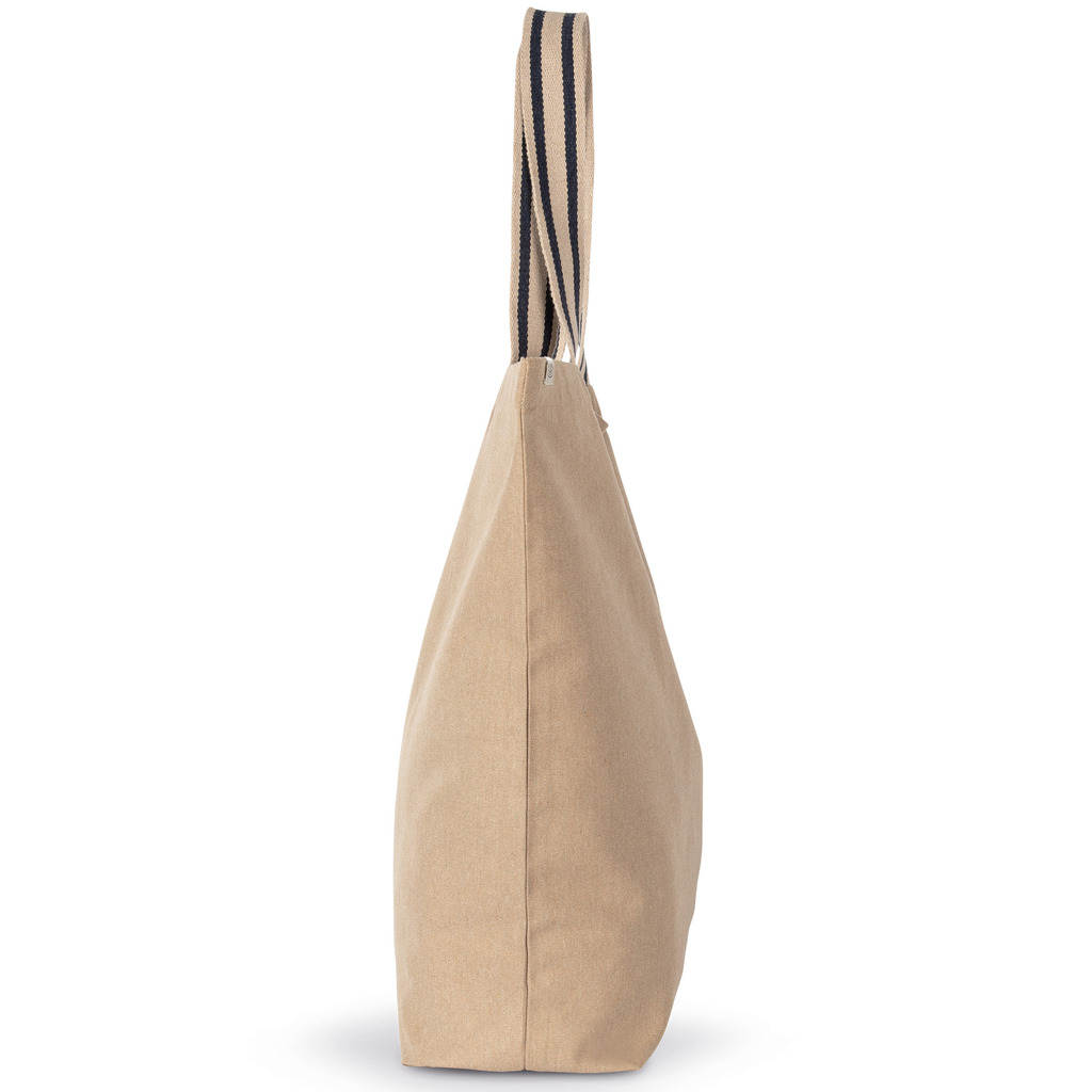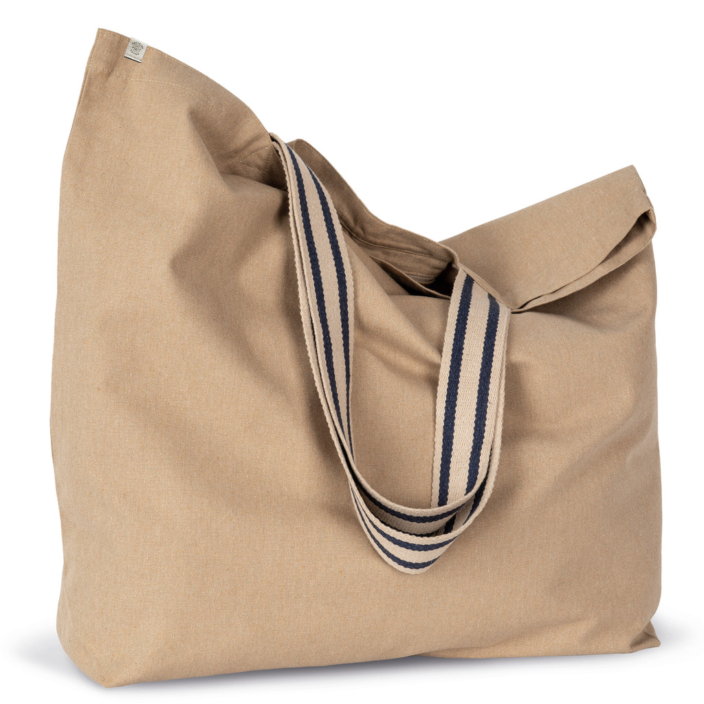 Hemp & Horizon Blue: 75% algodão reciclado pré-consumo / 22% poliéster reciclado pós-consumo / 3% outras fibras. Rosewood & Topaz blue: 67% algodão reciclado pré-consumo / 30% poliéster reciclado pós-consumo / 3% outras fibras. ONE SIZE (50 x 16 x 60 cm). Capacidade: 48 l. As alças com cores em contraste apresentam grafismos às riscas e medem 60 cm de comprimento e 4,25 cm de largura para conferir maior conforto.