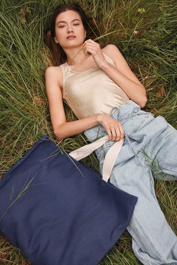 Saco de compras grande multiusos em malha e algodão com fole e alças com 55 cm em contraste. O fio de juco dá um aspecto rústico ao saco.