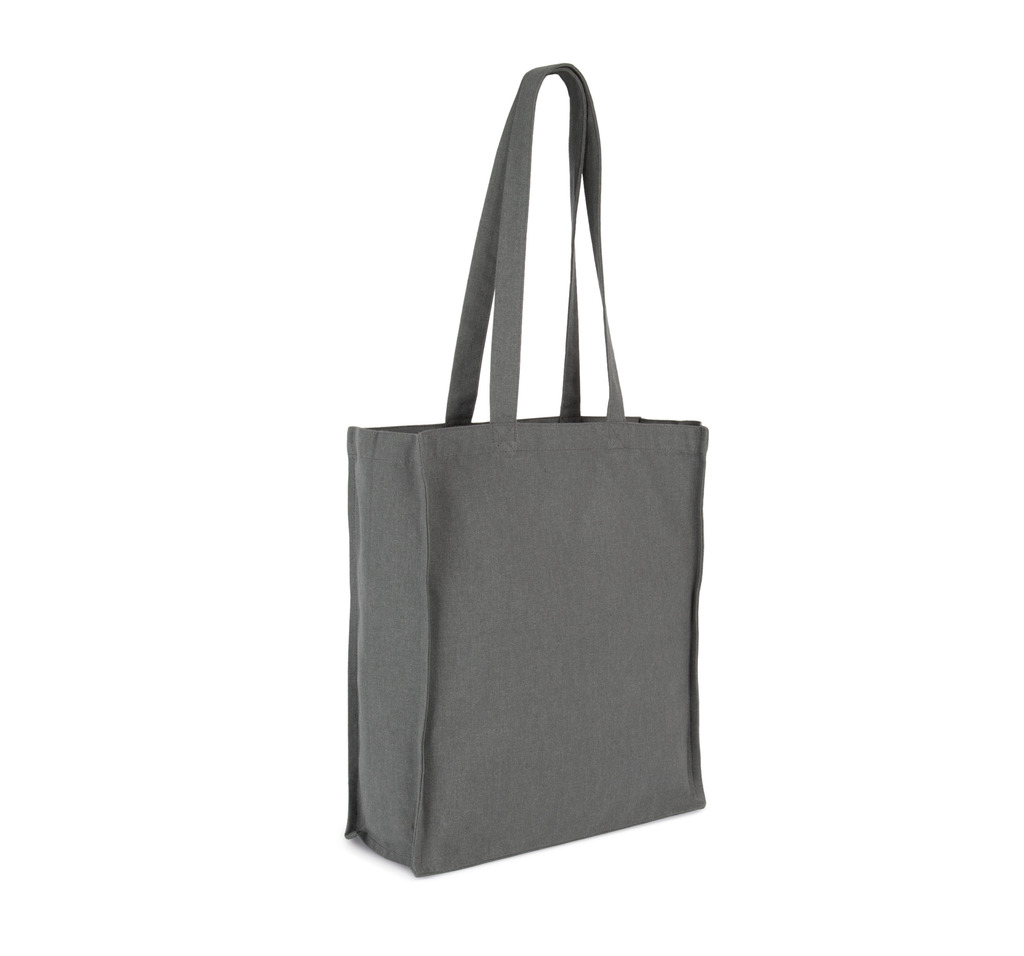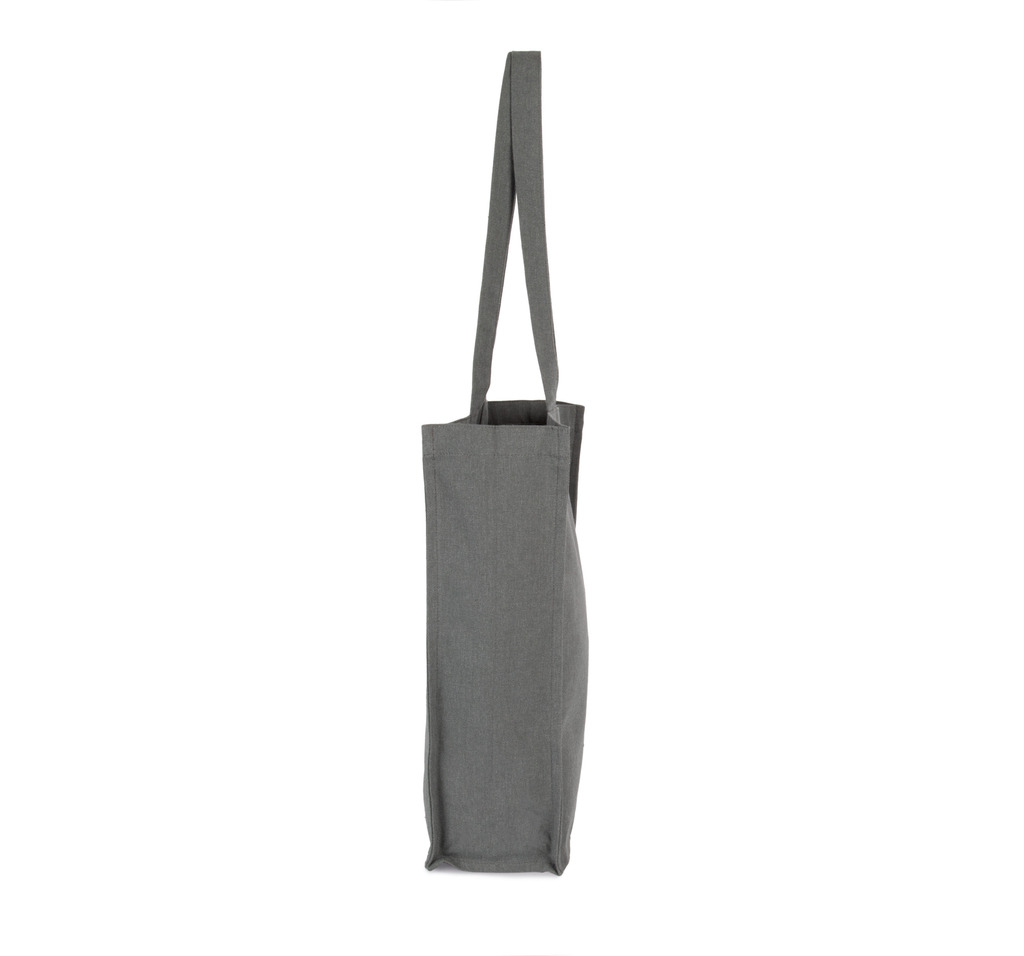 Algodão reciclado/Poliéster reciclado. Saco de compras rectangular com fole e alças no mesmo tecido do saco. Este saco faz parte do projecto «K-Loop». Através deste projecto, a Kimood encerra o circuito da economia circular no sentido estrito. O algodão utilizado provém dos resÃduos de fabrico dos artigos em algodão da marca Kariban, da gama KARIBAN BRANDS. O poliéster adicionado tem origem na reciclagem de garrafas de plástico em PET. Ao longo do processo de reciclagem, são incorporados no fio rastreadores, filamentos em viscose e cerâmica que funcionam como impressão digital única. Os rastreadores reflectem a luz de forma única e possuem, portanto, um código inequÃvoco e inviolável. Graças a isto. podemos memorizar, numa cadeia de blockchain, todas as informações acerca dos processos a que o fio foi submetido de forma unÃvoca. Graças à tecnologia de rastreadores Awareâ„¢ e à plataforma correspondente de blockchain, a Kimood possibilita ao consumidor final seguir o processo de produção na Ãntegra. Isto permite garantir que o produto foi bem reciclado, utilizando os seus próprios resÃduos, sem alterações possÃveis durante o processo. Uma etiqueta especial com um código QR permite aceder à plataforma Awareâ„¢ e autenticar directamente os certificados com um simples smartphone.