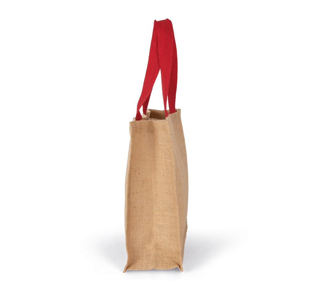 100% juta. Saco tamanho XL com alças de cor em contraste. O estiramento com amido vegetal permite enrijecer a juta, mantendo o saco na sua forma original.