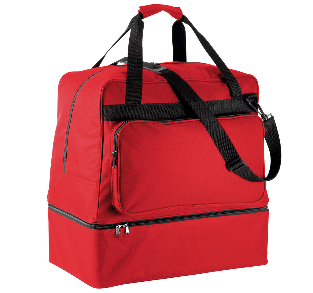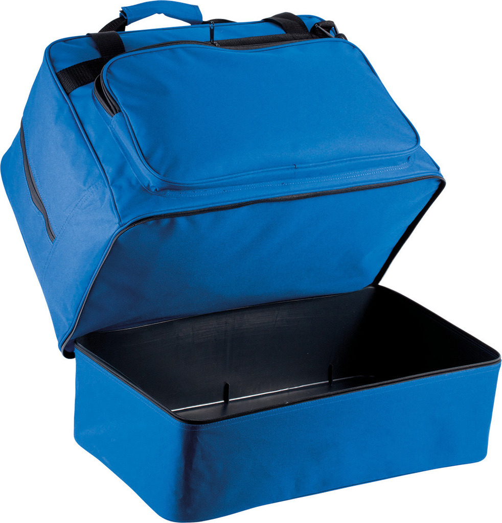 Saco de desporto em poliéster 600D, 90 litros. Base rígida amovível em polipropileno com pés em plástico. Bolso na zona frontal com fecho para facilitar a personalização, porta-cartões para colocar identificação, alça de ombro amovível e reforçada com silicone. Base rígida fornecida com o saco.