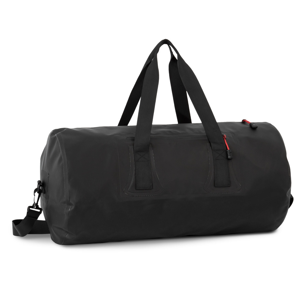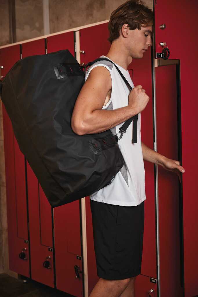 100% PVC. Saco de desporto grande completamente impermeável em policloreto de vinilo. O bolso frontal é 100% impermeável e a alça a tiracolo é amovÃvel. Perfeito para a prática de desportos aquáticos, para um passeio à beira-mar ou de moto.