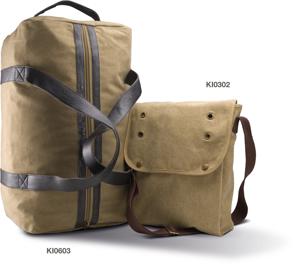 Saco de viagem em lona com pegas de polivinil (PVC), aspecto vintage, fivelas e ilhós em acabamento de cobre velho, bolso exterior.