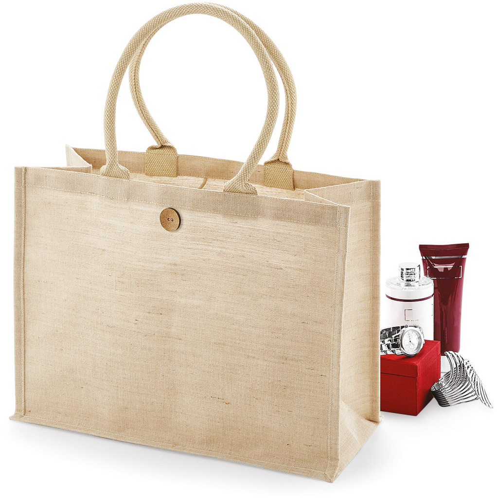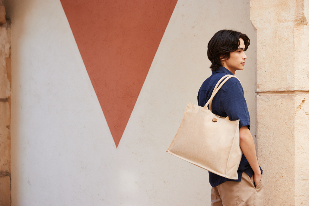 Juco laminado (72% juta, 28% algodão). Mistura refinada de juta e algodão para facilitar a personalização. Pegas/Alças em algodão.