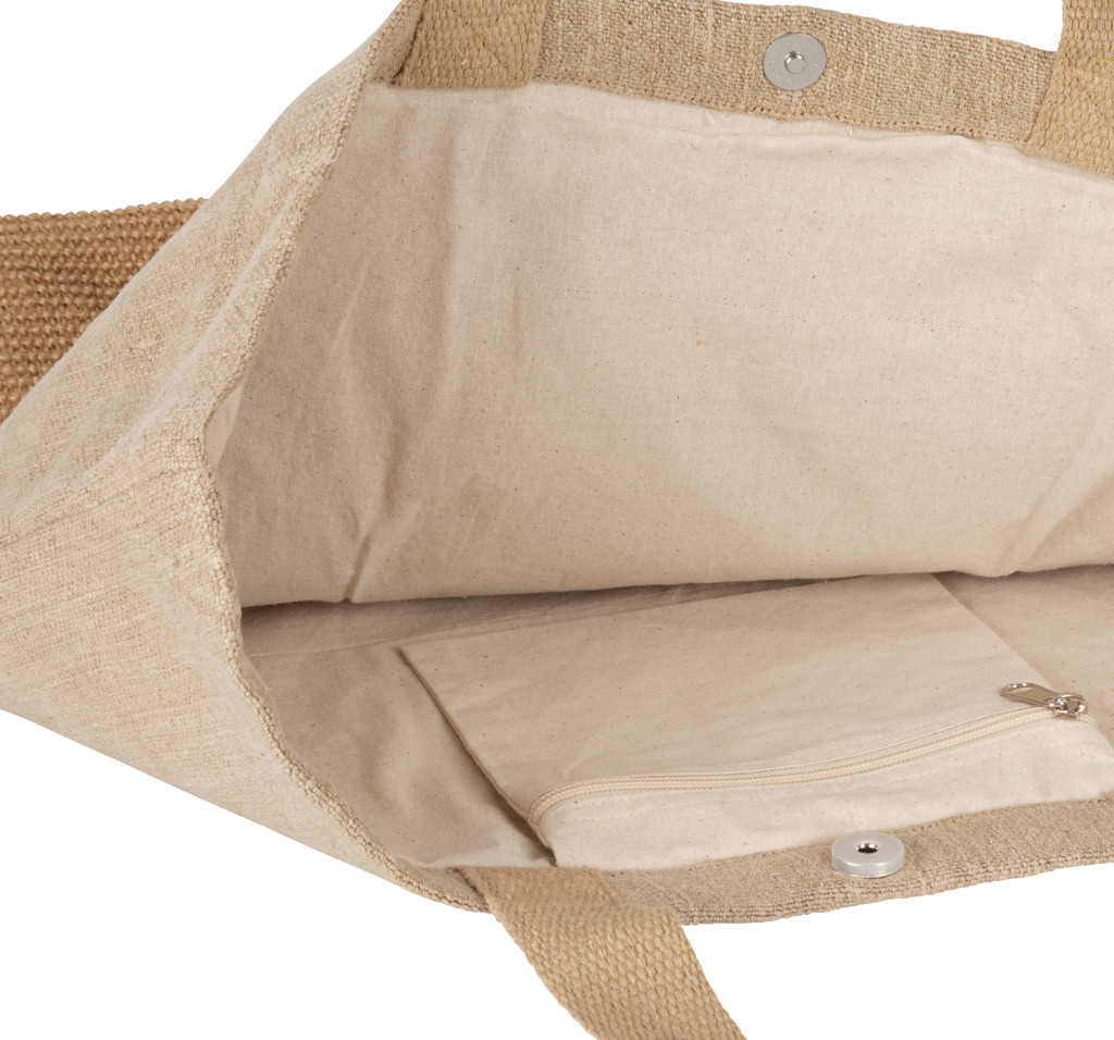 Saco em juta, entrançado como um tecido para ser leve e suave ao toque. Fundo em juta tricotada.