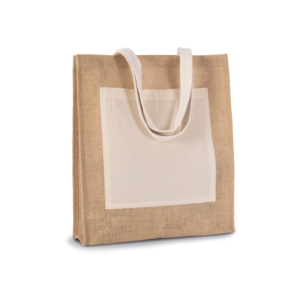 Saco em juta com alça de algodão, bolso frontal em algodão.