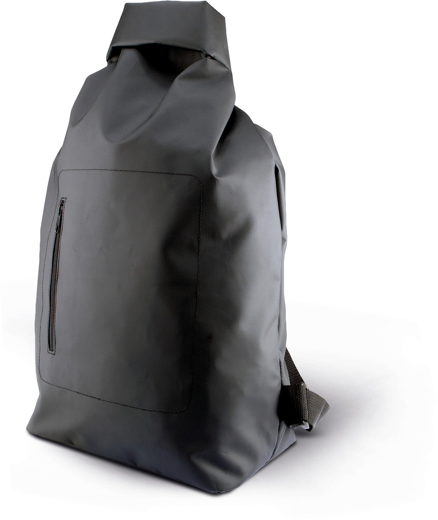 Saco marinheiro em lona tarpaulin polivinil (PVC), no topo fecha com fivela, alças ajustáveis, bolso frontal com fecho impermeável.